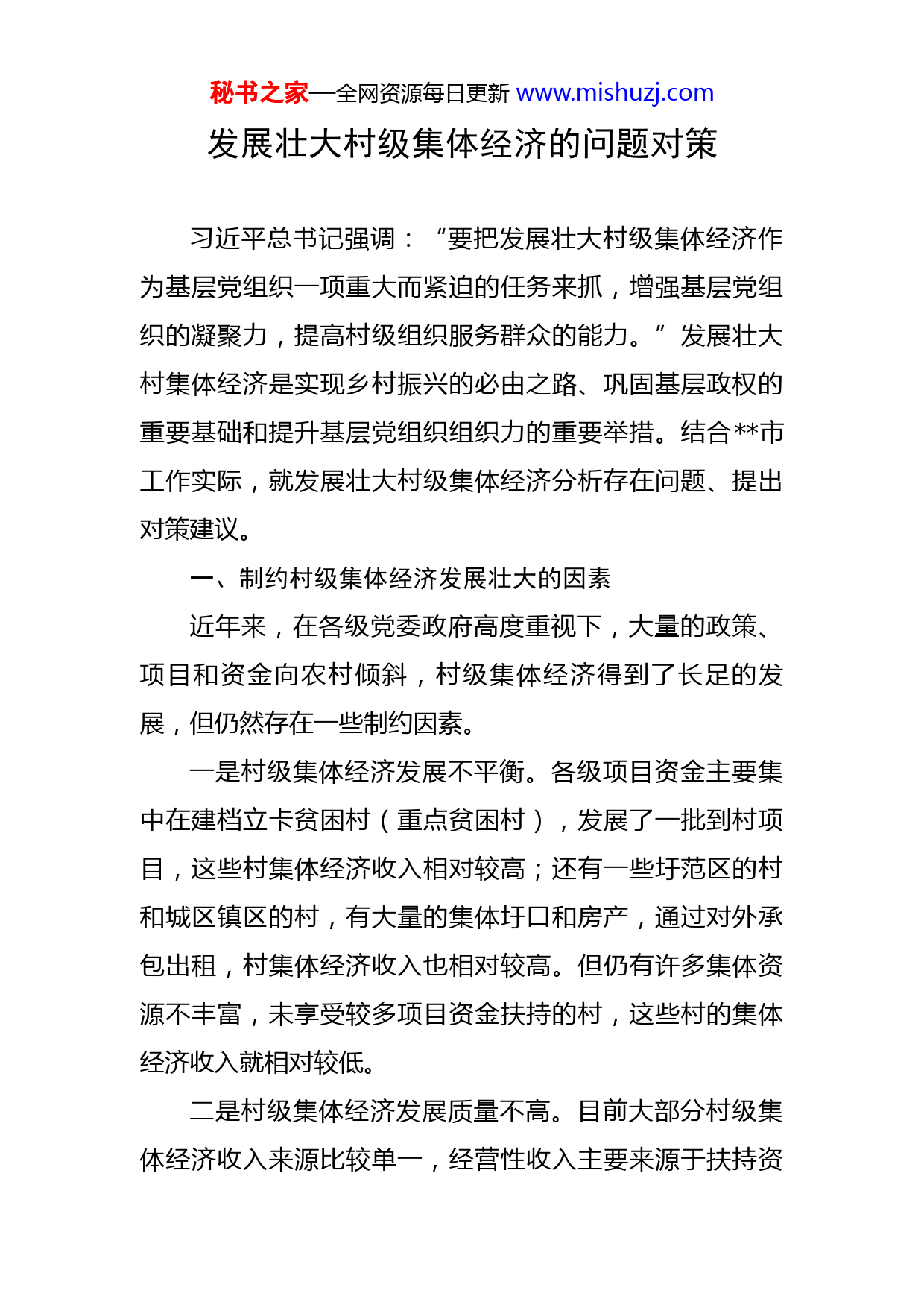 秘书之家—全网资源每日更新www.mishuzj.com发展壮大村级集体经济的问题对策习近平总书记强调:“要把发展壮大村级集体经济作为基层党组织一项重大而紧迫的任务来抓,增强基层党组织的凝聚力,提高村级组织服务群众的能力。”发展壮大村集体经济是实现乡村振兴的必由之路、巩固基层政权的重要基础和提升基层党组织组织力的重要举措。结合市工作实际,就发展壮大村级集体经济分析存在问题、提出对策建议。一、制约村级集体经济发展壮大的因素近年来,在各级党委政府高度重视下,大量的政策、项目和资金向农村倾斜,村级集体经济得到了长足的发展,但仍然存在一些制约因素。一是村级集体经济发展不平衡。各级项目资金主要集中在建档立卡贫困村(重点贫困村),发展了一批到村项目,这些村集体经济收入相对较高;还有一些圩范区的村和城区镇区的村,有大量的集体圩口和房产,通过对外承包出租,村集体经济收入也相对较高。但仍有许多集体资源不丰富,未享受较多项目资金扶持的村,这些村的集体经济收入就相对较低。二是村级集体经济发展质量不高。目前大部分村级集体经济收入来源比较单一,经营性收入主要来源于扶持资秘书之家—全网资源每日更新www.mishuzj.com金的入股分红、集体资产的出租承包金、田地的服务管理费。这些收入安全性相对较高,但收入较少,持续增长性不强,没有充分发挥出村级集体资源资产的潜力和效益。三是村级懂经营的人才缺乏。目前,各村均成立了村级集体经济组织,负责经营管理村级集体资产。但村级集体经济组织的成员主体还是村“两委”成员,这些人中,真正有时间精力,有能力水平去管理经营村级集体经济,使村级集体资源资产保值升值的少之又少。二、发展壮大村级集体经济的几点建议发展壮大村级集体经济需要政策、项目和资金的扶持,需要体制机制的创新。对发展壮大村级集体经济的几点建议:一是强化基层党组织的引领作用。坚持基层党组织特别是村级党组织在发展壮大村级集体经济中的主导作用,要充分发挥广大党员的聪明才智,建言献策,群策群力;要将发展壮大村级集体经济作为对村级党组织负责人考核的硬指标,奖优罚劣,让有为者有位。二是加强人才的培养引进。加强管理经营人才的培养引进,让专业的人做专业的事,要吸收熟悉经济懂经营管理的人加入村级集体经济组织,并加大对他们的教育培训,提升他们的经营管理水平;要探索建立“职业经理人”制度,聘请专业的企业或经理人员管理村级集体资源秘书之家—全网资源每日更新www.mishuzj.com资产,经理人员的待遇同资源资产增值收益挂钩,充分调动经理人员的积极性。三是鼓励村级之间抱团发展。每个村集体资源资产各有特点,有的村通过土地增减挂或重大工程的实施,有千万级别的资金;有的村有丰富的待开发的自然资源。市镇两级党委政府应鼓励村级之间抱团发展,让有资源优势的村集体和有资金优势的村集体优势互补,强强联合,谋划实施发展项目;让资源资产优势不明显的村相互联合,积少成多,集中力量办大事,发挥规模优势。四是加大对村级集体资金倾斜力度。村级集体经济的发展壮大离不开资金的支持。各级政府要继续加大对村级集体经济扶持发展资金的投入力度,进一步扩大覆盖面;要积极开展“信用村”的创建,协调银行对那些信用良好的村集体提供无抵押的低息或无息贷款,解决村集体发展经济的资金需求。五是探索资源变资产的新路径。碳达峰,碳中和是近年来的热点,如何利用碳达峰碳中和来发展壮大村级集体经济,发达地区已经进行了尝试。江浙部分地区的林场已经开始通过碳排放权交易所进行交易,将林场吸收的碳指标卖给需要的企业,真正将绿水青山变成了金山银山。桐城市农村特别是山区农村绿化率非常高,树木每年吸收的碳指标很多,各级党委政府要提前谋划,成立专班,认真秘书之家—全网资源每日更新www.mishuzj.com研究碳交易的具体方法和市场运作情况,拓宽村级集体经济的收入来源。