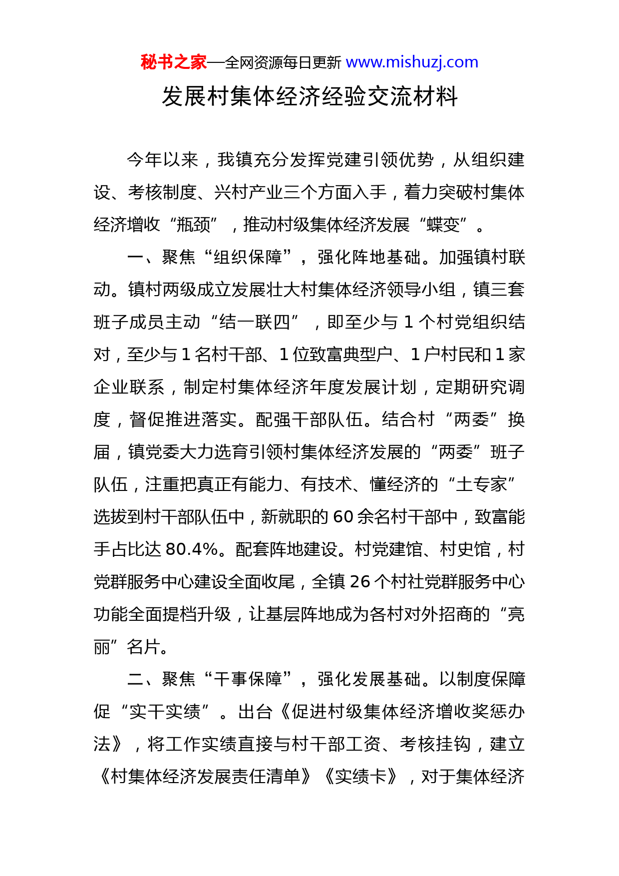 秘书之家—全网资源每日更新www.mishuzj.com发展村集体经济经验交流材料今年以来,我镇充分发挥党建引领优势,从组织建设、考核制度、兴村产业三个方面入手,着力突破村集体经济增收“瓶颈”,推动村级集体经济发展“蝶变”。一、聚焦“组织保障”,强化阵地基础。加强镇村联动。镇村两级成立发展壮大村集体经济领导小组,镇三套班子成员主动“结一联四”,即至少与1个村党组织结对,至少与1名村干部、1位致富典型户、1户村民和1家企业联系,制定村集体经济年度发展计划,定期研究调度,督促推进落实。配强干部队伍。结合村“两委”换届,镇党委大力选育引领村集体经济发展的“两委”班子队伍,注重把真正有能力、有技术、懂经济的“土专家”选拔到村干部队伍中,新就职的60余名村干部中,致富能手占比达80.4%。配套阵地建设。村党建馆、村史馆,村党群服务中心建设全面收尾,全镇26个村社党群服务中心功能全面提档升级,让基层阵地成为各村对外招商的“亮丽”名片。二、聚焦“干事保障”,强化发展基础。以制度保障促“实干实绩”。出台《促进村级集体经济增收奖惩办法》,将工作实绩直接与村干部工资、考核挂钩,建立《村集体经济发展责任清单》《实绩卡》,对于集体经济秘书之家—全网资源每日更新www.mishuzj.com增幅连续2年位列后3位的村,给予村“两委”班子成员批评教育、诫勉谈话或组织调整。以政治激励促“敢为愿为”。建立健全村干部干事创业奖励机制,对在干事担当中表现突出的村干部,给予适度奖励。2019年以来,连续三年表彰优秀村干部、优秀共产党员、优秀党务工作者等,其中“两委”成员累计表彰达63人次。以选育结合促“善作善为”。深入开展新集镇“干部素质提升年”行动,举办新集发展大家谈、书记讲堂、农村“领头雁”培训班,加强农村基层干部对富民兴村、发展村集体经济等方面的知识技能培训,促进村干部综合素质提升。抽调10余名村干部到镇招商办、信访办、督查办等急难险重岗位锻炼培养,培养一批充满潜力、堪当重任的后备村干部。三、聚焦“产业保障”,强化增收基础。“集体领办”驱动。立足挖掘土地潜能,通过村集体土地流转、合作经营等多种形式推进土地规模经营,增加村集体经营性收入,做好集体经济“无中生有”文章。2021年全镇共新增土地流转1.2万亩,新培育市级以上示范家庭农场5家,县级以上示范家庭农场29家。“招商引项”驱动。深入开展“招大引强突破年”行动,创新推动产业招商、驻点招商、以商招商、委托招商,大力引进培育一批潜力大、带动就业能力强的村级产业项目。目前,镇产权交易额达2亿元,去年一年产权交易九次获评省级月度之星。秘书之家—全网资源每日更新www.mishuzj.com“结对共建”驱动。持续落实“强村带弱村”行动方案,筛选出周庄村、孙湾村等10余村,在班子建设、种养殖技术、代购代销、农机械作业等方面,开展结对共建,让弱村变强、让强村更强,汇聚发展合力。