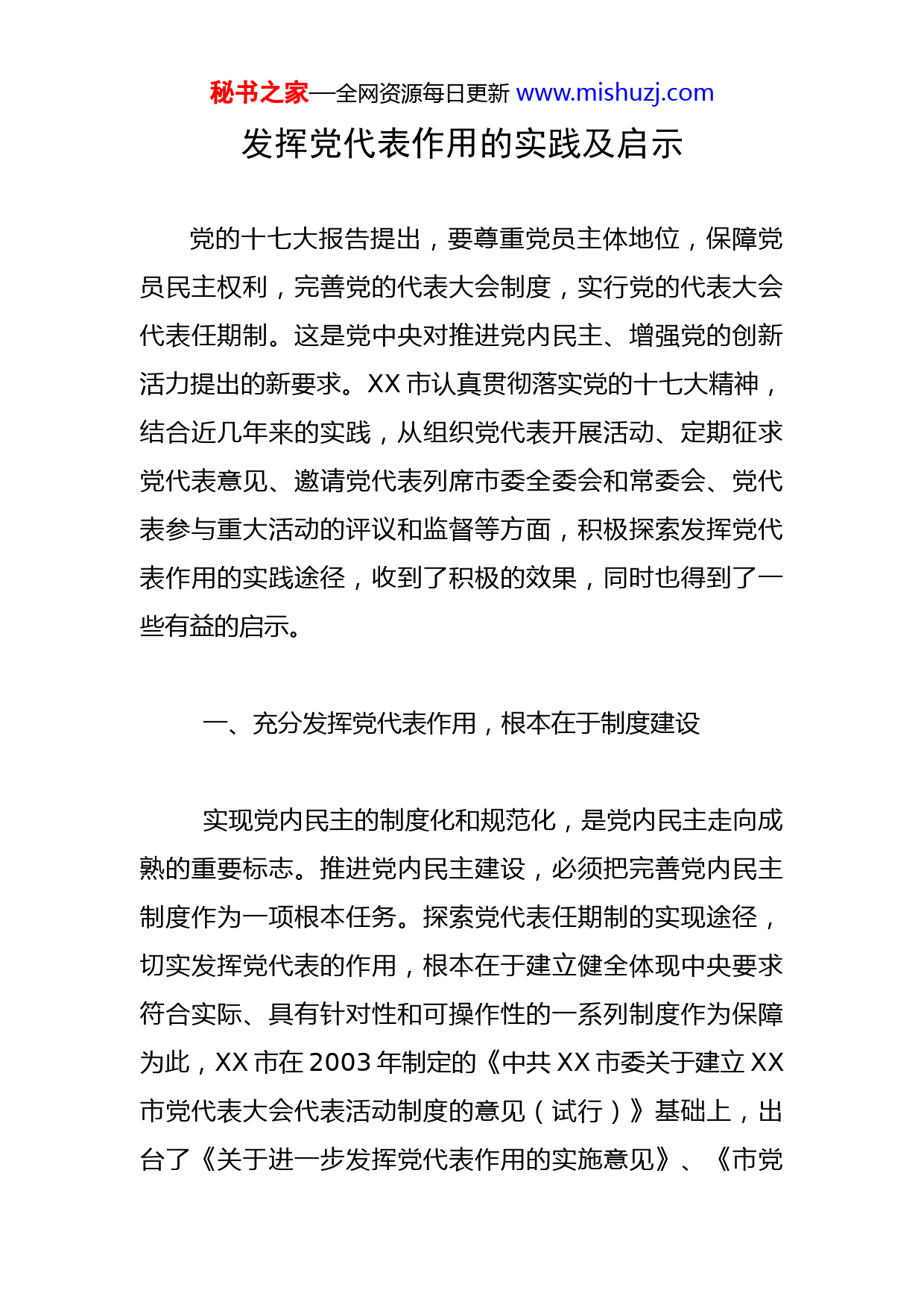 秘书之家—全网资源每日更新www.mishuzj.com发挥党代表作用的实践及启示党的十七大报告提出,要尊重党员主体地位,保障党员民主权利,完善党的代表大会制度,实行党的代表大会代表任期制。这是党中央对推进党内民主、增强党的创新活力提出的新要求。XX市认真贯彻落实党的十七大精神,结合近几年来的实践,从组织党代表开展活动、定期征求党代表意见、邀请党代表列席市委全委会和常委会、党代表参与重大活动的评议和监督等方面,积极探索发挥党代表作用的实践途径,收到了积极的效果,同时也得到了一些有益的启示。一、充分发挥党代表作用,根本在于制度建设实现党内民主的制度化和规范化,是党内民主走向成熟的重要标志。推进党内民主建设,必须把完善党内民主制度作为一项根本任务。探索党代表任期制的实现途径,切实发挥党代表的作用,根本在于建立健全体现中央要求符合实际、具有针对性和可操作性的一系列制度作为保障为此,XX市在2003年制定的《中共XX市委关于建立XX市党代表大会代表活动制度的意见(试行)》基础上,出台了《关于进一步发挥党代表作用的实施意见》、《市党秘书之家—全网资源每日更新www.mishuzj.com代表列席市委全委会、市委常委会实施细则》和《关于做好XX市党的代表大会代表工作建议办理工作的通知》等文件,建立了市党代表向市委提出意见建议的制度,党代表列席市委全委会和市委常委会的制度,市委重大决策、重要文件出台前和重要人事安排事前征求党代表意见建议的制度,以及市党代表参与干部选拔和重大工程监督制度。这一系列制度规定,明确了党代表发挥作用的途径,包括列席市委全委会和常委会、开展经常性征求党代表意见、参与重大活动的评议和监督工作、向党代表通报重大事项、不定期组织党代表调研或视察活动等。明确了党代表活动的内容,主要有认真学习、宣传和贯彻党的基本理论、基本路线、基本纲领,带头执行党的决定和市党代会的决策部署,在本职岗位上发挥先锋模范作用;收集本选举单位广大党员群众的意见和要求,及时向市委或有关党组织反映;在全市性、区域性的重大事项决策和实施过程中,做好对党员群众的宣传解释工作,保证重大事项能够科学决策、顺利实施。明确了党代表意见建议处理的要求规定对党代表提出的意见建议,由市委办公厅、市委组织部等单位共同审理、受理和督办;各承办单位接到交办的建议后,要尽快提出办理办法和组织实施,并及时与党代表联系,征询对办理情况的意见。这一系列举措,从根本秘书之家—全网资源每日更新www.mishuzj.com上保障了党代表作用的发挥。二、充分发挥党代表作用,主要在于落实党员的民主权利党章和党员权利保障条例明确规定了党员的民主参与、民主选举、民主决策、民主监督等权利。发展党内民主、充分发挥党代表作用,必须把保障党员民主权利作为基础基于此,XX市在落实党代表行使党员民主权利方面进行了积极的探索。一是及时通报情况。市委每次召开全委会,要向党代表通报工作情况。平时,经常通过会议、文件等形式,向党代表及时通报重大事项的决策和实施情况,使党代表能够充分了解市委的决策意图、工作计划和工作重点,为党代表发挥作用创造条件。二是邀请列席市委全委会和常委会。市委召开全委会和常委会时,根据议题需要邀请基层党代表列席,并明确所有的基层一线党代表在任期内至少列席一次市委全委会或市委常委会。市委召开第24次常委会时,邀请了6名来自街道(乡镇)、社区(村)和卫生服务等一线的党代表秘书之家—全网资源每日更新www.mishuzj.com列席,并参与了市委十届三次全会报告和市委《关于认真贯彻党的十七大精神,进一步破解“七难”问题、建设“生活品质之城”的决定》的讨论。市委十届三次全会召开期间,邀请了来自农村、社区、企业、学校、科研院所乡镇街道等生产一线的36名基层党代表列席了会议,并围绕全会报告和相关决定进行分组讨论,畅所欲言、建言献策。三是组织调研和视察等活动。围绕市党代会提出的共建共享“生活品质之城”的目标要求和广大群众关心关注的热点、难点问题,市委组织党代表开展视察或专题调研等活动。近年来,XX市组织市党代表多次参加西湖综合保护工程、“背街小巷”改善工程、运河综合保护工程、灵隐景区改造工程、西溪湿地保护工程等重大建设项目视察活动,增强了党代表的荣誉感和责任感。四是参加市直单位的综合考评、重大工程和干部选拔任用的监督。在每年开展的市直单位综合考评中,每个党代表都有一张选票,对市直单位进行评价打分。市委和所在区、县(市)或选举单位制定和完成年度工作目标任务加强领导班子建设、基层组织建设和落实党风廉政责任制等方面的情况,都邀请党代表进行评议和监督。在XX年秘书之家—全网资源每日更新www.mishuzj.comXX市第七次联合公开选拔领导干部工作中,邀请了市党代表全程参与,对公选的报名、笔试、面试、考察等各个环节实行监督。参与监督工作的一位市党代表说:“邀请我们党代表参与公选的监督,体现了市委对发挥党代表作用的重视,可见我们党内的民主气氛越来越浓,党委、政府接受监督的意识越来越强,各项工作越来越公开、透明。”三、充分发挥党代表作用,关键在于激