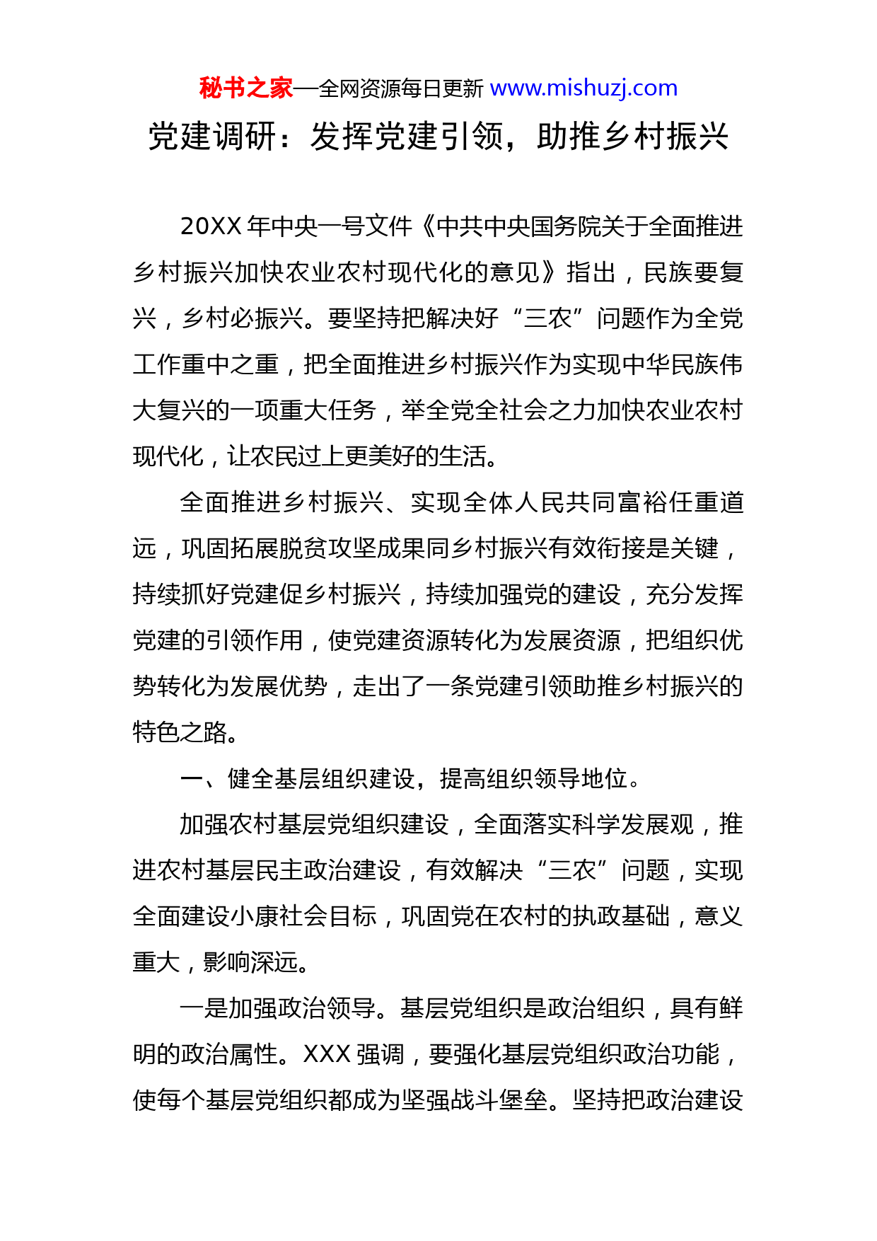 秘书之家—全网资源每日更新www.mishuzj.com党建调研:发挥党建引领,助推乡村振兴20XX年中央一号文件《中共中央国务院关于全面推进乡村振兴加快农业农村现代化的意见》指出,民族要复兴,乡村必振兴。要坚持把解决好“三农”问题作为全党工作重中之重,把全面推进乡村振兴作为实现中华民族伟大复兴的一项重大任务,举全党全社会之力加快农业农村现代化,让农民过上更美好的生活。全面推进乡村振兴、实现全体人民共同富裕任重道远,巩固拓展脱贫攻坚成果同乡村振兴有效衔接是关键,持续抓好党建促乡村振兴,持续加强党的建设,充分发挥党建的引领作用,使党建资源转化为发展资源,把组织优势转化为发展优势,走出了一条党建引领助推乡村振兴的特色之路。一、健全基层组织建设,提高组织领导地位。加强农村基层党组织建设,全面落实科学发展观,推进农村基层民主政治建设,有效解决“三农”问题,实现全面建设小康社会目标,巩固党在农村的执政基础,意义重大,影响深远。一是加强政治领导。基层党组织是政治组织,具有鲜明的政治属性。XXX强调,要强化基层党组织政治功能,使每个基层党组织都成为坚强战斗堡垒。坚持把政治建设秘书之家—全网资源每日更新www.mishuzj.com摆在首位,深入开展党史学习教育,以学习贯彻XXX新时代中国特色社会主义思想为根本任务,持续强化干部理论武装、党员经常性学习培训,推动基层党组织和广大党员干部旗帜鲜明讲政治,增强“四个意识”,坚定“四个自信”,做到“两个维护”,教育引导基层党员干部守初心、担使命,找差距、抓落实,坚决贯彻落实中央、省市县委决策部署,在加快高质量发展、推动惠民政策落地、维护和谐稳定中发挥基层党组织的领导作用和战斗堡垒作用。要加强党组织对各领域社会基层组织的政治领导,善于引领各类组织坚持在党的领导和中国特色社会主义旗帜下行动,善于把党组织意图变成各类组织参与基层治理的有效举措,善于引导各类组织做好群众工作,把党员、群众动员起来、组织起来,确保党的路线方针政策和决策部署在基层落地生根。二是创新组织体系。严密的组织体系,是坚持和落实党的领导、发挥基层党组织战斗堡垒作用和党员先锋模范作用的坚实基础。根据基层党组织实际情况,适时将党支部升格为党总支,并以地域相邻的村小组为基础,组建党支部。要严肃党内政治生活,落实“三会一课”、组织生活会、民主评议党员等基本制度,增强组织生活的政治性、时代性、原则性、战斗性。三是团结服务群众。人民是大地母亲,是我们党的力秘书之家—全网资源每日更新www.mishuzj.com量源泉。组织群众、宣传群众、凝聚群众、服务群众,是我们党不断从胜利走向胜利的重要法宝。基层党组织只有坚持党的根本宗旨不动摇,深深根植于广大人民群众之中,才能获得强大的凝聚力和旺盛的组织力。要落实以人民为中心的发展思想。把改善人民生活、增进人民福祉作为一切工作的出发点和落脚点,根据社会主要矛盾转化的新特点,着力补齐民生社会事业短板,多为群众办实事、解难事、做好事,不断满足人民日益增长的美好生活需要,不断让人民群众有更多的获得感、幸福感和安全感。二、加强基层队伍建设,提升基层队伍水平。“村民富不富,关键看支部;村子强不强,要看领头羊”,建强农村党组织,还必须有能战斗的班子和冲在前的带头人。一是充实头雁队伍。要切实发挥党员队伍的先锋模范作用,积极选优配强基层党组织带头人、驻村第一书记和工作队,将党的政治优势、组织优势转化为助推乡村振兴的红色动能。要突出政治标准,选优配强基层党组织书记,引导他们自觉加强党性锻炼,增强政治觉悟,提高政治能力。以村级换届为契机,大力实施“头雁工程”,把能人中的积极分子培养成党员、把党员培养成致富能人、把能人党员培养成村干部,着重从优秀“两委”干部及工作人员、本地优秀大学生、企业高级管理人员中物色书记秘书之家—全网资源每日更新www.mishuzj.com人选,多渠道优化充实“头雁”队伍。二是提升履职能力。要强化示范带动,坚持边实践、边探索、边总结,认真推广一批致富示范村的先进经验、后进赶超村的有效做法、乡村振兴典型村的成功事例,进一步解放思想、对标找差,汇聚起推进乡村振兴的强大势能。组织后进村党组织书记到先进村挂职锻炼,学习先进经验做法,提高带领群众致富能力,加强对基层党组织村“两委”进行全员培训,突出宗旨教育、群众路线教育,提高做好群众工作的能力。三是强化后续保障。坚持重心下移、资源下沉,推动人力、物力、财力向基层一线倾斜。健全以财政投入为主的经费保障制度,结合实际改革完善基本报酬、养老保险、离任补贴政策,按规定足额保障基层党组织办公运转经费、开展活动经费、服务群众专项经费等,形成稳定的长效机制。三、发挥党员示范带头作用,增强党组织的战斗堡垒作用。普通党员是基层组织的细胞,细胞有生机,肌体才有活力。特别是在农村地区,普通党员先锋模范作用强不强、群众是否认可是评价基层党组织建设成效的重要标准。各个行业领域的党员要对自己的行为提出明确的要求,不仅要思考做好本职工作,更要思考如何发挥带头示秘书之家—全网资源每日更新www.mishuzj.com范作用,通过努