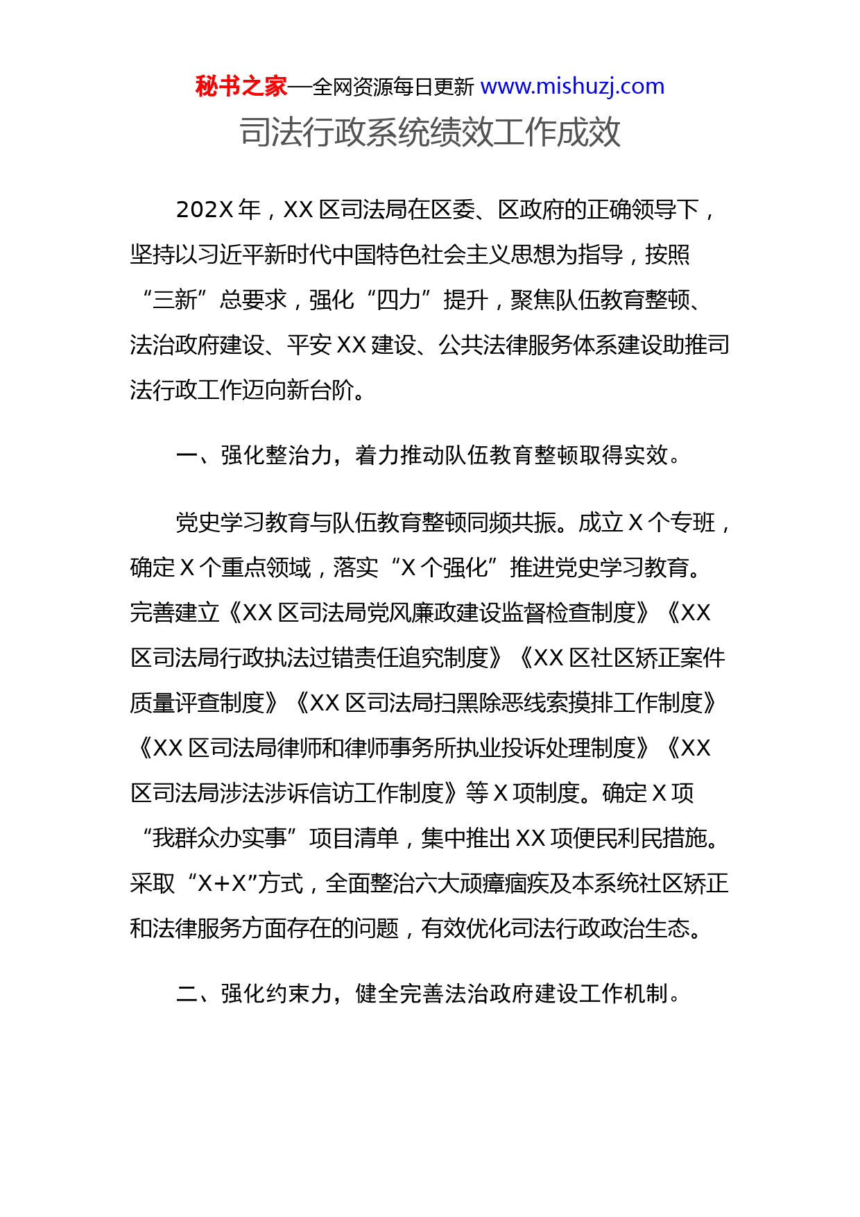 秘书之家—全网资源每日更新www.mishuzj.com司法行政系统绩效工作成效202X年,XX区司法局在区委、区政府的正确领导下,坚持以习近平新时代中国特色社会主义思想为指导,按照“三新”总要求,强化“四力”提升,聚焦队伍教育整顿、法治政府建设、平安XX建设、公共法律服务体系建设助推司法行政工作迈向新台阶。一、强化整治力,着力推动队伍教育整顿取得实效。党史学习教育与队伍教育整顿同频共振。成立X个专班,确定X个重点领域,落实“X个强化”推进党史学习教育。完善建立《XX区司法局党风廉政建设监督检查制度》《XX区司法局行政执法过错责任追究制度》《XX区社区矫正案件质量评查制度》《XX区司法局扫黑除恶线索摸排工作制度》《XX区司法局律师和律师事务所执业投诉处理制度》《XX区司法局涉法涉诉信访工作制度》等X项制度。确定X项“我群众办实事”项目清单,集中推出XX项便民利民措施。采取“X+X”方式,全面整治六大顽瘴痼疾及本系统社区矫正和法律服务方面存在的问题,有效优化司法行政政治生态。二、强化约束力,健全完善法治政府建设工作机制。秘书之家—全网资源每日更新www.mishuzj.com(一)履行参谋助手职责。严格执行规范性文件、重大行政决策合法性审查。今年来,共审查规范性文件X份,审查重要文件、各类合同等法律文件并出具法律审查意见XXX份,审查三大纠纷确权案件并出具法律审查意见XX份。(二)规范行政执法行为。深化推进行政执法“三项制度”落实落地,实现规范行政执法公示(公开)率、准确率双提升,按程序执行重大执法决定法制审核率XXX%。今年来,共开展执法督查巡查XX次,举办行政执法“三项制度”学习培训X期,培训执法人员XXX人,XXX人完成行政执法换证补证,实现“执证上岗,亮证执法”。(三)依法化解行政争议。充分发挥行政复议化解行政争议主渠道作用,完善行政复议办案程序,推进行政诉讼答辩出庭工作。今年来,办理行政应诉案件共XX件,收到复议申请XX件,其中立案受理XX件,审结XX件。审结案件中,维持X件,撤销XX件,终止XX件。(四)行政复议体制改革成效显著。实现集中统一办理行政复议案件,成立行政复议三级办案组织(行政复议委员会、行政复议案件审理办公会、行政复议案件审理评议组),建立行政复议咨询委员会,建立行政复议员制度,任命XX区秘书之家—全网资源每日更新www.mishuzj.com人民政府行政复议员X人,并颁发行政复议员资格证和工作证,实现执证办案。设立X个行政复议服务点,打通复议为民“最后一公里”。XXXX年X月集中办理案件以来,累计收到并处理行政复议申请XXX件,是改革前XXXX年X月至XXXX年X月五年间总案件数XX件的X.X倍。有效发挥实质性化解行政争议主渠道作用。三、强化管控力,助力保障平安XX建设。(一)聚焦全区重点人群领域。加强基层治理体系和治理能力现代化建设,紧扣“四化”目标,发挥智慧矫正中心资源优势,加强社区矫正、安置帮教工作,有效维护本地安全稳定。今年来累计接收社区矫正对象XXXX人,累计解除XXXX人,目前在册社区矫正对象XXX人,接受委托调查评估XX件,未出现脱管、漏管现象。衔接刑满释放人员XXX人,重点帮教对象XX人,衔接率XXX%。(二)聚焦矛盾纠纷化解领域。坚持和发展新时代“枫桥经验”,完善矛盾纠纷多元化解机制,夯实区、乡镇(街道)两级矛盾纠纷多元解纷平台和行业性专业性调解组织建设,助力推动XX区市域治理现代化试点工作。依托XX区律师事务所设立律师调解工作室XX个,确定XX名律师为律师调解员。XXXX年X月X日至XX日出动警力XXX人次下沉秘书之家—全网资源每日更新www.mishuzj.com各乡镇村开展防范个人极端案事件风险隐患“大排查大走访”专项行动,排查行政村XX个,走访XXXX户,发现安全隐患问题XXX个。今年以来,调解各类矛盾纠纷XXX件,成功化解XXX件,调解率XXX%,调解成功率XXX%。四、强化推动力,纵深推进公共法律服务体系建设。(一)专业优质服务“解民忧”。今年来两级公共法律服务中心共受理群众咨询XXX件,代写法律文书XX件,协办见证XX件。XX区律师共办理各类法律服务案件XXX件,为群众避免和挽回经济损失XXXX.X万元,咨询和代写法律文书XXX份。法律援助中心共办理案件XXX件,其中涉及农民工欠薪案件XXX件,接受群众服务来电来访咨询XXXX余人次,为群众挽回损失XXX余万元。开展各类法治宣传活动XX次,使用LED显示屏车宣传X次,展出板报XX版,张挂横幅XX余条,分发宣传单XXXXX余份,普法环保袋XXXX余个、法律知识问答奖品XXXX余份,接待群众法律咨询XXX余人次,受教育人数达XXXXX余人次。(二)智慧矩阵服务“提速度”。深化“互联网+公共法律服务”建设,实现实体、热线、网络“三大”平台深度融合,统筹平台运营管理,以网络平台为统领,发挥信息化手段作用。建立XX区、乡镇(街道)、村(社区)“一站秘书之家—全网资源每日更新www.mishuzj.com式”“窗口化”综合性公共法律服务平台,实现各类公共法律服务项目集中进驻,完成公共法律服务中心自助服务终端智能设备配备比例XXX%,乡镇(街道)级智能设备配备比例XX%,实现“XXXXX"与“XXXXX"热线对接,完善热线服务功能,提供全天候热线服务,实现信息互联互通。