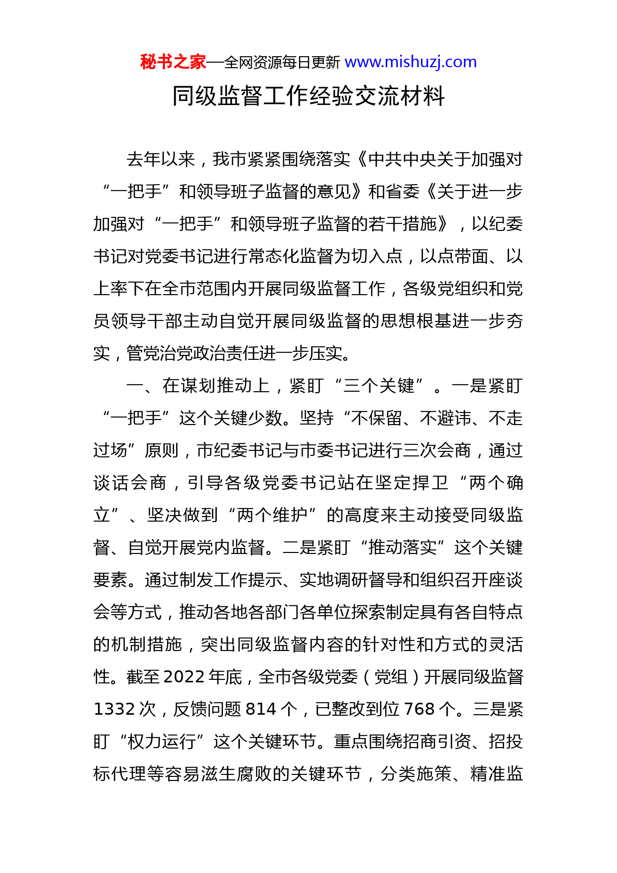 秘书之家—全网资源每日更新www.mishuzj.com同级监督工作经验交流材料去年以来,我市紧紧围绕落实《中共中央关于加强对“一把手”和领导班子监督的意见》和省委《关于进一步加强对“一把手”和领导班子监督的若干措施》,以纪委书记对党委书记进行常态化监督为切入点,以点带面、以上率下在全市范围内开展同级监督工作,各级党组织和党员领导干部主动自觉开展同级监督的思想根基进一步夯实,管党治党政治责任进一步压实。一、在谋划推动上,紧盯“三个关键”。一是紧盯“一把手”这个关键少数。坚持“不保留、不避讳、不走过场”原则,市纪委书记与市委书记进行三次会商,通过谈话会商,引导各级党委书记站在坚定捍卫“两个确立”、坚决做到“两个维护”的高度来主动接受同级监督、自觉开展党内监督。二是紧盯“推动落实”这个关键要素。通过制发工作提示、实地调研督导和组织召开座谈会等方式,推动各地各部门各单位探索制定具有各自特点的机制措施,突出同级监督内容的针对性和方式的灵活性。截至2022年底,全市各级党委(党组)开展同级监督1332次,反馈问题814个,已整改到位768个。三是紧盯“权力运行”这个关键环节。重点围绕招商引资、招投标代理等容易滋生腐败的关键环节,分类施策、精准监秘书之家—全网资源每日更新www.mishuzj.com督,压缩权力设租寻租空间。比如,对招商引资过程中特别是代建厂房存在的经济风险和廉政风险,严格控制代建厂房的类别及数量,明确优惠政策兑换条件,规定企业投产后应回购不动产并支付本金及利息。二、在组织实施上,抓实“三个强化”。一是强化精准定位。立足“监督的再监督”职责定位,把握好纪委监委协助职责和监督专责的关系,主动为党委开展同级监督提供有效载体、当好参谋助手,既不缺位,也不包办代替、越位错位。二是强化协同配合。深化与巡察工作协调联动,同步共享九届市委第一、二轮被巡察单位14名“一把手”有关的46个问题,单独围绕区(市)党委(党组)“一把手”形成巡察报告12篇。三是强化点面结合。对照肖毅案、龚建华案整改要求,推进问题整改由“点”向“面”全覆盖。比如,针对群众反映强烈的“办证难”和安置房交付慢问题,通过全市系统梳理、举一反三,监督推动中心城区1664套房屋达到办理不动产登记条件,信江新区3175套安置房加快交付。三、在提升质效上,做到“三个坚持”。一是坚持真抓实督。市委书记全面认领三次会商反馈的34个问题,坚决扛起整改主体责任,亲自审定问题整改工作方案,明确138项整改措施,市委先后向16名市级分管领导发出工作提示函29份,要求党政领导干部切实履行“一岗双责”。秘书之家—全网资源每日更新www.mishuzj.com二是坚持动真碰硬。对同级监督反馈的问题,市委督查室定期将整改落实情况向市委主要领导报告,对整改完成的实行“三方销号”,各责任单位呈报市级分管领导审批后,报市委审核并抄送市纪委。三是坚持源头治理。按照先治标后治本方式,坚持从源头上促进治理。比如,围绕贯彻落实中央八项规定及其实施细则精神,支持余江区建立全区公务用餐“一卡通”系统和公务接待月报备制度。