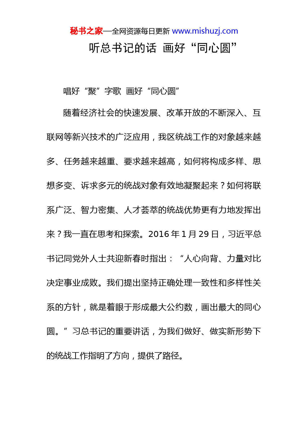 秘书之家—全网资源每日更新www.mishuzj.com听总书记的话画好“同心圆”唱好“聚”字歌画好“同心圆”随着经济社会的快速发展、改革开放的不断深入、互联网等新兴技术的广泛应用,我区统战工作的对象越来越多、任务越来越重、要求越来越高,如何将构成多样、思想多变、诉求多元的统战对象有效地凝聚起来?如何将联系广泛、智力密集、人才荟萃的统战优势更有力地发挥出来?我一直在思考和探索。2016年1月29日,习近平总书记同党外人士共迎新春时指出:“人心向背、力量对比决定事业成败。我们提出坚持正确处理一致性和多样性关系的方针,就是着眼于形成最大公约数,画出最大的同心圆。”习总书记的重要讲话,为我们做好、做实新形势下的统战工作指明了方向,提供了路径。秘书之家—全网资源每日更新www.mishuzj.com始终将凝聚思想共识作为第一前提思想是行动的先导,共识是团结的基础。没有思想共识,联合、团结就无从谈起,同心圆也就无法画好。工作中,我们将牢牢把握“大团结、大联合”的主题,坚持政治引领、教育引导,组织统战成员深入学习习总书记系列重要讲话精神、中央和省市区重要会议精神,开展好坚持和发展中国特色社会主义学习实践活动、非公经济人士理想信念教育实践活动,引导广大统战成员坚定“四个自信”、增强“四个意识”,守住底线、固好圆心。同时,坚持求同存异、聚同化异,以新阶层、新人群、新生代为重点,密切关注涉及统一战线的敏感复杂问题,及时掌握统战成员的思想政治动态,听取他们的意见,关心他们的诉求,照顾他们的利益,主动协调关系,妥善处理分歧,及时化解矛盾,努力将全体统战成员的思想和行动统一到“两聚一高”的姜堰实践上,将智慧和力量汇聚到“强富秘书之家—全网资源每日更新www.mishuzj.com美高”新姜堰建设中。始终将凝聚发展力量作为第一要务围绕中心、服务大局,是统战工作的应有之义,也是统一战线的生命力所在。围绕中心就是要服务好发展,服务大局就是要为“更富含金量的崛起振兴”凝聚更大力量、更多智慧。我们将紧扣“两聚一高”主题,紧盯热点难点问题,围绕供给侧结构性改革、转型创新、城乡发展、富民创业等课题,组织民主党派、无党派人士有重点地考察调研,高质量地议政建言,并就区委、区政府重大改革举措、重要政策执行情况等开展民主监督,为区委、区政府科学施政贡献智慧力量。坚持两手齐抓、内外并举,建立完善统战、工商联与政府相关部门的联系制度,深化“亲”“清”新型政商关系建设,帮助企业协调矛盾、解决问题,加大异地商会组建力度,筹划建立姜堰籍秘书之家—全网资源每日更新www.mishuzj.com精英企业家联盟,搭建区内区外企业家交流合作平台,引导企业家们当好项目建设的领跑者、产业富民的示范者、招商引资的代言人、光彩事业的参与者,推动非公有制经济健康发展、非公有制经济人士健康成长,为姜堰加快发展提供中坚力量。以乡情为纽带,以共赢为目标,发挥台办、侨联的桥梁作用,加强与港澳台同胞和海外侨胞的联络联谊,支持工商联加强与先进地区的交流交往,多层次、宽领域开展“请进来、走出去”活动,广泛宣传姜堰、推介姜堰,争取政策、资金、项目、智力支持,为姜堰崛起振兴凝聚外部力量。始终将凝聚工作合力作为第一责任习近平总书记强调,“统一战线事业是全党的事业,统一战线工作是全党的工作,必须全党重视,大家共同来做”。做好统战工作,统战部门、统战干部责无旁贷。我秘书之家—全网资源每日更新www.mishuzj.com们将按照“政治坚定、业务精通、作风过硬”的要求,健全管理制度,抓好学习培训,建强统战干部队伍,努力使统战干部成为党外人士之友,将统战部建成党外人士之家。当然,做好统战工作,仅靠统战部门、统战干部单打独斗既不现实,也不可行。我们将切实担负起牵头协调、监督检查全区统战工作的职责,及时向区委汇报统一战线的重要情况、重大问题、重要建议和重大活动等,推动建立统战工作联席会议制度,完善议事规则,形成工作合力。同时,加强宣传引导,搞好协调配合,将统战工作与组织工作、宣传工作、招商引资、项目建设、扶贫开发、对外开放等有机结合,进一步整合方方面面的资源和力量,充分调动全社会的积极性,努力形成党政齐心、全社会支持、各界人士踊跃参与的“大统战”格局。