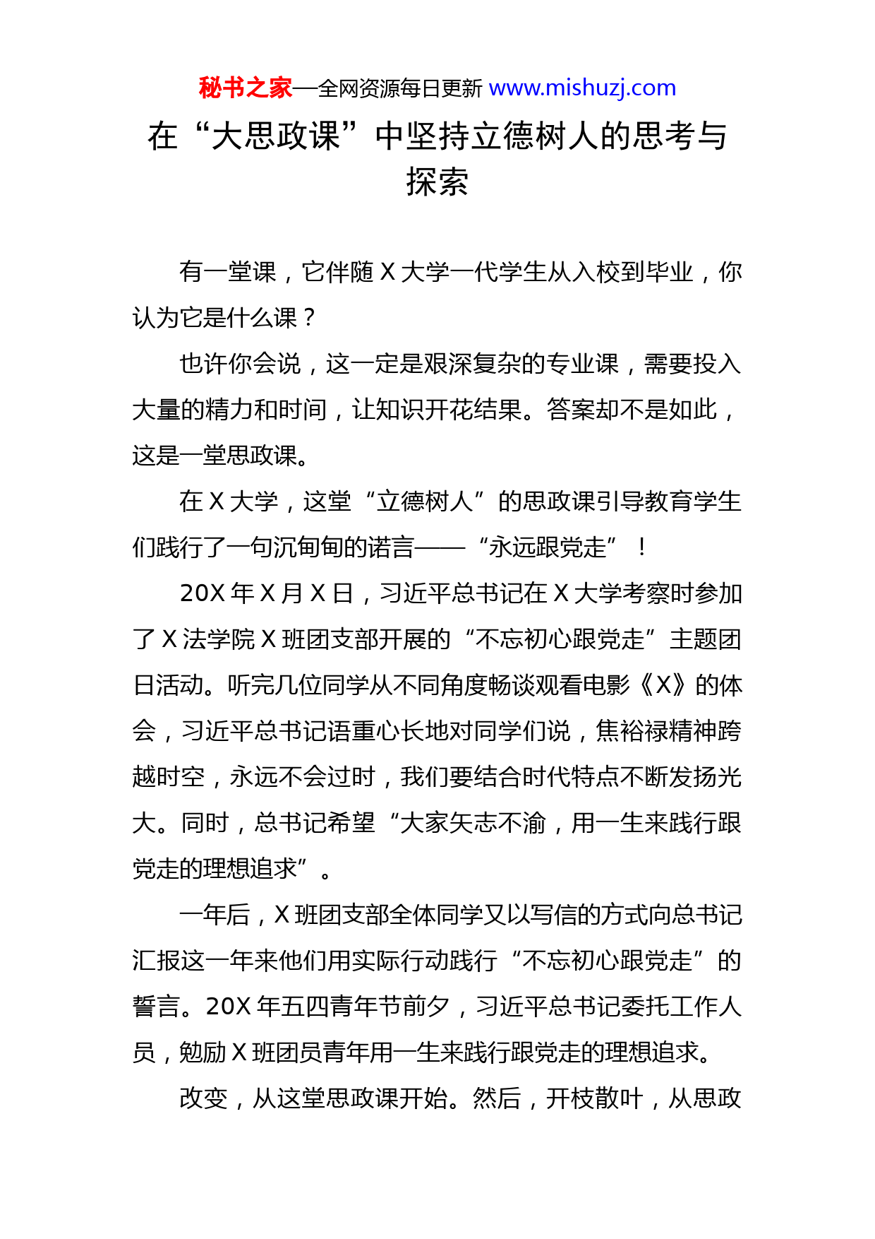 秘书之家—全网资源每日更新www.mishuzj.com在“大思政课”中坚持立德树人的思考与探索有一堂课,它伴随X大学一代学生从入校到毕业,你认为它是什么课?也许你会说,这一定是艰深复杂的专业课,需要投入大量的精力和时间,让知识开花结果。答案却不是如此,这是一堂思政课。在X大学,这堂“立德树人”的思政课引导教育学生们践行了一句沉甸甸的诺言——“永远跟党走”!20X年X月X日,习近平总书记在X大学考察时参加了X法学院X班团支部开展的“不忘初心跟党走”主题团日活动。听完几位同学从不同角度畅谈观看电影《X》的体会,习近平总书记语重心长地对同学们说,焦裕禄精神跨越时空,永远不会过时,我们要结合时代特点不断发扬光大。同时,总书记希望“大家矢志不渝,用一生来践行跟党走的理想追求”。一年后,X班团支部全体同学又以写信的方式向总书记汇报这一年来他们用实际行动践行“不忘初心跟党走”的誓言。20X年五四青年节前夕,习近平总书记委托工作人员,勉励X班团员青年用一生来践行跟党走的理想追求。改变,从这堂思政课开始。然后,开枝散叶,从思政秘书之家—全网资源每日更新www.mishuzj.com课扩展到每门学科,尤其是法学领域,“立足中国土地、中国国情、中国法治实践”的目标正由老中青三代团队达成。改变,从这堂课开始,从课堂内扩展到课堂外,同学们在一次次重大活动中、一次次支教支边中,诉说着自己对党的深情。这堂课也伴随着每一个案例的实践。南海仲裁案、中美贸易摩擦、追索海外流失文物等案例中,法大师生努力向世界讲好中国法治故事,推进中国法治国际传播。一堂思政课,为什么不断拓展、不断生发,指引着一代法律青年的成长轨迹?近日,光明日报调研组一行走进X大学,走进师生中间,聆听这节不落幕的思政课,探寻课程背后青年人成长成材的密码。1.思政课如何让学生“从知到行”?X月X日下午,X大学X楼教室里坐满了求知若渴的同学,“习近平法治思想概论”课正式开讲,校长X作为主讲人为X多名本科生讲授本学期的第一课。X从一棵“焦桐”讲起,再穿插故事和理论,深入浅出,有的同学放下手中记录的笔,眼睛牢牢盯着屏幕,舍不得错过一点点瞬间。课后,X给同学们出了一道思考题:“法律人跟党走意味着什么?”他说,把这行字写在黑板上的那个瞬间,他秘书之家—全网资源每日更新www.mishuzj.com不禁回忆起X年前的那个思政课堂。X认为,习近平总书记为X大学师生上的生动的大思政课,让他们读懂了新时代青年奋勇担当的时代使命,坚定了青年与新时代同向同行共同前进的理想信念。从这节课,到每门课,这个传承说明了什么?调研组认为,“信仰”,也许就是答案。在X大学校园,调研组随机采访了一些同学。X学院X级学生X刚刚修完《X》,感慨良多。他告诉调研组:“行大道,立天下。正是在中国共产党的领导下,中华民族迎来了从站起来、富起来到强起来的伟大飞跃。但我们也要清醒认识到,当前国际局势持续复杂变化。我现在辅修了法学,未来我将积极努力投身国家涉外法治工作,坚定维护国家主权、安全、发展利益。”从知到行,这是讲好思政课的第一步。在大学课堂上,思政课有两种教学方式,一种注重理论高度,一种注重课堂体验。如何把课程讲活?调研组在走访中发现,X大学的做法是:讲好思政课,需要时代的气度、时间的宽度、空间的广度。X月X日,是春季学期开学的第一天。因受新冠肺炎疫情影响,本科生的通识主干课“习近平新时代中国特色社会主义思想概论”课程只能采取线上教学。X告诉调研组,新学期第一讲将抗击疫情作为生动的形势政策教育课秘书之家—全网资源每日更新www.mishuzj.com程和深刻的生命教育课程,围绕抗击疫情主题展开讲授,引导大学生正确认识个人与社会、个人与国家、个人与时代的关系。“从20X—20X学年春季学期起,X大学就开设了‘习近平新时代中国特色社会主义思想概论’课程。这是党的十九大后,学校推进习近平新时代中国特色社会主义思想进教材、进课堂、进头脑的重要举措。课程与既有思想政治理论课相辅相成、紧密衔接,又进行了改革创新、深化拓展,是学校第一批‘课程思政’重点建设示范课。”X大学党委书记X介绍。X大学还专门成立“习近平新时代中国特色社会主义思想概论”教研室,挑选一批学有专长、影响力大、教学效果好的骨干教师作为该课程授课教师。X学院副教授X示:“老师们会定期集中备课,在教师层面上,做到‘真学、真信、真教’。同时在教学层面上,注重探讨如何‘创新方法、探索形式、注重效果’。”在X大学,有一门堂堂爆满,同学们经常席地而坐的课程。这就是前文中X同学刚刚修完的《X》。这门课在今年X月获评X市课程思政示范课程。授课教师、政治与公共管理学院教授X表示,讲好这门课的秘诀就在于“从知到行”:紧密结合中国特色大国外交的理论与实践,邀请校外专家、学者为学生进行授课,力图做到将课程思政之秘书之家—全网资源每日更新www.mishuzj.com信、课程思政之融、课程思政之理、课程思政之全有机结合,逐步形成了专业知识“小”课堂,课程思政“大”讲堂的良好效果。2.思政课如何激发学生学习动力?调研组发现,除了实践部分,X大学还把思政课堂“搬”到社会生活之中。法学院研究生X在参加完北京2022年冬奥会和冬残奥会
