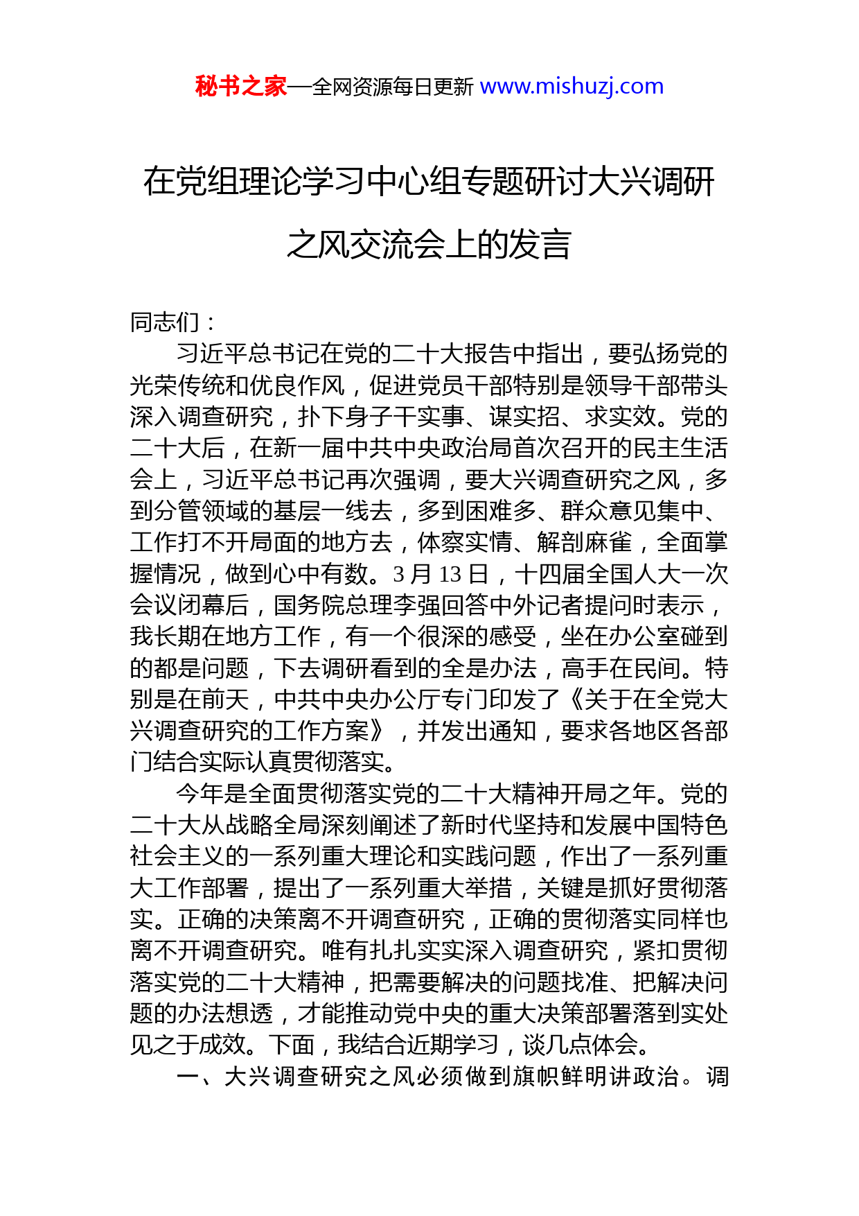 秘书之家—全网资源每日更新www.mishuzj.com在党组理论学习中心组专题研讨大兴调研之风交流会上的发言同志们:习近平总书记在党的二十大报告中指出,要弘扬党的光荣传统和优良作风,促进党员干部特别是领导干部带头深入调查研究,扑下身子干实事、谋实招、求实效。党的二十大后,在新一届中共中央政治局首次召开的民主生活会上,习近平总书记再次强调,要大兴调查研究之风,多到分管领域的基层一线去,多到困难多、群众意见集中、工作打不开局面的地方去,体察实情、解剖麻雀,全面掌握情况,做到心中有数。3月13日,十四届全国人大一次会议闭幕后,国务院总理李强回答中外记者提问时表示,我长期在地方工作,有一个很深的感受,坐在办公室碰到的都是问题,下去调研看到的全是办法,高手在民间。特别是在前天,中共中央办公厅专门印发了《关于在全党大兴调查研究的工作方案》,并发出通知,要求各地区各部门结合实际认真贯彻落实。今年是全面贯彻落实党的二十大精神开局之年。党的二十大从战略全局深刻阐述了新时代坚持和发展中国特色社会主义的一系列重大理论和实践问题,作出了一系列重大工作部署,提出了一系列重大举措,关键是抓好贯彻落实。正确的决策离不开调查研究,正确的贯彻落实同样也离不开调查研究。唯有扎扎实实深入调查研究,紧扣贯彻落实党的二十大精神,把需要解决的问题找准、把解决问题的办法想透,才能推动党中央的重大决策部署落到实处见之于成效。下面,我结合近期学习,谈几点体会。一、大兴调查研究之风必须做到旗帜鲜明讲政治。调秘书之家—全网资源每日更新www.mishuzj.com查研究是我们党在各个历史时期做好工作的重要传家宝,是关系党和人民事业得失成败的大问题。毛泽东同志在《反对本本主义》开篇就强调:“没有调查,没有发言权。”他始终坚持把调查研究作为了解社会、制定政策的前提和基础,对我们党克服教条主义错误、探索中国革命正确道路、推进马克思主义中国化起到了重要作用。习近平总书记高度重视调查研究,强调“调查研究是谋事之基成事之道,没有调查就没有发言权,没有调查就没有决策权”。在正定工作时,他经常骑自行车下乡,每次骑到滹沱河沙滩就得扛着自行车走,他说,虽然辛苦一点,但确实摸清了情况,同基层干部和老百姓拉近了距离、增进了感情。党的十八大以来,习近平总书记以调研开局开路,不断深入实际、发现问题、认识国情、寻求规律,为全党树立了标杆、作出了表率。二、大兴调查研究之风必须发挥问题导向的作用。要聚焦实践遇到的新问题、改革发展稳定存在的深层次问题人民群众急难愁盼的普遍问题、国际变局中的重大问题、党的建设面临的突出问题,不断提出真正解决问题的新理念新思路新办法。党的二十大报告指出,“我们的工作还存在一些不足,面临不少困难和问题”。比如,发展不平衡不充分问题仍然突出,破解之道是什么?又如,意识形态领域存在不少挑战,该如何有效应对?这些问题都需要在调查研究中得到解答。三、大兴调查研究之风重在发扬求真务实的作风。党员干部要扑下身子、沉到一线,亲自察看、亲身体验,既要深入机关,也要深入基层;既要调研干部,也要调研群众;既要解剖麻雀,也要把握全局;既要到工作局面好和先进的地方去总结经验,又要到困难较多、情况复杂的地方去研究问题,这样才能真正听到实话、察到实情、获得真知、收到实效。要杜绝走过场、把现场当“秀场”的形式主义调研,也要避免报喜不报忧的错误思想和只揣摩领秘书之家—全网资源每日更新www.mishuzj.com导心思、不关注群众意愿的官僚主义做派,更不能搞简单粗暴的“拿来主义”和有意而为的弄虚作假。中华民族伟大复兴绝不是轻轻松松、敲锣打鼓就能实现的,需要破解的难题、迎接的挑战还很多。全党同志特别是领导干部要在贯彻落实党的二十大精神上真正行动起来、深入下去,切实把存在的矛盾和问题搞清搞透,把各项工作做实做好,团结带领广大干部群众不断朝着实现中华民族伟大复兴的宏伟目标奋勇前进。发言完毕,不当之处,请同志们批评指正。