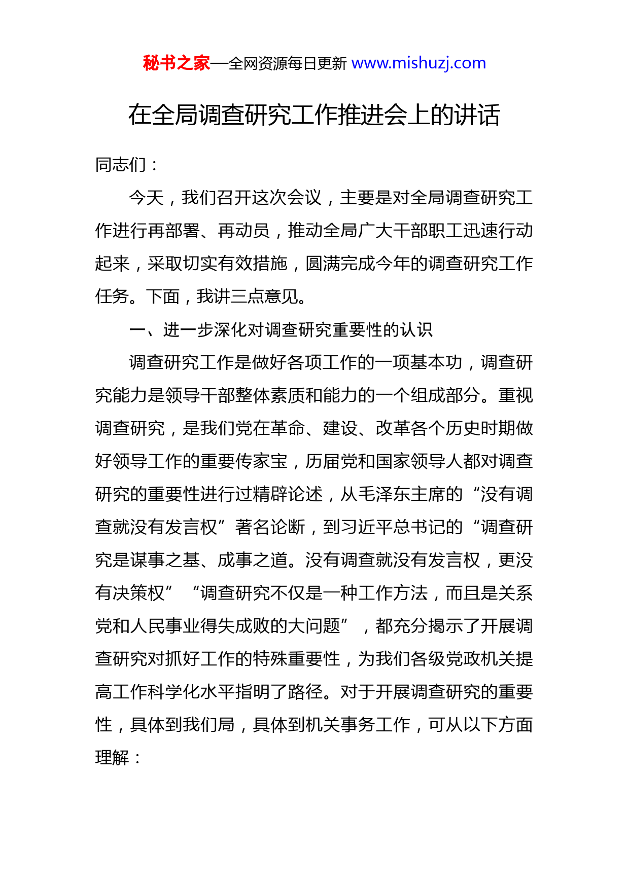 秘书之家—全网资源每日更新www.mishuzj.com在全局调查研究工作推进会上的讲话同志们:今天,我们召开这次会议,主要是对全局调查研究工作进行再部署、再动员,推动全局广大干部职工迅速行动起来,采取切实有效措施,圆满完成今年的调查研究工作任务。下面,我讲三点意见。一、进一步深化对调查研究重要性的认识调查研究工作是做好各项工作的一项基本功,调查研究能力是领导干部整体素质和能力的一个组成部分。重视调查研究,是我们党在革命、建设、改革各个历史时期做好领导工作的重要传家宝,历届党和国家领导人都对调查研究的重要性进行过精辟论述,从毛泽东主席的“没有调查就没有发言权”著名论断,到习近平总书记的“调查研究是谋事之基、成事之道。没有调查就没有发言权,更没有决策权”“调查研究不仅是一种工作方法,而且是关系党和人民事业得失成败的大问题”,都充分揭示了开展调查研究对抓好工作的特殊重要性,为我们各级党政机关提高工作科学化水平指明了路径。对于开展调查研究的重要性,具体到我们局,具体到机关事务工作,可从以下方面理解:秘书之家—全网资源每日更新www.mishuzj.com(一)开展调查研究,是讲政治、讲大局的根本要求。党的十八大以来,党中央、国务院和省委省政府高度重视调查研究,把改进调查研究作为改进工作作风、密切联系群众的重要利器。中共中央政治局制定颁布的八项规定,把“改进调查研究”放在了首要地位予以强调。近年来开展的党的群众路线教育实践活动、“三严三实”专题教育、“两学一做”学习教育等专项教育中,都把调查研究作为改进工作作风的重要手段予以重点强调。中办印发的《关于推进学习型党组织建设的意见》则更加明确地提出:“建立健全调查研究制度,省部级领导干部到基层调研每年不少于30天,市、县级领导干部不少于60天,领导干部要每年撰写1至2篇调研报告”。省委在贯彻中央八项规定实施办法以及系列专题教育中,都对调查研究进行重点强调,提出明确要求;省委近期要求省直各部门提报的贯彻中央八项规定精神自查报告中,把部门领导班子开展调查研究情况列为一项重要内容来考评;在省政府办公厅印发的《关于进一步改进工作作风的几点具体要求》中,对省政府领导深入基层和群众开展调查研究的时间和要求进一步细化,进而明确:“从2017年下半年开始周三为‘无会日’,省政府及组成部门、直属特设机构的会议安排在除周三以外的工作日召开,以利于省政府领导同志和部门负责同志深入基层调查研究。”秘书之家—全网资源每日更新www.mishuzj.com中央和省委、省政府对调查研究的要求还有很多,从以上列举的几条可以看出,调查研究已经提到了事关政治和大局的重要地位。我们一定要增强政治敏锐性和政治自觉性,提高政治站位和政治觉悟,强化“四个意识”,坚决在思想上政治上行动上同以习近平同志为核心的党中央保持高度一致,坚决贯彻落实中央和省委省政府关于调查研究的决策部署和工作要求,认真开展调查研究,研究探索新形势下机关事务工作的工作思路、内在要求、基本规律和实现途径,更好地服务党和国家中心工作。(二)开展调查研究,是机关事务工作改革创新发展的必然选择。党的十八大以来,党中央、国务院陆续出台了一系列党内法规和规章制度,先后开展了一系列专项整治工作。这些工作很多都与机关事务有关,有的直接就是针对机关事务工作,为机关事务工作带来了新机遇、新挑战。习近平总书记、李克强总理、张高丽副总理等中央领导同志多次发表重要讲话、作出重要批示指示,对机关事务工作提出新的要求。近期,国管局相继召开多次全国性会议,研究指出机关事务工作具有“政治性、保障性、经济性、内部性、特殊性”五大特征,提出了治理法治化、服务规范化、保障标准化、管理精细化、机构职能化、手段信息化、评价绩效化等“七化”目标,在机关事务理论建设、管理创新上实现了新的突破,在办公用房、公务用秘书之家—全网资源每日更新www.mishuzj.com车、职能建设、标准化建设等方面相继作出部署安排。从党中央、国务院以及国管局的部署要求看,机关事务工作的改革创新发展,决不是一般性的缝缝补补,而是必须适应形势要求,切实实现职能转变,不光要讲“管理”,更要在更高层次、宏观层面实现“治理”,以改革发展的新理论、新思维来指导和推动管理保障服务,提升各个业务板块的治理能力和治理水平。而以上机关事务改革创新发展目标的实现,开展调查研究、进行理论创新和管理创新成为必然选择。(三)开展调查研究,是解决我局当前突出问题的现实需要。新一届局党组组建以来,在省委、省政府的高度重视和全局上下的共同努力下,我局的机构建设不断拓展完善,职能履行更加顺畅高效,干部队伍结构更加趋于合理,制约发展的历史遗留问题得到根本解决,全局各项业务工作都呈现出整体向好、总体向上的良好发展态势。但与中央和省委、省政府的要求相比,与先进兄弟省市相比,我们还存在一定的差距和不足。主要表现在:一是理论研究相对滞后,基础性、前瞻性、战略性研究不够,有指导作用、有影响力的成果还不多,特别是能够进入省委省政府领导决策的成果很少,对机关事务工作的支撑力度偏弱。二是