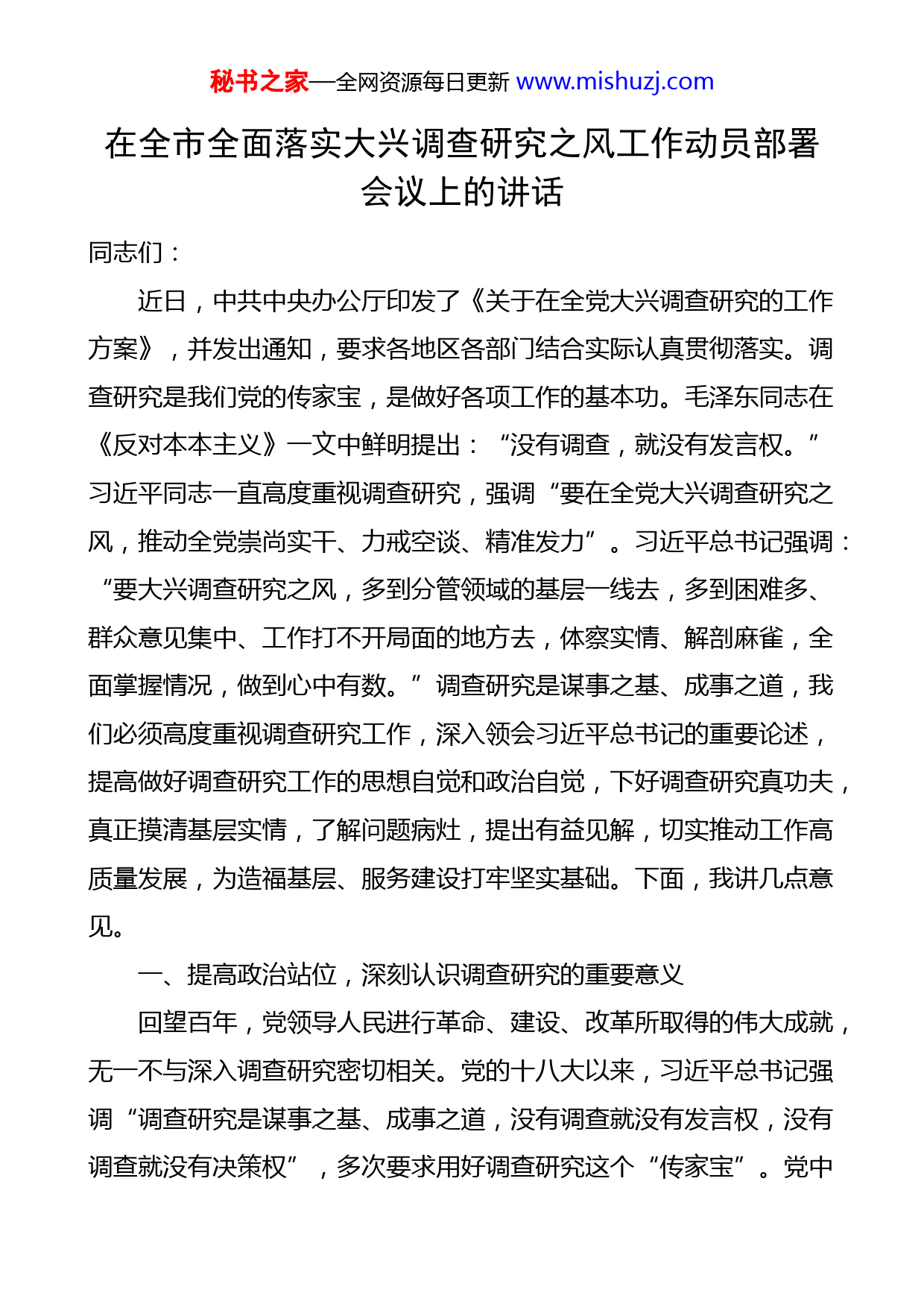 秘书之家—全网资源每日更新www.mishuzj.com在全市全面落实大兴调查研究之风工作动员部署会议上的讲话同志们:近日,中共中央办公厅印发了《关于在全党大兴调查研究的工作方案》,并发出通知,要求各地区各部门结合实际认真贯彻落实。调查研究是我们党的传家宝,是做好各项工作的基本功。毛泽东同志在《反对本本主义》一文中鲜明提出:“没有调查,就没有发言权。”习近平同志一直高度重视调查研究,强调“要在全党大兴调查研究之风,推动全党崇尚实干、力戒空谈、精准发力”。习近平总书记强调:“要大兴调查研究之风,多到分管领域的基层一线去,多到困难多、群众意见集中、工作打不开局面的地方去,体察实情、解剖麻雀,全面掌握情况,做到心中有数。”调查研究是谋事之基、成事之道,我们必须高度重视调查研究工作,深入领会习近平总书记的重要论述,提高做好调查研究工作的思想自觉和政治自觉,下好调查研究真功夫,真正摸清基层实情,了解问题病灶,提出有益见解,切实推动工作高质量发展,为造福基层、服务建设打牢坚实基础。下面,我讲几点意见。一、提高政治站位,深刻认识调查研究的重要意义回望百年,党领导人民进行革命、建设、改革所取得的伟大成就,无一不与深入调查研究密切相关。党的十八大以来,习近平总书记强调“调查研究是谋事之基、成事之道,没有调查就没有发言权,没有调查就没有决策权”,多次要求用好调查研究这个“传家宝”。党中秘书之家—全网资源每日更新www.mishuzj.com央各项决策都严格执行民主集中制,都注重充分发扬党内民主,都是经过深入调查研究、广泛听取各方面意见、进行反复讨论而形成的。党的二十大对党员干部特别是领导干部带头深入调查研究作出明确要求,要求弘扬党的光荣传统和优良作风,促进党员干部特别是领导干部带头深入调查研究,扑下身子干实事、谋实招、求实效。近年来,我市发展进入新时代,面临着各种新的问题和挑战。一方面,国家对于市域经济社会的发展提出了更高的要求和标准,我们需要更加紧密地结合国家发展大局,顺应新时代要求,积极探索具有本地特色的经济发展模式。另一方面,我们面临着各种复杂的内外部环境变化,例如经济下行压力、环境污染、社会治理问题等等,这些问题的解决需要我们有针对性地调查研究,才能找到解决的方案。因此,我们必须把调查研究工作摆在重要位置,高度重视调查研究工作,进一步加强调查研究队伍的建设,不断完善调查研究工作的机制和制度,推动调查研究工作不断深入发展。深入了解实际情况,把握发展方向,提出切实可行的解决方案,为推动经济社会持续健康发展提供有力支持。只有这样,我们才能够更好地适应当前形势和发展要求,为全市的发展贡献力量。二、深化学习教育,推动理论学习与调查研究学用相长要创新理论学习机制,以理论学习为着力点,以调查研究为切入点,以推动工作为落脚点,以制度保障为支撑点,打造理论学习、调查研究、推动工作“三位一体”模式,在学习中增长见识、开拓思维,在实践中发现问题、解决问题,在成果转化中提高综合能力、推动工作,促进全市经济社会高质量发展。第一,要认真学习习近平总书记秘书之家—全网资源每日更新www.mishuzj.com关于调查研究的重要论述,深刻理解调查研究对于全面建设社会主义现代化国家的重要意义。要认识到调查研究是一项基础性、全局性、战略性的工作,需要各级干部深入基层,了解实际情况,把调查研究与制定政策、解决问题紧密结合起来,真正把调查研究工作贯彻到实践中去。第二,要注重理论学习的深度和广度。可以通过理论学习中心组学习、读书班等形式,选取相关调查研究方面的专题进行深入学习,注重学习方法的改进和提高。同时,还要注意拓宽理论学习的广度,了解当前国内外的研究动态和趋势,对比其他地区、其他国家的调查研究经验,吸取有益经验和方法。第三,要营造良好的学习氛围,加强调查研究工作的宣传和培训,提高调查研究工作的专业化水平。可以通过举办经验交流会、组织实地观摩等形式,加强干部之间的交流和沟通,推动调查研究工作的不断提高。要通过理论学习中心组学习、读书班等,加强理论学习习近平总书记关于调查研究的重要论述,提高调查研究的思想自觉、政治自觉。三、坚持求真务实,做细做实调查研究基本功“知屋漏者在宇下,知政失者在草野。”要想摸清民情民意,就要深入基层群众、深入生产一线、深入服务对象,站在群众的立场,下足调查研究的功夫,听取意见、了解民生,成为群众的“知心人”。第一,我们需要加强与群众的联系。只有了解群众的真实需求和实际情况,才能做出具有针对性的调查研究,并提出切实可行的解决方案。可以通过走访社区、企业、学校等基层单位,与群众面对面交流,听取群众意见和建议。也可以通过开展问卷调查等方式,收集群众的意见和反馈,全面了解情况。第二,我们要注重实践,不断总结和提炼秘书之家—全网资源每日更新www.mishuzj.com实践经验。只有将调查研究的理论知识转化为实际行动,才能不断提高调查研究的实效性和针对性。可以通过制定调查研究计划、实地调查、数据分析等方式,将调查研究的理论知识应用到具体工作中,不断提升调查研究的实践能力和水平。