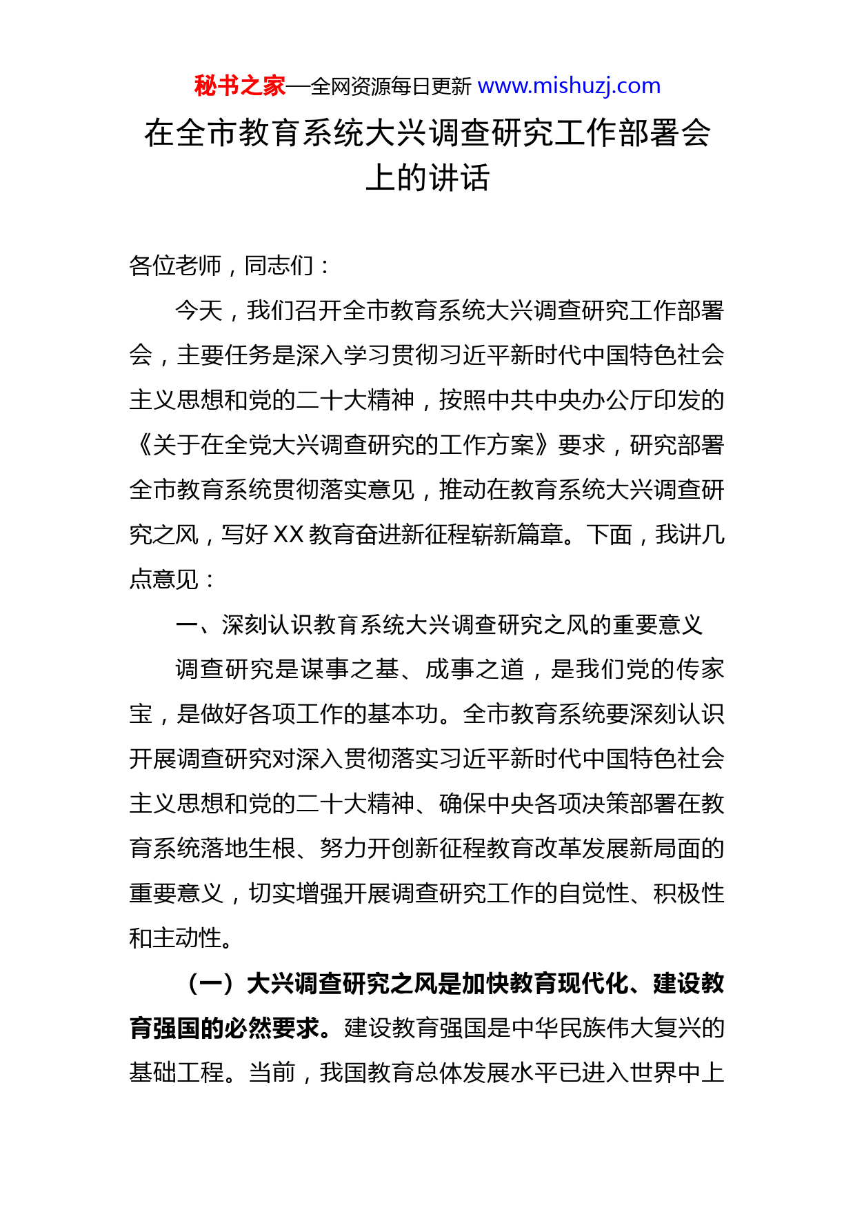 秘书之家—全网资源每日更新www.mishuzj.com在全市教育系统大兴调查研究工作部署会上的讲话各位老师,同志们:今天,我们召开全市教育系统大兴调查研究工作部署会,主要任务是深入学习贯彻习近平新时代中国特色社会主义思想和党的二十大精神,按照中共中央办公厅印发的《关于在全党大兴调查研究的工作方案》要求,研究部署全市教育系统贯彻落实意见,推动在教育系统大兴调查研究之风,写好XX教育奋进新征程崭新篇章。下面,我讲几点意见:一、深刻认识教育系统大兴调查研究之风的重要意义调查研究是谋事之基、成事之道,是我们党的传家宝,是做好各项工作的基本功。全市教育系统要深刻认识开展调查研究对深入贯彻落实习近平新时代中国特色社会主义思想和党的二十大精神、确保中央各项决策部署在教育系统落地生根、努力开创新征程教育改革发展新局面的重要意义,切实增强开展调查研究工作的自觉性、积极性和主动性。(一)大兴调查研究之风是加快教育现代化、建设教育强国的必然要求。建设教育强国是中华民族伟大复兴的基础工程。当前,我国教育总体发展水平已进入世界中上秘书之家—全网资源每日更新www.mishuzj.com行列。加快从教育大国迈向教育强国,对新时代教育改革发展提出了新的更高要求。贯彻落实党的二十大精神,深刻领会习近平新时代中国特色社会主义思想中关于教育改革发展的重要论述,必须深入开展调查研究,准确研判新时代教育改革发展存在的突出问题和深层次的体制机制障碍,提出加快教育现代化、建设教育强国的新思路新举措,以永不懈怠的精神状态和一往无前的奋斗姿态,实现教育系统新作为。(二)大兴调查研究之风是增强人民群众教育获得感、办好人民满意教育的迫切需要。教育是最大的民生,事关人民群众的切身利益。当前,随着我国社会主要矛盾的转化,教育领域的供求关系、资源条件、评价标准都发生了深刻而重要的变化,在“有学上”问题基本解决后,人民群众更加期盼“上好学”,接受更加公平而优质的教育。只有切实加强调查研究,才能真正抓住并解决人民群众最急最忧最怨的教育问题,不断满足人民群众日益增长的对更好教育和更加美好生活的需求。(三)大兴调查研究之风是改进工作作风、狠抓工作落实的重要途径。一分部署、九分落实。实践反复证明,只有深入开展调查研究,才能吃透中央精神、把准工作方向,正确贯彻执行党的路线方针政策,确保各项教育决策部署符合客观实际、符合教育规律、符合人民期待。只有秘书之家—全网资源每日更新www.mishuzj.com开展扎实、细致、艰苦的调查研究工作,才能坚决做到反对“四风”,提高发现问题、分析问题和解决问题的能力,不断增强工作的科学性、预见性、主动性和创造性,以钉钉子精神做实做细做好各项工作。二、准确把握教育系统大兴调查研究之风的总体要求一要科学把握工作开展的指导思想。要坚持以习近平新时代中国特色社会主义思想为指导,深入学习贯彻党的二十大精神,围绕市委关心、百姓关切、社会关注的问题深入开展调查研究,把新时代教育领域的主要矛盾和矛盾的主要方面搞清,把制约教育改革发展的体制机制障碍搞准,把人民群众反映强烈的热点难点问题搞透,把基层好的经验和做法特别是具有可推广可复制价值的制度性成果总结好,推动教育系统全面落实中央各项决策部署,写好教育“奋进之笔”,加快教育现代化,建设教育强国,努力办好人民满意教育,为全面建设社会主义现代化国家、推进中华民族伟大复兴作出教育系统新的贡献。二要牢牢把握工作开展的基本原则。要坚持问题导向。针对制约教育改革发展的突出问题和人民群众关心的热点难点问题,重点到困难较多、情况复杂、矛盾尖锐的地方去调研,把准“实事”,努力“求是”。要坚持群众路线。扑下身子、走进一线,深入基层学校、师生员工、人民群众,拜人民为师,向师生学习,既要“身入”,更秘书之家—全网资源每日更新www.mishuzj.com要“心至”。要坚持求真务实。一切从客观实际出发,不做事先定调子、有结论的调研,多做不打招呼、不作安排的随机性调研,确保能真正深入实际、听到实话、察到实情。要坚持“调”“研”并重。既要把事情的真相和全貌调查清楚,更要进行深入细致的研究分析,把问题的本质和规律把握准确,把解决问题的思路和对策研究透彻。要坚持与时俱进。在采取实地调查、座谈交流、蹲点调研等多种形式基础上,充分利用大数据等现代信息技术,提高调研的效率和科学性。三要深刻把握工作开展的方式方法。县处级以上领导班子成员每人牵头1个课题开展调研,同时,针对相关领域或工作中最突出的难点问题进行专项调研。要坚持因地制宜,综合运用座谈访谈、随机走访、问卷调查、专家调查、抽样调查、统计分析等方式,充分运用互联网、大数据等现代信息技术开展调查研究,提高科学性和实效性。要深入农村、社区、学校等基层单位,掌握实情、把脉问诊,问计于群众、问计于实践。要转换角色、走进群众,了解群众的烦心事操心事揪心事,发现和查找工作中的差距不足。要结合典型案例,分析问题、剖析原因,举一反三采取改进措施。要加强督查调研,检查工作是否真正落实、问题是否真正解决。三、紧紧围绕贯彻落实