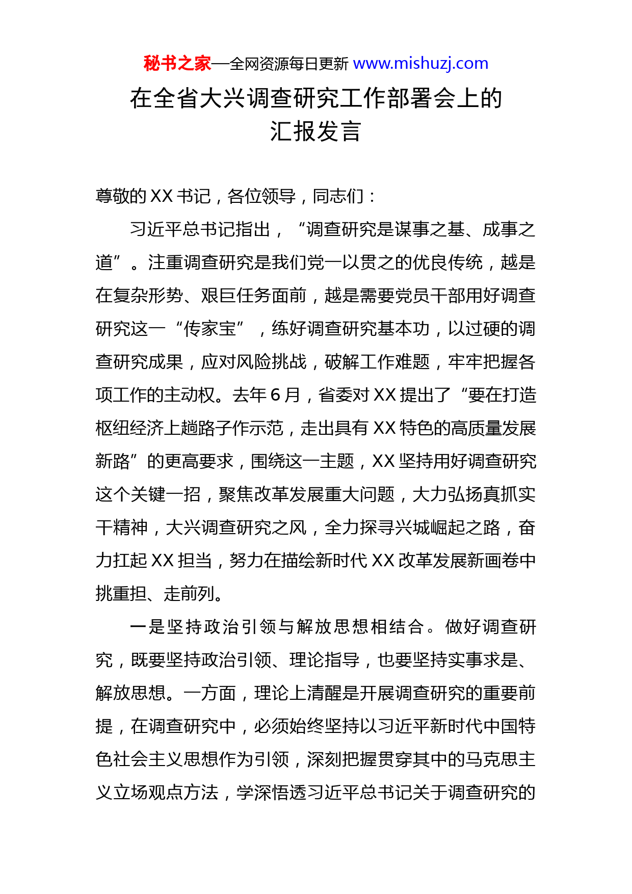 秘书之家—全网资源每日更新www.mishuzj.com在全省大兴调查研究工作部署会上的汇报发言尊敬的XX书记,各位领导,同志们:习近平总书记指出,“调查研究是谋事之基、成事之道”。注重调查研究是我们党一以贯之的优良传统,越是在复杂形势、艰巨任务面前,越是需要党员干部用好调查研究这一“传家宝”,练好调查研究基本功,以过硬的调查研究成果,应对风险挑战,破解工作难题,牢牢把握各项工作的主动权。去年6月,省委对XX提出了“要在打造枢纽经济上趟路子作示范,走出具有XX特色的高质量发展新路”的更高要求,围绕这一主题,XX坚持用好调查研究这个关键一招,聚焦改革发展重大问题,大力弘扬真抓实干精神,大兴调查研究之风,全力探寻兴城崛起之路,奋力扛起XX担当,努力在描绘新时代XX改革发展新画卷中挑重担、走前列。一是坚持政治引领与解放思想相结合。做好调查研究,既要坚持政治引领、理论指导,也要坚持实事求是、解放思想。一方面,理论上清醒是开展调查研究的重要前提,在调查研究中,必须始终坚持以习近平新时代中国特色社会主义思想作为引领,深刻把握贯穿其中的马克思主义立场观点方法,学深悟透习近平总书记关于调查研究的秘书之家—全网资源每日更新www.mishuzj.com重要论述,学会运用战略思维、历史思维、辩证思维,提高运用科学理论解决实际问题的能力;另一方面,思想的解放是做好调查研究工作的必然要求,在调查研究中,不能按部就班,更不能犯“经验主义”“本本主义”错误,必须不断解放思想,透过现象看本质,找准症结,拿出有效对策。XX坚持把习近平新时代中国特色社会主义思想作为做好一切工作的行动指南,把解放思想作为谋划推动工作的关键环节,在全市深入开展“彰显XX担当,我们怎么干”解放思想大讨论活动,坚持跳出XX看XX,向好的学、跟强的比、与快的赛,赴杭州、深圳、长沙、合肥等先进地区学习考察调研,广泛发动干部群众参与讨论,征求各类意见建议,系统推出城市建管十大提升行动、产业高质量发展十大提升行动、十大文化重点工程和“人才10条”政策等系列务实举措,有力增强全市发展的科学性、前瞻性和成效性。二是坚持高处谋局和细处落子相结合。从高处审视全局和从细处落地落实,是正确认识和处理事物的两条路径、两种方法,也是领导干部开展调查研究的基本要求。在调查研究中,既要善于观大势、谋大事,站在战略和全局的高度观察和处理问题,在制定政策时冷静观察、谨慎从事、谋定而后动;又要善于抓要害、见真招,从大处着眼、小处着手,将战略方向变成具体举措,推动各项工作秘书之家—全网资源每日更新www.mishuzj.com落地见效。当前,面对百年未有之大变局,国内外经济形势发生重大调整,特别是新一轮技术革命与产业变革带来的全新挑战,XX站在战略全局高度,从宏观着眼,准确把握发展大势,科学研判经济形势,主动融入构建“双循环”新发展格局,精准把握全球航空产业大调整、电子信息产业迎来新的爆发点等新趋势新机遇,加快战略新兴产业在XX布局。在此基础上,坚持从微观着手,分析各地各行业特别是企业经营调整情况,抢抓北京非首都功能疏解、发达地区产业外溢、央企“二次布局”、大企业“二次创业”战略机遇,积极对接产业转移,将产业发展落到项目上,全力开展招大引强,与华为、阿里、工业富联、软通动力、科大讯飞等龙头企业达成战略合作,推动比亚迪云巴、华勤通讯生产基地、华为新一代智慧视觉产业园、康佳半导体高科技产业园、瑶湖龙旗智能科技园等X个百亿项目落户XX,促成协议投资额达XXXX亿元。三是坚持吃透上情与摸清下情相结合。贴紧上级决策部署,围绕现实难题,解决群众所难,是领导干部开展调查研究工作的根本出发点。一方面,要准确领会党中央和省委决策部署要求,学深悟透上级会议和文件精神,把准调查研究方向;另一方面,要深入基层捕捉信息,发现苗头性、倾向性问题,找到群众遇到的现实难题,做到有的放矢。2022年以来,XX坚决按照党中央和省委决策部署秘书之家—全网资源每日更新www.mishuzj.com要求,切实践行人民至上、生命至上理念,统筹推进疫情防控和经济社会发展,深入研究政策,全面梳理疫情以来中央和省级各项政策,特别是民生领域帮扶政策,严格推进政策落实,并结合XX实际,制定出台了《有效应对疫情稳定经济增长25条政策措施》《关于做好“六稳”工作落实“六保”任务的实施办法》等系列文件。同时,针对群众反映强烈的突出问题,研究具体办法,采取有力措施予以解决,重点围绕农贸市场及周边脏乱差、公共停车难、老旧小区居住环境差、社区服务弱等问题,在征求群众意见、深入调研论证的基础上果断决策,迅速开展农贸市场整治“百日攻坚行动”,对涉及XX余万人的XXX个老旧小区实施提升改造,建成“1+5+X”社区邻里中心XX个,有效改善了居民生活,人民群众幸福指数持续攀升。四是坚持解决问题与建立机制相结合。开展调查研究的目的在于通过找问题、摸实情、出对策、破难题,最后形成制度机制,推动工作长效常态化发展。这就需要在调查研究中,坚持标本兼治,既要紧盯难题,重点突破,快速解决,又要找到共性,务实举措,形成成果,让每项调研不仅是解决问题的过程,更是建立制度机制的过程。2022年以来,XX坚持在调研中破难题、建