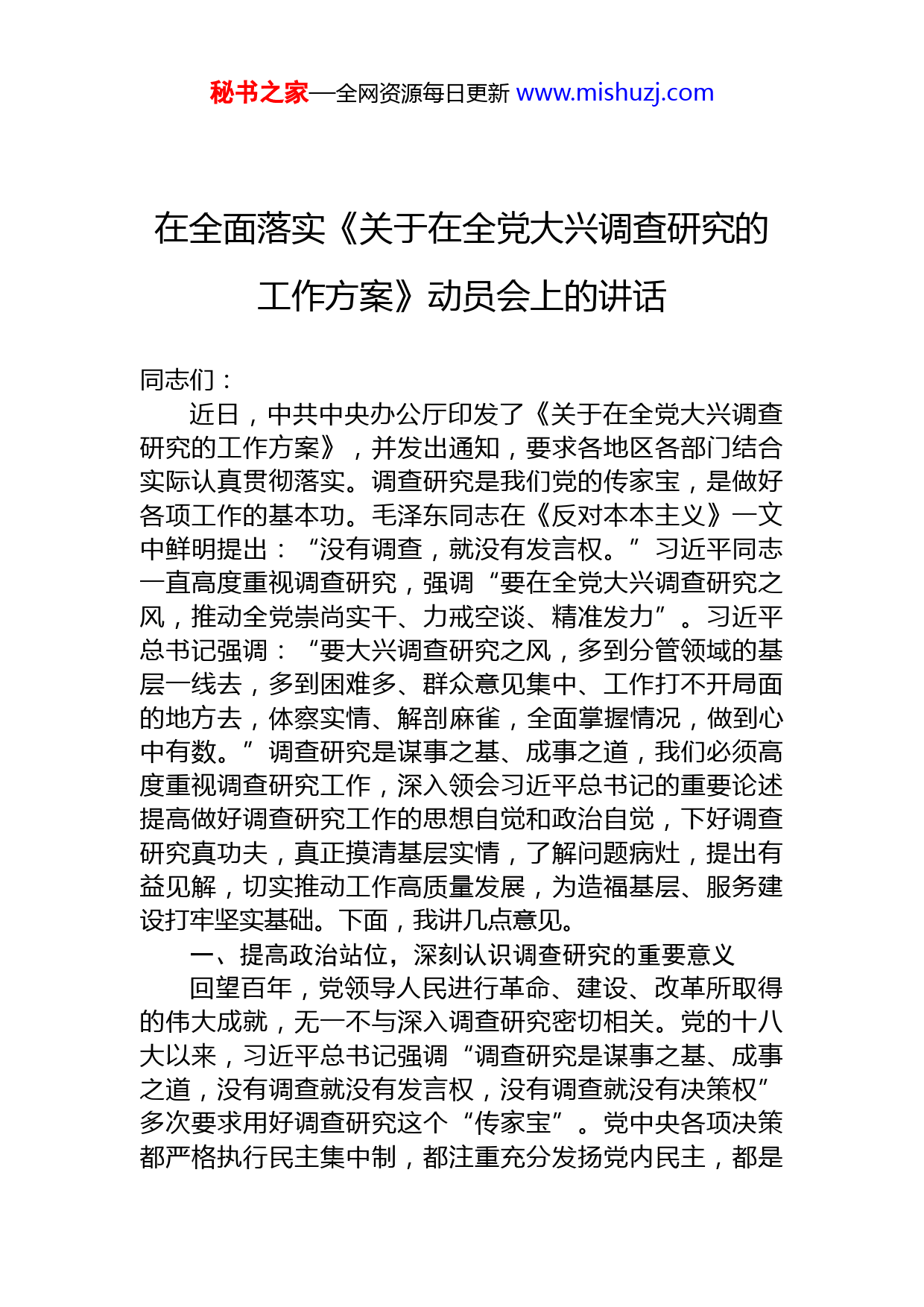 秘书之家—全网资源每日更新www.mishuzj.com在全面落实《关于在全党大兴调查研究的工作方案》动员会上的讲话同志们:近日,中共中央办公厅印发了《关于在全党大兴调查研究的工作方案》,并发出通知,要求各地区各部门结合实际认真贯彻落实。调查研究是我们党的传家宝,是做好各项工作的基本功。毛泽东同志在《反对本本主义》一文中鲜明提出:“没有调查,就没有发言权。”习近平同志一直高度重视调查研究,强调“要在全党大兴调查研究之风,推动全党崇尚实干、力戒空谈、精准发力”。习近平总书记强调:“要大兴调查研究之风,多到分管领域的基层一线去,多到困难多、群众意见集中、工作打不开局面的地方去,体察实情、解剖麻雀,全面掌握情况,做到心中有数。”调查研究是谋事之基、成事之道,我们必须高度重视调查研究工作,深入领会习近平总书记的重要论述提高做好调查研究工作的思想自觉和政治自觉,下好调查研究真功夫,真正摸清基层实情,了解问题病灶,提出有益见解,切实推动工作高质量发展,为造福基层、服务建设打牢坚实基础。下面,我讲几点意见。一、提高政治站位,深刻认识调查研究的重要意义回望百年,党领导人民进行革命、建设、改革所取得的伟大成就,无一不与深入调查研究密切相关。党的十八大以来,习近平总书记强调“调查研究是谋事之基、成事之道,没有调查就没有发言权,没有调查就没有决策权”多次要求用好调查研究这个“传家宝”。党中央各项决策都严格执行民主集中制,都注重充分发扬党内民主,都是秘书之家—全网资源每日更新www.mishuzj.com经过深入调查研究、广泛听取各方面意见、进行反复讨论而形成的。党的二十大对党员干部特别是领导干部带头深入调查研究作出明确要求,要求弘扬党的光荣传统和优良作风,促进党员干部特别是领导干部带头深入调查研究,扑下身子干实事、谋实招、求实效。近年来,我市发展进入新时代,面临着各种新的问题和挑战。一方面,国家对于市域经济社会的发展提出了更高的要求和标准,我们需要更加紧密地结合国家发展大局顺应新时代要求,积极探索具有本地特色的经济发展模式另一方面,我们面临着各种复杂的内外部环境变化,例如经济下行压力、环境污染、社会治理问题等等,这些问题的解决需要我们有针对性地调查研究,才能找到解决的方案。因此,我们必须把调查研究工作摆在重要位置,高度重视调查研究工作,进一步加强调查研究队伍的建设,不断完善调查研究工作的机制和制度,推动调查研究工作不断深入发展。深入了解实际情况,把握发展方向,提出切实可行的解决方案,为推动经济社会持续健康发展提供有力支持。只有这样,我们才能够更好地适应当前形势和发展要求,为全市的发展贡献力量。二、深化学习教育,推动理论学习与调查研究学用相长要创新理论学习机制,以理论学习为着力点,以调查研究为切入点,以推动工作为落脚点,以制度保障为支撑点,打造理论学习、调查研究、推动工作“三位一体”模式,在学习中增长见识、开拓思维,在实践中发现问题、解决问题,在成果转化中提高综合能力、推动工作,促进全市经济社会高质量发展。第一,要认真学习习近平总书记关于调查研究的重要论述。深刻理解调查研究对于全面建设社会主义现代化国家的重要意义。要认识到调查研究是一项基础性、全局性、战略性的工作,需要各级干部深入基层,了解实际情况,把调查研究与制定政策、解决问秘书之家—全网资源每日更新www.mishuzj.com题紧密结合起来,真正把调查研究工作贯彻到实践中去。第二,要注重理论学习的深度和广度。可以通过理论学习中心组学习、读书班等形式,选取相关调查研究方面的专题进行深入学习,注重学习方法的改进和提高。同时,还要注意拓宽理论学习的广度,了解当前国内外的研究动态和趋势,对比其他地区、其他国家的调查研究经验,吸取有益经验和方法。第三,要营造良好的学习氛围。加强调查研究工作的宣传和培训,提高调查研究工作的专业化水平。可以通过举办经验交流会、组织实地观摩等形式,加强干部之间的交流和沟通,推动调查研究工作的不断提高要通过理论学习中心组学习、读书班等,加强理论学习习近平总书记关于调查研究的重要论述,提高调查研究的思想自觉、政治自觉。三、坚持求真务实,做细做实调查研究基本功“知屋漏者在宇下,知政失者在草野。”要想摸清民情民意,就要深入基层群众、深入生产一线、深入服务对象站在群众的立场,下足调查研究的功夫,听取意见、了解民生,成为群众的“知心人”。第一,我们需要加强与群众的联系。只有了解群众的真实需求和实际情况,才能做出具有针对性的调查研究,并提出切实可行的解决方案。可以通过走访社区、企业、学校等基层单位,与群众面对面交流,听取群众意见和建议。也可以通过开展问卷调查等方式,收集群众的意见和反馈,全面了解情况。第二,我们要注重实践,不断总结和提炼实践经验。只有将调查研究的理论知识转化为实际行动,才能不断提高调查研究的实效性和针对性。可以通过制定调查研究计划、实地调查、数据分析等方式,将调查研究的理论知识应用到具体工作中,不断提升调查研究的实践能力和水平。第三,我们要鼓励和支持调查研究工作的