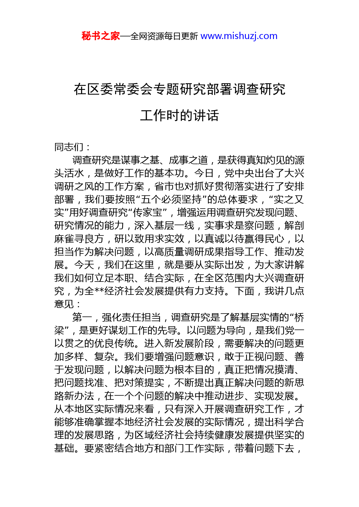 秘书之家—全网资源每日更新www.mishuzj.com在区委常委会专题研究部署调查研究工作时的讲话同志们:调查研究是谋事之基、成事之道,是获得真知灼见的源头活水,是做好工作的基本功。今日,党中央出台了大兴调研之风的工作方案,省市也对抓好贯彻落实进行了安排“”“部署,我们要按照五个必须坚持的总体要求,实之又”“”实用好调查研究传家宝,增强运用调查研究发现问题、研究情况的能力,深入基层一线,实事求是察问题,解剖麻雀寻良方,研以致用求实效,以真诚以待赢得民心,以担当作为解决问题,以高质量调研成果指导工作、推动发展。今天,我们在这里,就是要从实际出发,为大家讲解我们如何立足本职、结合实际,在全区范围内大兴调查研究,为全经济社会发展提供有力支持。下面,我讲几点意见:“第一,强化责任担当,调查研究是了解基层实情的桥”梁,是更好谋划工作的先导。以问题为导向,是我们党一以贯之的优良传统。进入新发展阶段,需要解决的问题更加多样、复杂。我们要增强问题意识,敢于正视问题、善于发现问题,以解决问题为根本目的,真正把情况摸清、把问题找准、把对策提实,不断提出真正解决问题的新思路新办法,在一个个问题的解决中推动进步、实现发展。从本地区实际情况来看,只有深入开展调查研究工作,才能够准确掌握本地经济社会发展的实际情况,提出科学合理的发展思路,为区域经济社会持续健康发展提供坚实的基础。要紧密结合地方和部门工作实际,带着问题下去,秘书之家—全网资源每日更新www.mishuzj.com真正把情况摸清、把问题找准、把对策提实。特别是对具有普遍性和制度性的问题、涉及改革发展稳定的深层次关键性问题,研究透彻,找准根源,摸清症结,提出真正解“”决问题的新思路新办法。要善于抓住问题之源,顺着问“”题的源头找准问题产生的关键,善于把问题之脉、开解“”题之方,善于分析和研究问题,以最短的路径、最快的速度解决问题。从这个层面上来讲,大兴调研之风,既是落实党中央决策部署的政治要求,也是推动我区经济发展的现实要求,因此,我们必须把调查研究工作摆在重要位置,推动调查研究工作不断深入发展。只有这样,我们才能够更好地适应当前形势和发展要求,为全区的发展贡献力量。第二,密切联系群众,调查研究是提升工作实效的基础,要掌握正确的方式方法。调查研究是一项基础性、全局性、战略性的工作,需要我们深入基层,了解实际情况,把调查研究与制定政策、解决问题紧密结合起来,真正把调查研究工作贯彻到实践中去。首先,做好准备工作是开展调查研究的前提和基础,选题时要紧扣群众生产生活的保障问题、经济社会发展的实际问题,反复斟酌调查“”研究的提纲、内容及路线,从而能真正摸透下情,读“”“”懂民生清单,对老百姓的诉求和期望做到心中有数。其次,调查研究要将心比心、以心换心,才能真正听到真“话、了解到实情。对于群众反映强烈、亟待解决的急难愁”“”盼问题,要有逢敌亮剑的精神,带着问题深查细究、找“”“准症结,从而对症下药,让群众切身感受到件件有着”落、事事有回音的暖心。最后,要通过深度思考、辨证分“析,推动调研成果愈研愈精。想写好基层调研的下半篇文”章,关键在于始终站稳人民立场,既立足当前,又放眼长远,把调查研究的有效做法和成功经验再深入、再转化、“再创新,为推动乡村振兴、解决各类矛盾增添一抹初心”红。掌握正确的调研方式,要注重理论学习,选取相关调秘书之家—全网资源每日更新www.mishuzj.com查研究方面的专题进行深入学习,注重学习方法的改进和提高,加强干部之间的交流和沟通,推动调查研究工作能力水平的不断提高。第三,提高履职本领,调查研究要以推动工作开展为归宿,注重实效性和针对性。要强化问题意识,提高发现问题的敏锐性,对标对表上级重要决策部署,主动从群众所需、所盼、所急、所忧入手,确保调研方向不偏不倚。同时,要注意通过查阅资料、总结提炼,掌握基本情况、厘“”清调研重点,做到在案头知全局。要注重实践,不断总结和提炼实践经验,通过制定调查研究计划、实地调查、数据分析等方式,将调查研究的理论知识应用到具体工作中,不断提升调查研究的实践能力和水平。要多入群众家“”门更要走进群众心坎,多用大白话、善于唠家常,引导被访群众敞开心扉,打开话匣,在调研中听民意、汇民智、聚民心。做好新时代的调查研究,还需要与时俱进拓宽调研渠道、丰富调研手段,学会主动借助科学技术,提高工作效率。只有通过实际行动,才能提高做好调查研究的行动自觉,更好地为全区的工作提供有力支撑。对经过充分研究、比较成熟的调研成果,要及时上升为决策部署,转化为具体措施;对尚未研究透彻的调研成果,要更深入地听取意见,完善后再付诸实施;对已经形成举措、落实落地的,要及时跟踪评估,视情况调整优化,使调研成果转化为解决问题的具体行动。第四,提高履职本领,调查研究要从推动改进作风开始,坚决杜绝腐败。调查研究是一种作风,也是一种能力,更是一种态度。作风建设永远在路上,广大党员干部要秉承弘扬真抓实干的优良作风,把调查研究作为转变工作作风的有效途径。我们只有放下架子、沉下身子深入调研,才能获取丰富的真实的第一手资