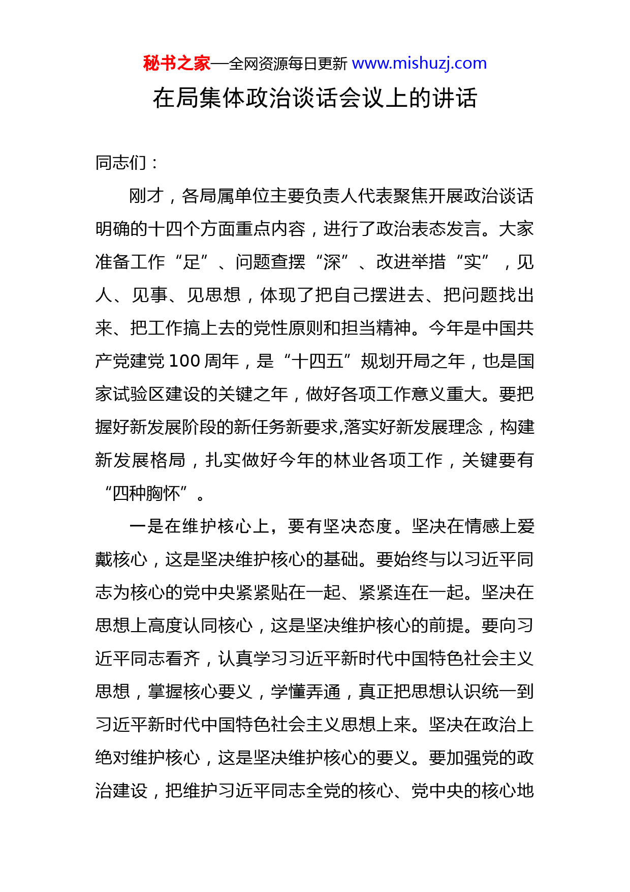 秘书之家—全网资源每日更新www.mishuzj.com在局集体政治谈话会议上的讲话同志们:刚才,各局属单位主要负责人代表聚焦开展政治谈话明确的十四个方面重点内容,进行了政治表态发言。大家准备工作“足”、问题查摆“深”、改进举措“实”,见人、见事、见思想,体现了把自己摆进去、把问题找出来、把工作搞上去的党性原则和担当精神。今年是中国共产党建党100周年,是“十四五”规划开局之年,也是国家试验区建设的关键之年,做好各项工作意义重大。要把握好新发展阶段的新任务新要求,落实好新发展理念,构建新发展格局,扎实做好今年的林业各项工作,关键要有“四种胸怀”。一是在维护核心上,要有坚决态度。坚决在情感上爱戴核心,这是坚决维护核心的基础。要始终与以习近平同志为核心的党中央紧紧贴在一起、紧紧连在一起。坚决在思想上高度认同核心,这是坚决维护核心的前提。要向习近平同志看齐,认真学习习近平新时代中国特色社会主义思想,掌握核心要义,学懂弄通,真正把思想认识统一到习近平新时代中国特色社会主义思想上来。坚决在政治上绝对维护核心,这是坚决维护核心的要义。要加强党的政治建设,把维护习近平同志全党的核心、党中央的核心地秘书之家—全网资源每日更新www.mishuzj.com位作为明确的政治准则和根本的政治要求,汇入血脉、融入骨髓、铸入党性,牢固树立政治意识、大局意识、核心意识、看齐意识,任何时候任何情况下都在政治立场、政治方向、政治原则、政治道路上同以习近平同志为核心的党中央保持高度一致。坚决在组织上自觉服从核心,这是坚决维护核心的根本。这就要求干部群众坚决听党话、感党恩、跟党走,做到党中央提倡的坚决响应、党中央禁止的坚决反对。坚决在行动上紧紧跟随核心,这是坚决维护核心的关键。要精准对表核心,紧紧跟随习近平同志的步伐,保持步调一致、同向同行,做到令行禁止,及时校准行动方向。二是在谋事创业上,要有政治高度。坚持从实际出发。我们想问题、作决策、办事情,必须贯彻党的思想路线,坚持从实际出发,使政策措施和方案意见符合实际情况、符合客观规律、符合科学精神。要观大势,善于在大局中找准定位。只有正确研判形势、把握走势,才能有的放矢做好工作。这就要求我们在谋划思路、推动工作时,要增强战略思维、辩证思维,善于站在全局看局部,着眼长远看当前,切实弄清楚有利条件、不利因素,弄清楚外部环境和内部基础,增强工作前瞻性。要循规律,善于研究规律、把握规律、运用规律。当前,经济发展进入新常态,表现出速度变化、结构优化、动力转换三大特点,增秘书之家—全网资源每日更新www.mishuzj.com长速度要从高速转向中高速,发展方式要从规模速度型转向质量效率型,经济结构调整要从增量扩能为主转向调整存量、做优增量并举,发展动力要从主要依靠资源和低成本劳动力等要素投入转向创新驱动。谋划做好当前各项工作,必须主动适应这些趋势和要求,抓住机遇,顺势而为,破解发展难题,厚植发展优势,在竞争中赢得主动。要接地气,善于汲取群众智慧。人民群众中蕴含着无穷的智慧和力量。要经常深入群众、了解群众,尊重群众和基层的首创精神,使各项工作富于创造性。强化责任担当。牢固树立正确政绩观,不图虚名、不务虚功,脚踏实地、真抓实干,努力创造实实在在的业绩。要坚持实践标准,把实践的标尺牢牢树立起来,多办一些近期能见效的实事好事,多做一些打基础、利长远的实事好事。要把群众满意作为工作的根本标准,按照客观规律和群众意愿创业做事。强化问题导向,敢于正视问题,不回避矛盾,不推诿塞责;善于解决问题,争当改革的促进派、实干家,努力破解体制机制障碍,为经济社会发展扫清道路,注入活力动力。要保持创业激情,始终保持一股冲劲,事业顺利时要满怀信心,遭遇挫折时更要信心坚定,不被困难吓倒,不因挫折屈服,保持战略定力;要有一股韧劲,部署了的任务就咬住不放,以钉钉子精神抓落实,一干到底,不达目标不罢休。要有“功成不必在我”的境界,保持工作的秘书之家—全网资源每日更新www.mishuzj.com连续性,把既定的科学目标、美好蓝图一步一步地变为现实。对党绝对忠诚。对党员干部来讲,做人“实”应有更高的标准、更严的要求。政治上要忠诚可靠。坚定理想信念,做到言行一致、表里如一,以行动表明态度,用实践兑现承诺,决不能对党阳奉阴违,做当面一套背后一套的“两面人”。要有组织观念,遵循组织程序,在涉及重大问题、重要事项时必须按规定向组织请示汇报,这要作为检验干部是否合格的重要标准。工作中要坚持原则。党员干部不能患得患失,奉行好人主义,搞无原则的一团和气。要坚决反对拿原则做交易,反对投机取巧、投机钻营,反对搞小团伙、小圈子。要襟怀坦白、公道正派,以党和人民的事业为重,凡有利于党和人民的事就要干好,不利于党和人民的事坚决不干。带队伍要敢抓敢管。当干部就意味着多一份责任、多一份担当,既要严格管好自己,自重自醒自警自励,也要履职尽责,管好队伍,弘扬清风正气。特别是对干部队伍中出现的苗头性问题,必须强化责任担当,敢于碰硬、敢于较真,坚决同各种歪风邪气作斗争,严肃党内政治生活,努力打造风清气正的从政环境和政治生态。三是在