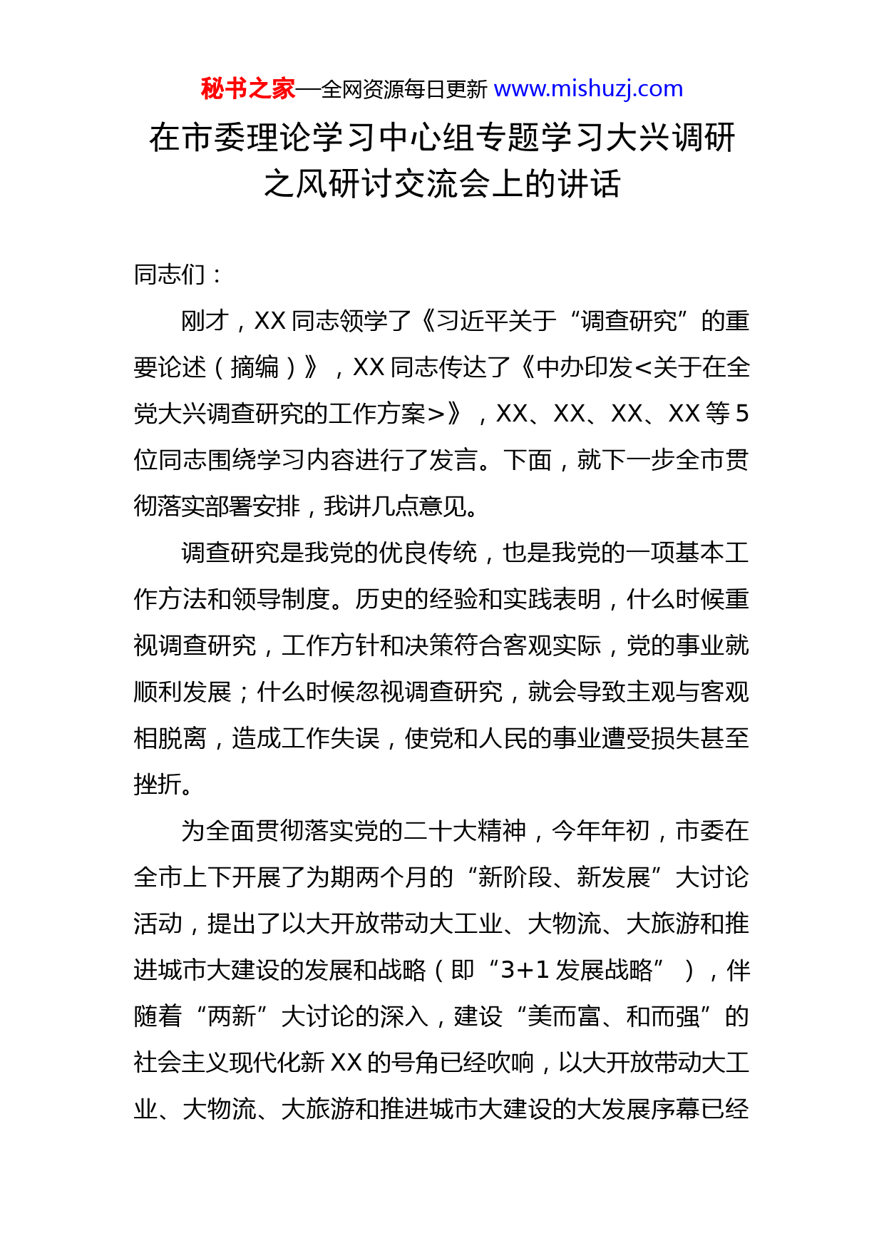 秘书之家—全网资源每日更新www.mishuzj.com在市委理论学习中心组专题学习大兴调研之风研讨交流会上的讲话同志们:刚才,XX同志领学了《习近平关于“调查研究”的重要论述(摘编)》,XX同志传达了《中办印发<关于在全党大兴调查研究的工作方案>》,XX、XX、XX、XX等5位同志围绕学习内容进行了发言。下面,就下一步全市贯彻落实部署安排,我讲几点意见。调查研究是我党的优良传统,也是我党的一项基本工作方法和领导制度。历史的经验和实践表明,什么时候重视调查研究,工作方针和决策符合客观实际,党的事业就顺利发展;什么时候忽视调查研究,就会导致主观与客观相脱离,造成工作失误,使党和人民的事业遭受损失甚至挫折。为全面贯彻落实党的二十大精神,今年年初,市委在全市上下开展了为期两个月的“新阶段、新发展”大讨论活动,提出了以大开放带动大工业、大物流、大旅游和推进城市大建设的发展和战略(即“3+1发展战略”),伴随着“两新”大讨论的深入,建设“美而富、和而强”的社会主义现代化新XX的号角已经吹响,以大开放带动大工业、大物流、大旅游和推进城市大建设的大发展序幕已经秘书之家—全网资源每日更新www.mishuzj.com拉开。大发展呼唤大调研,大发展需要大调研。面对如火如荼大发展的新形势,我认为,大兴调查研究之风十分必要,具有重要的现实意义。一、提高政治站位,深刻领会党中央开展大兴调查研究之风决策部署的重要意义第一,大兴调查研究之风是大发展中科学决策的迫切需要。党的十八大以来,以习近平同志为核心的党中央高度重视调查研究工作,习近平总书记强调指出,调查研究是谋事之基、成事之道,没有调查就没有发言权,没有调查就没有决策权;正确的决策离不开调查研究,正确的贯彻落实同样也离不开调查研究;调查研究是获得真知灼见的源头活水,是做好工作的基本功;要在全党大兴调查研究之风。习近平总书记这些重要指示,深刻阐明了调查研究的极端重要性,为全党大兴调查研究、做好各项工作提供了根本遵循。我们要深刻领会习近平总书记关于“调查研究”的重要论述、重要指示批示精神和党中央决策部署,从战略层面把握、从政治高度考量,全力以赴做好调查研究工作。第二,大兴调查研究之风是大发展中分析新情况、解决新问题的有效途径。当前,我国发展面临新的战略机遇、新的战略任务、新的战略阶段、新的战略要求、新的战略环境。世界百年未有之大变局加速演进,不确定、难秘书之家—全网资源每日更新www.mishuzj.com预料因素增多,国内改革发展稳定面临不少深层次矛盾躲不开、绕不过,各种风险挑战、困难问题比以往更加严峻复杂,迫切需要通过调查研究把握事物的本质和规律,找到破解难题的办法和路径。同样,在全市大发展中,由于各种情况的不同,各种条件环境的变化,各种利益的碰撞,将不可避免地会出现许多复杂的新情况、新问题,需要不断探索和解决。比如,在大工业中,就会遇到资金、技术、销路等方面的新问题。还有大旅游、大物流,虽然我们有一些资源,但真正要把旅游搞起来,让物流动起来,问题和困难也会很多。要探索和解决这些困难和问题,就必须大兴调查研究之风,对每一个项目、每一件事情进行认真细致的调查研究,然后结合实际,找到解决问题的办法。第三,大兴调查研究之风是大发展对领导干部的基本要求。领导干部是党的路线、方针、政策的落实者和执行者,是所辖地区、部门单位各项工作的决策者。可以说,大发展的关键在领导干部,希望也在领导干部。大发展是一项富有挑战性的工作,对领导干部是一次重大的考验。特别是决策工作和对新情况、新问题的分析解决,难度大,要求高,这就要求领导干部必须实事求是,主动开展调查研究,充分掌握第一手情况,“不唯上、不唯书、只唯实,交换、比较、反复”(陈云同志的“15”字思想方法秘书之家—全网资源每日更新www.mishuzj.com和工作方法),提出切实可行的办法和措施。二、明确重点工作,扎实推进党中央开展大兴调查研究之风决策部署的落实落细在全党大兴调查研究,要紧紧围绕全面贯彻落实党的二十大精神、推动高质量发展,直奔问题去,实行问题大梳理、难题大排查,着力打通贯彻执行中的堵点淤点难点,必须重点做好以下几项工作。第一,抓领导,形成领导干部率先垂范搞调研的风气。大兴调研之风,领导干部是关键。各级领导干部都要增强调查研究的紧迫感和责任感。虽然工作忙,但再忙也不能作为不调查研究的借口。要学会“弹钢琴”,从纷繁复杂的事务中解脱出来,减少陪会,减少应酬,带头走下去,到基层去,到群众中去,察民情,访民意,解民难。各级领导干部,一定要按照市委的要求,以身作则,带头下工厂,到农村,进民户,了解大发展中各种新情况新问题,找到解决问题的办法和措施。领导示范就是无声的号召力,只要领导干部走在前、干在前,广大干部群众一定会紧紧跟上,调查研究一定会在全市蔚然成风。第二,抓制度,形成常抓不懈搞调研的长效机制。调查研究是一项经常性的工作,也是一项长期任务。大兴调查研究之风,就要常抓不懈,就要建立健全干部调查研究的制度,使调研工作制度化、规范化。各级机关和领导干秘书之家—全网资源每日更新www.mishuzj.com部要制订调查研究制度和落实措施,要硬性规