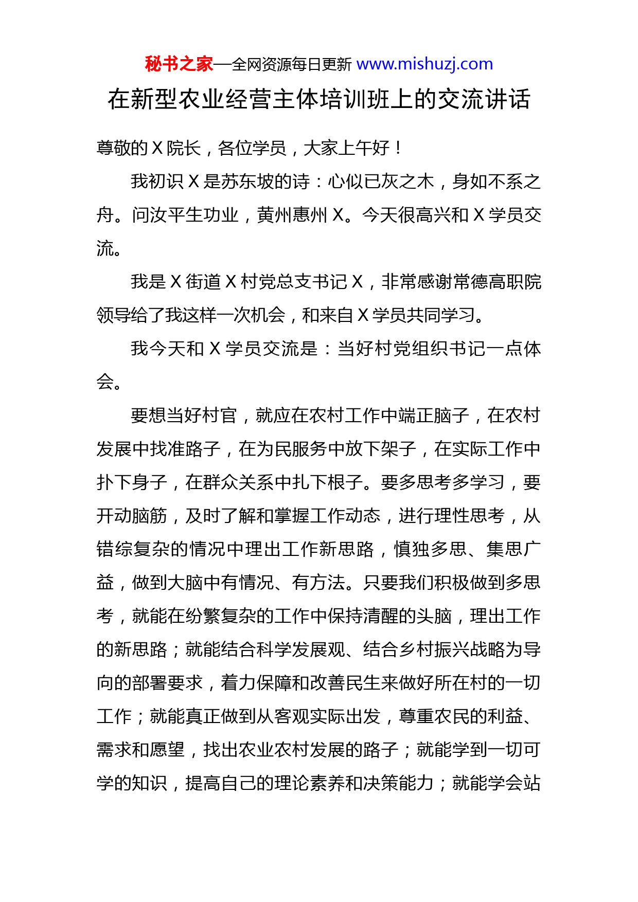 秘书之家—全网资源每日更新www.mishuzj.com在新型农业经营主体培训班上的交流讲话尊敬的X院长,各位学员,大家上午好!我初识X是苏东坡的诗:心似已灰之木,身如不系之舟。问汝平生功业,黄州惠州X。今天很高兴和X学员交流。我是X街道X村党总支书记X,非常感谢常德高职院领导给了我这样一次机会,和来自X学员共同学习。我今天和X学员交流是:当好村党组织书记一点体会。要想当好村官,就应在农村工作中端正脑子,在农村发展中找准路子,在为民服务中放下架子,在实际工作中扑下身子,在群众关系中扎下根子。要多思考多学习,要开动脑筋,及时了解和掌握工作动态,进行理性思考,从错综复杂的情况中理出工作新思路,慎独多思、集思广益,做到大脑中有情况、有方法。只要我们积极做到多思考,就能在纷繁复杂的工作中保持清醒的头脑,理出工作的新思路;就能结合科学发展观、结合乡村振兴战略为导向的部署要求,着力保障和改善民生来做好所在村的一切工作;就能真正做到从客观实际出发,尊重农民的利益、需求和愿望,找出农业农村发展的路子;就能学到一切可学的知识,提高自己的理论素养和决策能力;就能学会站秘书之家—全网资源每日更新www.mishuzj.com在广大农民的角度思考问题,尊重农民的民主权和参与权,想农民之所想,急农民之所急;就能做到清清白白为民,干干净净做事。从而保证广大人民的根本利益,真正实现以人为本。懂得了做群众工作还要多问、多说宣传党的二十大路线、方针、政策、法律法规等,从而使村民自觉维法、守法、执法、用法;在工作中遇到疑难杂症时,要多向上级领导请示、汇报工作,请教有关政策法规,要多向有关方面的专家咨询、征求意见,充分考虑和反映人民群众的愿望和要求,畅通群众诉求渠道,切实贯彻以人为本、执政为民。要懂得如何去做到知民情、解民意、如民愿、得民心。党中央特别重视三农问题,特别是二十大以来提出的乡村振兴战略,对于中国的乡村是一个难得的契机,我们要好好把握国家政策,发展壮大集体经济,我们村通过多年努力,成立了澧县高路铺农业旅游公司,准备把村里高效农业产业园,小微企业产业园,传统历史红色文化,美乡村幸福屋场,乡村文化广场,串珠成联,打造旅游景区,增加村集体收入,同时也要发展电商直播间,借助网络的东风让我们的农产品走出去。农村是真正看得见山,望得见水,改变村容村貌后,建设好美丽宜居村庄,让农民倍受鼓舞,我们就应该以主人秘书之家—全网资源每日更新www.mishuzj.com翁的姿态来建设自己的家园,作为一名基层党组织书记更要在乡村振兴中发挥重要作用,为家乡的发展贡献自己的一份力量。今天很浅显和大家交流到这里,最后我用苏东坡的诗送给X学员“他年谁作舆地志,X万里真吾乡!欢迎各位学员再到常德做客,到澧县高路铺村旅游观光,指导工作!