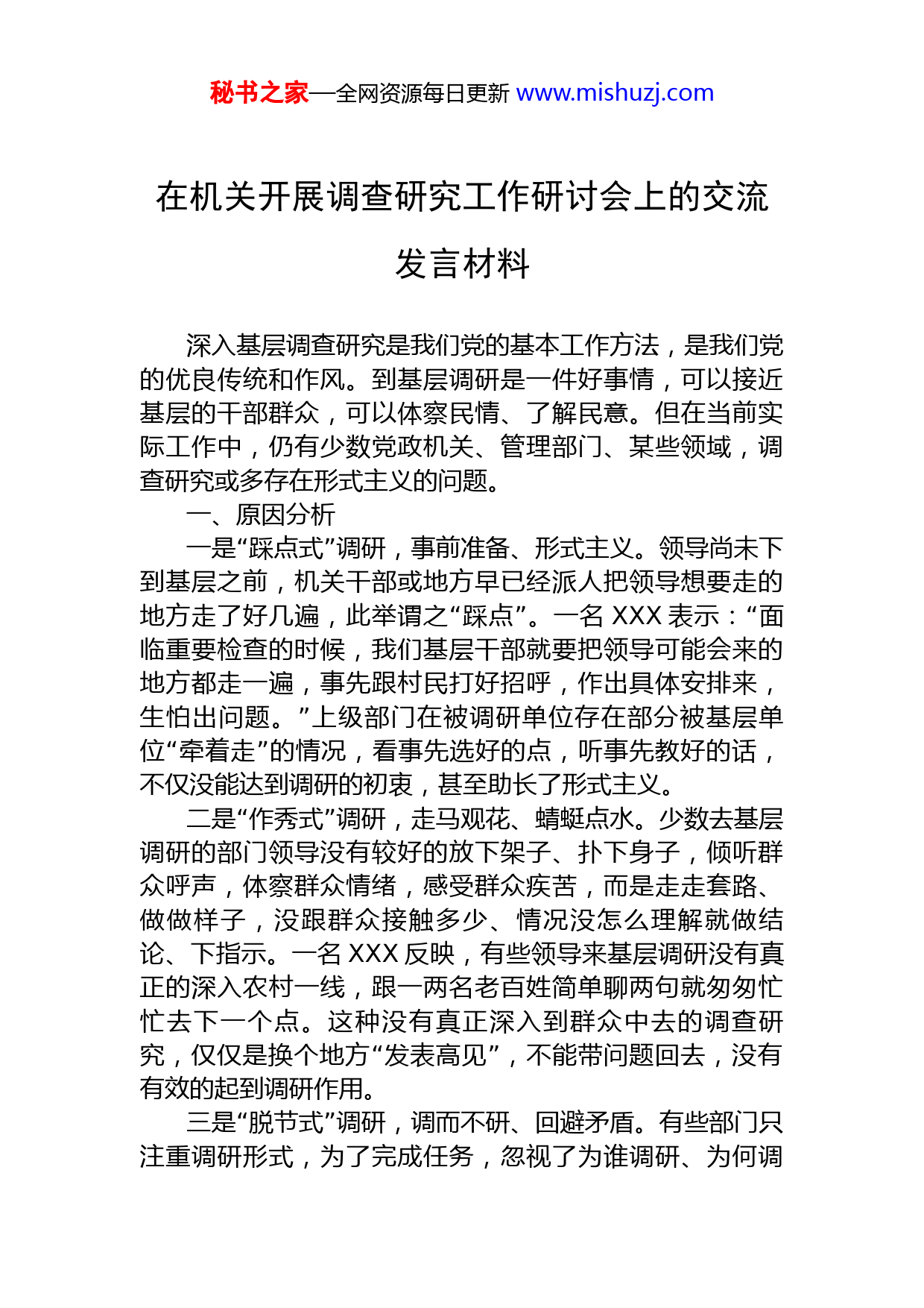 秘书之家—全网资源每日更新www.mishuzj.com在机关开展调查研究工作研讨会上的交流发言材料深入基层调查研究是我们党的基本工作方法,是我们党的优良传统和作风。到基层调研是一件好事情,可以接近基层的干部群众,可以体察民情、了解民意。但在当前实际工作中,仍有少数党政机关、管理部门、某些领域,调查研究或多存在形式主义的问题。一、原因分析“”一是踩点式调研,事前准备、形式主义。领导尚未下到基层之前,机关干部或地方早已经派人把领导想要走的“”地方走了好几遍,此举谓之踩点。一名XXX“表示:面临重要检查的时候,我们基层干部就要把领导可能会来的地方都走一遍,事先跟村民打好招呼,作出具体安排来,”生怕出问题。上级部门在被调研单位存在部分被基层单“”位牵着走的情况,看事先选好的点,听事先教好的话,不仅没能达到调研的初衷,甚至助长了形式主义。“”二是作秀式调研,走马观花、蜻蜓点水。少数去基层调研的部门领导没有较好的放下架子、扑下身子,倾听群众呼声,体察群众情绪,感受群众疾苦,而是走走套路、做做样子,没跟群众接触多少、情况没怎么理解就做结论、下指示。一名XXX反映,有些领导来基层调研没有真正的深入农村一线,跟一两名老百姓简单聊两句就匆匆忙忙去下一个点。这种没有真正深入到群众中去的调查研“”究,仅仅是换个地方发表高见,不能带问题回去,没有有效的起到调研作用。“”三是脱节式调研,调而不研、回避矛盾。有些部门只注重调研形式,为了完成任务,忽视了为谁调研、为何调秘书之家—全网资源每日更新www.mishuzj.com研。部分基层同志反映,我们每次都很期待上级调研能够真正的把我们所解决不了的问题带回去帮我们解决或者提供解决办法,但有时候向上反馈了问题却得不到意见建议。这种调研发现了问题但不能帮助基层解决问题,就等“”于不处理、不反馈,只把脉、不开方,导致调查前后一个样。“”四是框框式调研,先入为主、刻舟求剑。有的上级部门带着框子找例子,带着论点找论据,把调查研究变成结论的预设。有的上级部门下基层调研时带着老思想,对基层新转变、新情况、新创造挖掘不够。比如,一些XXX同志下基层调研时以过去的老经验、老方法指出基层问题,但没贴合新时代的背景,带给基层的意见建议不能有效的帮助基层解决问题。调查研究如果是带着结果找例子或者还停留在原先的思维方式中,束缚在原先的话语体系里,局限于原先的方法上,就不能帮助基层,去解决问题。二、意见建议一要从问题出发,号准脉。调查研究的目的是发现和解决问题,各级调研前要结合主责主业,确定调研课题,通过座谈交流、谈心谈话、线上征集、留言等形式,对群众反映的问题进行梳理汇总,制定问题清单、项目清单;围绕调研课题,提前搜集相关背景资料,拟定具体调研方案,在确定调研点位时,要坚持唯实求真,强化问题意识,既安排具有典型性经验的地区、单位、项目,也要调研自然条件差、工作基础差、情况复杂困难大、群众意见比较多的地方,尽量减少主观因素影响。二要走群众路线,察实情。我们党为人民而生,因人民“”而兴,调查研究的出发点和落脚点都应在为民二字上,“”“”下基层调查不仅要身入基层,更要心入基层,要转换角色、走进群众,了解群众的烦心事操心事揪心事,帮助解决群众最关心最直接的现实问题。只有这样,才能真正和群众坐在一条板凳上,才能真正获得群众信任,增进群秘书之家—全网资源每日更新www.mishuzj.com众感情,赢得民心民意。三要重结果运用,促提升。三分调查,七分研究。只调查不研究,调研结果便无法得到升华,只研究不运用,便违背了调研的初衷,失去了调研的意义。为此,要做深做“”细调研的后半篇文章,要用好调查所得的一手资料,精心梳理分析,把握好全局和局部、当前和长远、宏观和微观、主要矛盾和次要矛盾、特殊和一般的关系,由表及里,以点及面,透过现象看本质,把握规律性东西,形成解决问题、促进工作的思路办法和政策举措。