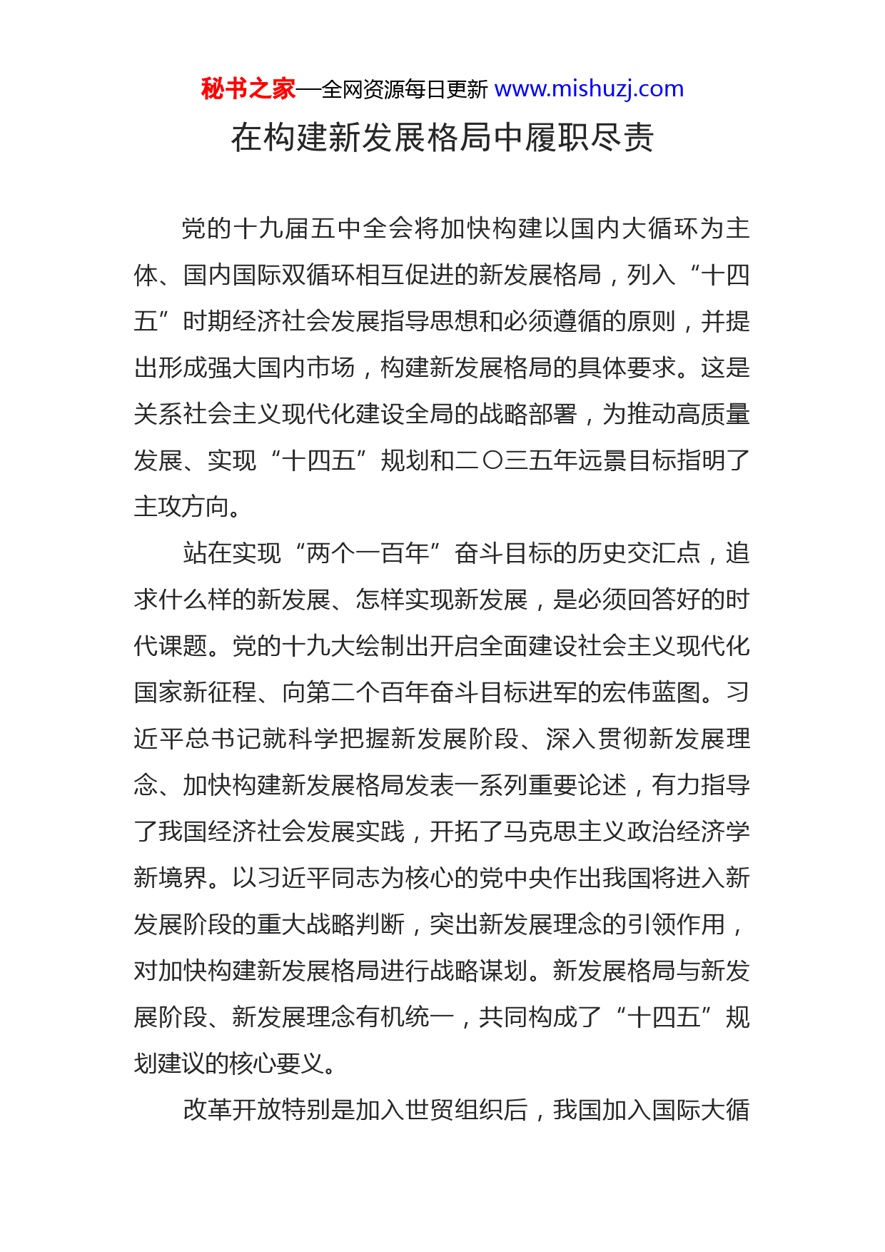 秘书之家—全网资源每日更新www.mishuzj.com在构建新发展格局中履职尽责党的十九届五中全会将加快构建以国内大循环为主体、国内国际双循环相互促进的新发展格局,列入“十四五”时期经济社会发展指导思想和必须遵循的原则,并提出形成强大国内市场,构建新发展格局的具体要求。这是关系社会主义现代化建设全局的战略部署,为推动高质量发展、实现“十四五”规划和二〇三五年远景目标指明了主攻方向。站在实现“两个一百年”奋斗目标的历史交汇点,追求什么样的新发展、怎样实现新发展,是必须回答好的时代课题。党的十九大绘制出开启全面建设社会主义现代化国家新征程、向第二个百年奋斗目标进军的宏伟蓝图。习近平总书记就科学把握新发展阶段、深入贯彻新发展理念、加快构建新发展格局发表一系列重要论述,有力指导了我国经济社会发展实践,开拓了马克思主义政治经济学新境界。以习近平同志为核心的党中央作出我国将进入新发展阶段的重大战略判断,突出新发展理念的引领作用,对加快构建新发展格局进行战略谋划。新发展格局与新发展阶段、新发展理念有机统一,共同构成了“十四五”规划建议的核心要义。改革开放特别是加入世贸组织后,我国加入国际大循秘书之家—全网资源每日更新www.mishuzj.com环,形成了市场和资源“两头在外”、形成“世界工厂”的发展模式。随着近年来外部环境和我国发展所具有的要素禀赋的变化,国际大循环动能明显减弱,而我国内需潜力不断释放,国内大循环活力日益强劲,必须充分发挥国内超大规模市场优势,通过繁荣国内经济、畅通国内大循环为经济发展增添动力。当前我国发展仍然处于重要战略机遇期,但面临的国内外环境正在发生深刻复杂变化。经济全球化遭遇逆流,单边主义、保护主义上升,新冠肺炎疫情带来广泛而深远的影响,世界面临的不稳定性不确定性更加突出。我国已转向高质量发展阶段,正处在转变发展方式、优化经济结构、转换增长动力的攻关期,通过发挥内需潜力、强化国内经济大循环,能够使国内市场和国际市场更好联通,更好利用国际国内两个市场、两种资源。构建新发展格局,彰显了我们党对经济发展客观规律的深刻认识和科学把握,是以习近平同志为核心的党中央根据我国发展阶段、环境、条件变化作出的重大决策部署,是把握发展主动权的先手棋、赢得发展新优势的大布局。这是主动作为,不是被动应对;是长期战略,不是权宜之计。新发展格局也决不是封闭的国内循环,而是开放的国内国际双循环。第三届中国国际进口博览会被称为双循环秘书之家—全网资源每日更新www.mishuzj.com的重要窗口,众多企业将携带新产品、新技术、新服务进行“全球首发、中国首展”。从长远看,我国在世界经济中的地位将持续上升,同世界经济的联系会更加紧密,为其他国家提供的市场机会将更加广阔,成为吸引国际商品和要素资源的巨大引力场。国内循环是建立在全国统一大市场基础上的大循环,不是各地自我封闭的小循环。大国经济的优势就是内部可循环。我国有14亿人口,人均国内生产总值已经突破1万美元,是全球最大最有潜力的消费市场,蕴含着巨大增长空间。要充分发挥超大规模市场优势,打通从生产、分配到流通、消费等诸多环节的堵点,形成需求牵引供给、供给创造需求的更高水平动态平衡。充分发挥改革的突破和先导作用,依靠改革破除发展瓶颈、汇聚发展优势、增强发展动力,切实转变发展方式,推动质量变革、效率变革、动力变革。秉纲而目自张,执本而末自从。面对错综复杂的国际形势、艰巨繁重的国内改革发展稳定任务,五中全会对如何构建新发展格局提出明确要求。构建新发展格局、实现高质量发展,首要的是坚持扩大内需这个战略基点。要加快培育完整内需体系,把实施扩大内需战略同深化供给侧结构性改革有机结合起来,以创新驱动、高质量供给引领和创造新需求。要加快科技自秘书之家—全网资源每日更新www.mishuzj.com立自强,加强关键核心技术攻关,以科技创新催生新发展动能,实现依靠创新驱动的内涵型增长。要推动产业链供应链优化升级,维护产业链供应链的安全稳定。要全面实施乡村振兴战略,强化以工补农、以城带乡,推动形成工农互促、城乡互补、协调发展、共同繁荣的新型工农城乡关系,加快农业农村现代化。要优化收入分配结构,扩大中等收入群体,建设现代流通体系,优化消费环境,促进消费升级,为高质量发展注入强劲动力。要牢牢守住安全发展底线,把安全发展贯穿国家发展各领域和全过程,防范和化解影响我国现代化进程的各种风险,筑牢国家安全屏障。把握新发展阶段、贯彻新发展理念、构建新发展格局,对新时代纪检监察工作提出了更高要求。纪检监察机关要深刻理解党中央因时因势作出的重大战略决策,准确把握关于构建新发展格局的部署要求,对国之大者心中有数,自觉在大局大势下思考谋划工作,充分发挥监督保障执行、促进完善发展作用,更好服务党和国家工作大局。要紧紧围绕贯彻新发展理念、推动高质量发展、构建新发展格局等重大决策部署,跟进监督、精准监督。要监督各方面责任的落实,督促各级党委政府落实属地责任、主体责任,督促各有关部门落实监管责任、工作责任,督促党员领导干部强化责任