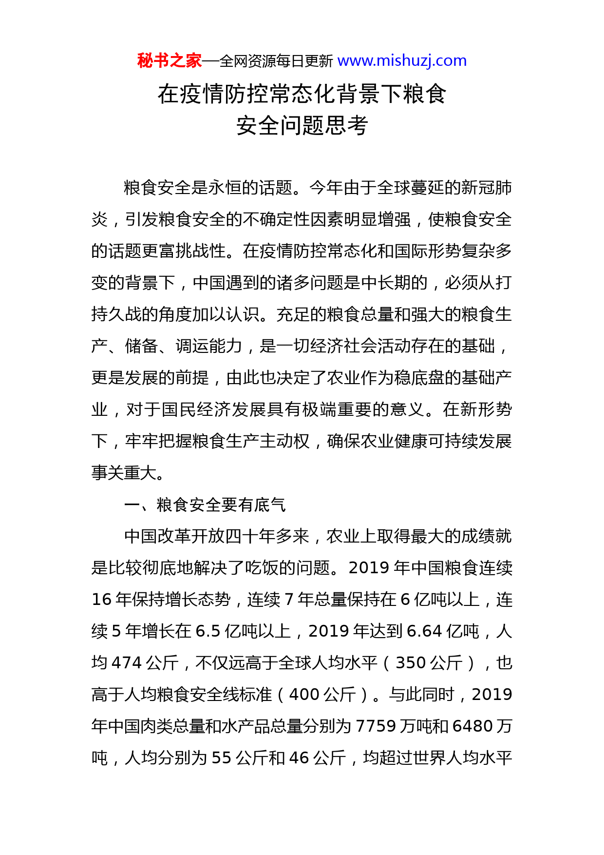 秘书之家—全网资源每日更新www.mishuzj.com在疫情防控常态化背景下粮食安全问题思考粮食安全是永恒的话题。今年由于全球蔓延的新冠肺炎,引发粮食安全的不确定性因素明显增强,使粮食安全的话题更富挑战性。在疫情防控常态化和国际形势复杂多变的背景下,中国遇到的诸多问题是中长期的,必须从打持久战的角度加以认识。充足的粮食总量和强大的粮食生产、储备、调运能力,是一切经济社会活动存在的基础,更是发展的前提,由此也决定了农业作为稳底盘的基础产业,对于国民经济发展具有极端重要的意义。在新形势下,牢牢把握粮食生产主动权,确保农业健康可持续发展事关重大。一、粮食安全要有底气中国改革开放四十年多来,农业上取得最大的成绩就是比较彻底地解决了吃饭的问题。2019年中国粮食连续16年保持增长态势,连续7年总量保持在6亿吨以上,连续5年增长在6.5亿吨以上,2019年达到6.64亿吨,人均474公斤,不仅远高于全球人均水平(350公斤),也高于人均粮食安全线标准(400公斤)。与此同时,2019年中国肉类总量和水产品总量分别为7759万吨和6480万吨,人均分别为55公斤和46公斤,均超过世界人均水平秘书之家—全网资源每日更新www.mishuzj.com的12公斤和23公斤。中国用世界10%的耕地资源和6%的水资源,养活了世界20%的人口,提供了25%以上的粮食和重要农产品产量。而且,中国农业产业结构、产品结构不断优化,满足了城乡居民对农产品的多元化需求,成绩令世人瞩目。当然,作为全球最大的农产品消费国,中国也是全球最大的农产品进口国。2019年中国进出口农产品贸易额为2301亿美元,其中出口额为791亿美元,主要包括蔬菜、养殖水产品、茶叶等特色农产品,进口额为1510亿美元,主要是大豆、棉花、油料等资源性农产品,农产品贸易逆差达719亿美元。尽管中国是全球最大的农产品进口国,但令人庆幸的是,进口农产品的目的是解决吃好的问题。包括玉米、小麦、水稻(大米)在内的谷物,年度间净进口最高未超过2000万吨,占比不超过中国粮食生产总量的5%。2019年玉米、小麦、水稻净进口810万吨,仅占粮食总量6.64亿吨的1.2%。而中国的口粮——大米、小麦,去年净进口330万吨,只占粮食总量的0.5%,中国“谷物基本自给、口粮绝对安全”的粮食安全观得到了充分体现。在吃饭问题上,靠中国供给解决中国需求,靠中国资源解决中国问题,这就是中国最大的底气。二、粮食安全意义重大习近平总书记反复强调,悠悠万事吃饭为大。只要粮秘书之家—全网资源每日更新www.mishuzj.com食不出大问题,中国的事就稳得住。中国人的饭碗要牢牢端在自己手里,中国人的饭碗必须装中国人自己的粮食。深刻表明,只要手里有粮,心里就不慌。在不稳定不确定性增多的外部环境下,确保农业基础牢固,稳定粮食总量,口粮不仰仗别人事关重大。农产品总量,特别是粮食总量保障,在今天体现了农业供给侧结构性改革的要求,决定了应对复杂多变局面的底气,奠定了中国现代化进程的坚实基础。1.粮食安全体现了农业供给侧结构改革的要求。现代农业发展到今天,城乡居民对农产品的需求不仅仅表现出总量和数量的需求,同时也呈现多元、绿色、品质化要求,这本身也是农业供给侧结构性改革的目标。事实上,改革开放以来,现代农业发展在中国的实践呈现出纵横两方面的变化趋势,从纵的方向观察,产业转型升级,产业结构和产品结构不断优化,但总量一直是衡量发展成功与否的最重要标志。1978年粮食总量只有3.04亿吨,2019年中国在粮食总量达到6.64亿吨历史新高的同时,畜禽、水产、果蔬产业的总量一直呈线性增长之势。1978年中国的水果产量只有657万吨,按当时人口9.6亿计算,人均不到7公斤;而2019年水果总量则达2.74亿吨,人均高达196公斤。其中,香蕉产量在1978年为8.5万吨,2019年达到1166万吨。农业各产业的数量增长,最大限度地满秘书之家—全网资源每日更新www.mishuzj.com足了城乡居民对食物的多元化、高端化、品牌化、绿色化需求,其基础来自粮食总量的稳定增长。从横的方向观察,正因为粮食有足够安全的总量保障,其他农产品产出稳定,农业的多重功能才得到充分释放,绿色成为新的发展理念。农产品加工业、观光旅游休闲业以及“互联网+”等各种新产业、新业态发展呈现出方兴未艾之势,农工、农贸、农旅、农文融合的乡村产业发展才有了坚实基础。2.粮食安全奠定了中国现代化进程坚实的基础。2020年是全面建成小康社会之年,尽管新冠疫情极大地增加了中国迈向现代化征程中的不确定性,但中国现代化目标不会有丝毫动摇,到21世纪中叶,把中国建成富强民主文明和谐美丽社会主义现代化强国的要求不会有丝毫改变。中央明确提出要坚持底线思维,从“六稳”到“六保”,进而提出要逐步形成以国内循环为主,国内国际双循环相互促进的新发展格局,中央对形势的把控思路十分清晰,为下一步的发展指明了方向,而确保农产品特别是粮食总量安全是促进新格局形成的最坚实保障。为了应对新冠肺炎疫情,中央对农业的要求更加聚焦,就是增产保供,确保各种农产品充分供给。简言之,解决好生存问题,就有了发展的基础,除此之外,一起都是空言。3.粮食安全决定了应对复杂多变环境的底气。不可否认,当前国际形势陡然变化,不确定性因素大大增加,中秘书之家—全网资源每日更新www.mishuzj.com国