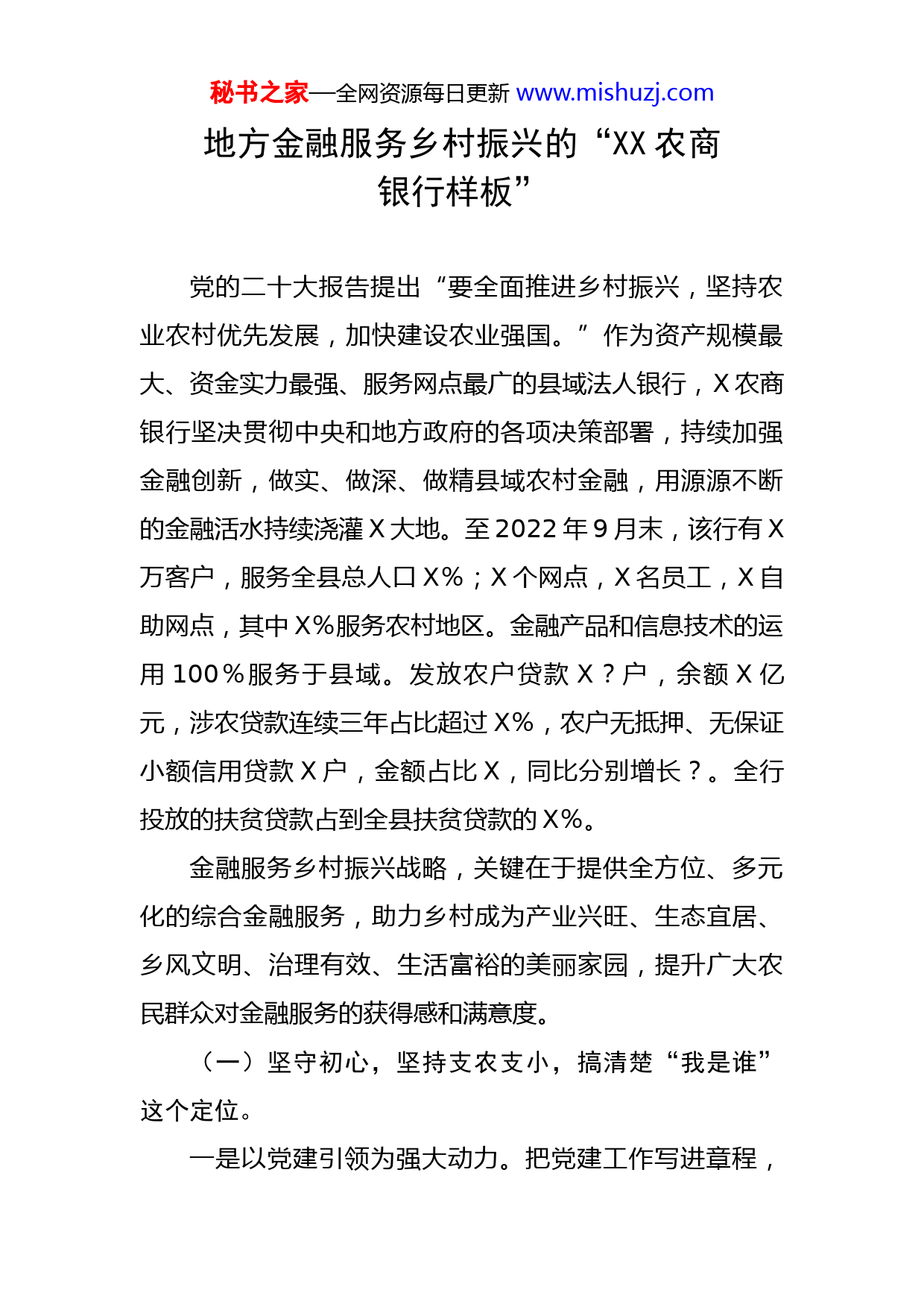 秘书之家—全网资源每日更新www.mishuzj.com地方金融服务乡村振兴的“XX农商银行样板”党的二十大报告提出“要全面推进乡村振兴,坚持农业农村优先发展,加快建设农业强国。”作为资产规模最大、资金实力最强、服务网点最广的县域法人银行,X农商银行坚决贯彻中央和地方政府的各项决策部署,持续加强金融创新,做实、做深、做精县域农村金融,用源源不断的金融活水持续浇灌X大地。至2022年9月末,该行有X万客户,服务全县总人口X%;X个网点,X名员工,X自助网点,其中X%服务农村地区。金融产品和信息技术的运用100%服务于县域。发放农户贷款X?户,余额X亿元,涉农贷款连续三年占比超过X%,农户无抵押、无保证小额信用贷款X户,金额占比X,同比分别增长?。全行投放的扶贫贷款占到全县扶贫贷款的X%。金融服务乡村振兴战略,关键在于提供全方位、多元化的综合金融服务,助力乡村成为产业兴旺、生态宜居、乡风文明、治理有效、生活富裕的美丽家园,提升广大农民群众对金融服务的获得感和满意度。(一)坚守初心,坚持支农支小,搞清楚“我是谁”这个定位。一是以党建引领为强大动力。把党建工作写进章程,秘书之家—全网资源每日更新www.mishuzj.com落实党组织在公司治理结构中法定地位,为服务乡村振兴提供政治保证。切实增强“四个意识”,推进党建与服务乡村振兴战略融合发展,把党建工作激发的活力转化为服务乡村振兴战略的强大动力,先后X次修订“三重一大”决策制度实施办法,确保党委有效参与重大决策,为服务乡村振兴提供组织保证。坚持党管干部不动摇,近年来,提拔X名懂农业、爱农村、爱农民的优秀年轻员工到领导岗位,其中过半数为共产党员,为服务乡村振兴提供人才保证。二是以姓农姓土为核心定位。坚持把更多的金融资源配置到乡村发展的重点领域和薄弱环节,更好地满足乡村振兴多样化的金融需求,是农商行责无旁贷的历史使命和责任担当。深入贯彻回归本源的监管要求,围绕重点领域和主导产业,持续加大融资支持力度和信贷资源倾斜,发挥长期积淀的“草根银行”优势。在战略定位上,将“支农支小、做小做散”作为普惠金融的核心定义,坚持深耕本土和错位经营。积极稳妥创新服务模式和服务流程,主动构建覆盖区域内所有农民、居民、小微企业的普惠化服务体系,不断提升乡村金融服务的可获得性和便利性。三是以做小做散为明确导向。设定X万元以上大额贷款占全部贷款比例逐年下降的措施,在宏观层面上约束大额贷款增长。落实“小额更便捷、大额更规范”原则,对秘书之家—全网资源每日更新www.mishuzj.com小额贷款采取降低门槛、缩短流程、简便手续等措施,同时对大额贷款试行严格管控,建立综合授信制度并实行大额贷款准入退出办法,在机制层面上推动“控大做小”。推出大额贷款和小额贷款的差异化薪酬定价、差异化审查标准,并加大增量扩面的考核力度,在执行层面上使措施得以落实。(二)找准抓手,分层分类营销,解决好“服务谁”这个问题。一是开展网格营销。在全县扎实推进网格化营销,根据地理位置、网点性质和网点资源能力划分X个二级实体网格和X个二级虚拟网格。在XX等全县X家网点率先开展网格化营销试点,按过程和结果两个维度对客户进行精准营销,在立足县域、深耕本土前提下,稳步推进网点、客户和服务布局。二是致力精准帮促。以发放扶贫小额贷款为切入点,向建档立卡贫困户发放小额信用贷款,助推县域经济薄弱村、低收入人口脱贫致富奔小康。至9月末,发放扶贫贷款X户X万元。同时,扎实开展帮促活动,组织党员干部结对帮扶、走访慰问,巩固脱贫攻坚成果和乡村振兴有效衔接。三是打造零售银行。坚持以服务实体经济为主线,围绕“优、小、散”经营战略,要求客户经理主动进村入秘书之家—全网资源每日更新www.mishuzj.com户、进园入企,并发挥绩效考核指挥棒导向作用,调动全员营销积极性,推动全行贷款向“小额面广”转变。搭建网格化营销管理平台,实现全县网格全覆盖,组织客户经理计划利用三年时间进行动态走访、批量维护,最大限度挖掘客户资源,实现营销总户数不低于X万户目标。同时发力小微金融、消费金融和社区金融,加大产品研发,形成系列化的消费金融产品、体系化的财富管理产品和综合化的社区便民产品,实现专业化经营。(三)内外联动,加强队伍建设,想明白“依靠谁”这个关键。一是加强客户经理队伍建设。坚持人力资源向一线倾斜,持续提高客户经理人数占比,将素质高、业务强、作风实的人员优先充实到客户经理队伍中,为全面服务乡村振兴战略提供有效的人力资源保障。优化客户经理队伍,推行客户经理网格化管理模式,完善客户经理绩效考核办法,强化管户考核,引导客户经理主动上门营销,让各类农业经营主体实现从“找资金发展”到“资金主动上门”。编制和优化遍及城乡的客户经理服务网络,把服务触角延伸到辖内每个角落,实现全覆盖。计划用三年时间推进落实“X”战略,即建档率达X%、授信面达X%、签约率达X%,提高小微企业和广大农户申贷获得率。二是壮大村级服务联络员。在全县甄选X名农村公认秘书之家—全网资源每日更新www.mishuzj.com具有威望、深受村民信任的人员,特聘为我行村组联络员,帮助了解当地农户金融服务需求,更好的协助开展信息