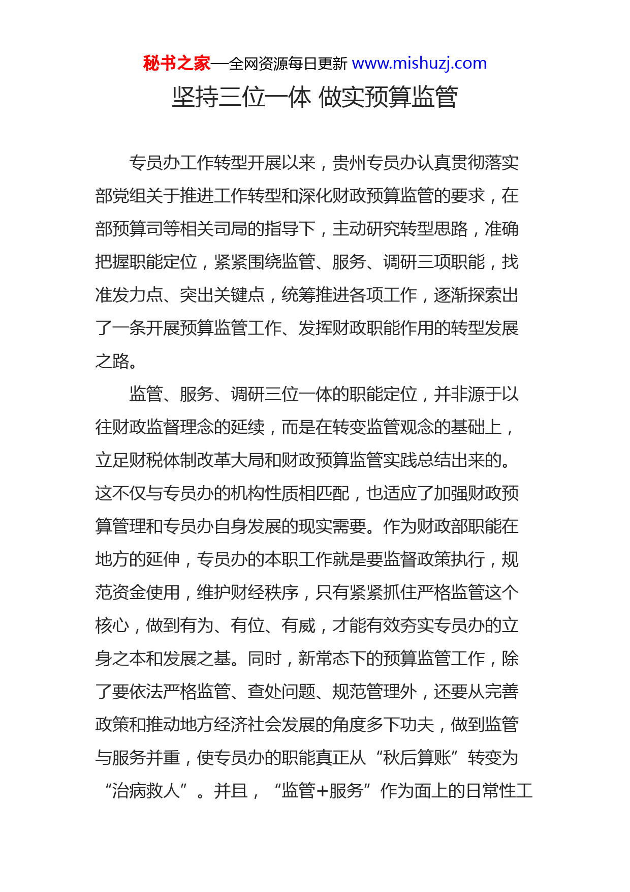 秘书之家—全网资源每日更新www.mishuzj.com坚持三位一体做实预算监管专员办工作转型开展以来,贵州专员办认真贯彻落实部党组关于推进工作转型和深化财政预算监管的要求,在部预算司等相关司局的指导下,主动研究转型思路,准确把握职能定位,紧紧围绕监管、服务、调研三项职能,找准发力点、突出关键点,统筹推进各项工作,逐渐探索出了一条开展预算监管工作、发挥财政职能作用的转型发展之路。监管、服务、调研三位一体的职能定位,并非源于以往财政监督理念的延续,而是在转变监管观念的基础上,立足财税体制改革大局和财政预算监管实践总结出来的。这不仅与专员办的机构性质相匹配,也适应了加强财政预算管理和专员办自身发展的现实需要。作为财政部职能在地方的延伸,专员办的本职工作就是要监督政策执行,规范资金使用,维护财经秩序,只有紧紧抓住严格监管这个核心,做到有为、有位、有威,才能有效夯实专员办的立身之本和发展之基。同时,新常态下的预算监管工作,除了要依法严格监管、查处问题、规范管理外,还要从完善政策和推动地方经济社会发展的角度多下功夫,做到监管与服务并重,使专员办的职能真正从“秋后算账”转变为“治病救人”。并且,“监管+服务”作为面上的日常性工秘书之家—全网资源每日更新www.mishuzj.com作,其工作成效的体现还必须紧紧抓住调查研究这个关键,只有不断形成有份量的调研报告供决策部门参考,才能将监管和服务的工作亮点凸显出来,从而为财政预算监管工作提供有力的支撑。因此,在三项重点职能中,严格监管是核心,周到服务是基础,深入调研是亮点。今年上半年,我们正是紧紧抓住了这三条主线,不断增强干部职工严格监管、周到服务、深入调研的水平与能力,努力将职能转型和预算监管工作抓实、抓细、抓出实效。一、以严格监管为核心,做好财政资金的“守护人”加强财政预算监管,是专员办的立身之本和发展之基。为了将财政部赋予的监管职责落实到位,我们在监管内容、方法、重心和人力安排等方面与加强财政预算监管的要求进行了全方位衔接。在监管内容上,坚持以推动属地中央预算单位和中央转移支付预算编制和执行全过程的监管为统领,补强绩效评价监管和重大项目监管内容,充实收入监管中对税种、税源跟踪监测和地方债务的日常监管,研究优化企业财务会计信息监督机制,并根据贵州省重点民生领域和监管热点问题追加了调研课题,确保在面上落实好“两个全覆盖”的要求。同时,还着重对部里下达的工作计划中的重点事项实施监管,做到点面结合、突出重点。在监管方法上,在预算监管框架全面搭建起来的基础上,采取深浅结合、以点带面的工作方法,起步阶段主要在重秘书之家—全网资源每日更新www.mishuzj.com点监管事项和重点调研课题上发力,确保抓出精品成果,为整体转型工作鼓劲提气。在此基础上,坚持以点带面,不断积累经验,在实践中总结预算监管的有效路径。例如,高质量完成财政部统一组织的基层医疗卫生机构补偿机制调查和盘活财政存量资金专项检查,提出数十条政策建议,取得了很好的效果;此外,在城乡养老保险补助资金和文产资金审核中,我们总结归纳了“量化分析”的工作方法,有效提高了监管工作质效,目前正逐步推广用于其他审核工作中去。在监管重心上,我们以事前审核和事中监控为主,以事后检查为辅。以非现场审核监控为主,以现场审核检查为辅,有限的事后检查既查处问题,更立足于为事前、事中监管服务,为制定和完善政策服务。在监管人力上,通过加大外引内调、上挂下派的力度,为预算监管工作的顺利开展提供最佳的人力资源配置。二、以周到服务为基础,做好监管对象的“贴心人”监管的目的不仅在于查处违规问题,更在于及时发现政策执行中的问题并提出合理化意见和建议,为政策制定和完善提供依据,即寓服务于监管之中。为此,我们力争从三个维度不断提升服务质量。一是服务部内司局。作为财政部职能在地方的延伸,我们充分发挥专员办就地监管的优势和作用,主动将财政预算监管嵌入财政主体业务之中,并借助与部内相关司局建立的沟通联系渠道,坚持在秘书之家—全网资源每日更新www.mishuzj.com依法监管、查处问题的同时,加大请示汇报力度,及时反馈工作情况,主动为部内业务司局提供财政改革发展的意见和建议。二是服务中央单位。一方面,分批次、分范围组织中央驻黔预算单位召开了多次联席会议,介绍我办职能转型情况,牵头调研中央单位车改工作方案,通报津补贴改革相关精神,并就拟定的有关监管操作规程广泛征求预算单位的意见等,切实发挥好多维度的服务功能。另一方面,坚持原则性和灵活性相结合,在定期发布监管工作中发现的违规问题和注意事项的同时,认真听取中央驻黔基层预算单位的建议诉求,并充分利用qq群、微信平台、电话回访等多种方式与中央单位加强日常联络,做到监管与服务并重。三是服务地方发展。作为西部欠发达地区,中央的政策和资金支持是贵州省实现后发赶超、同步小康的重要支撑。在监管工作中,我们始终将财政部的中心工作与贵州省委省政府关注的重点、热点问题相结合,通过与财政部业务司局建立经常性沟通机制,主动架起财政部和贵州省之间的“连心桥”,帮助地方用足、
