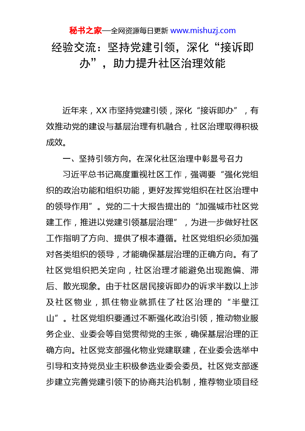 秘书之家—全网资源每日更新www.mishuzj.com经验交流:坚持党建引领,深化“接诉即办”,助力提升社区治理效能近年来,XX市坚持党建引领,深化“接诉即办”,有效推动党的建设与基层治理有机融合,社区治理取得积极成效。一、坚持引领方向,在深化社区治理中彰显号召力习近平总书记高度重视社区工作,强调要“强化党组织的政治功能和组织功能,更好发挥党组织在社区治理中的领导作用”。党的二十大报告提出的“加强城市社区党建工作,推进以党建引领基层治理”,为进一步做好社区工作指明了方向、提供了根本遵循。社区党组织必须加强对各类组织的领导,才能确保基层治理的正确方向。有了社区党组织把关定向,社区治理才能避免出现跑偏、滞后、散光现象。由于社区居民接诉即办的诉求半数以上涉及社区物业,抓住物业就抓住了社区治理的“半壁江山”。社区党组织要通过不断强化政治引领,推动物业服务企业、业委会等自觉贯彻党的主张,确保基层治理的正确方向。社区党支部强化物业党建联建,在业委会选举中引导和支持党员业主积极参选业委会委员。社区党支部逐步建立完善党建引领下的协商共治机制,推荐物业项目经秘书之家—全网资源每日更新www.mishuzj.com理担任社区“两委”兼职委员实现双向交叉任职,常态化开展沟通协商,有力保障了物业服务管理工作顺畅运转。二、注重创新机制,依托区域化党建提升组织力“上面千条线、底下一根针。”社区自身资源有限,如何依托区域化党建平台整合各类资源力量、共同推动社区治理是摆在社区党组织面前的“必答题”。破解社区“小马拉大车”困境,关键在于统筹资源、系统建设,健全共建共治共享机制利用党建工作协调委员会最大限度整合驻区单位资源,打造社区党建“同心圆”。为更好地解决问题,社区依托党建工作协调委员会,探索形成“社区治理合伙人机制”最大限度盘活区域党建资源,形成了六方共治的良好局面。其中,社区党委为“主心骨”、居委会为“组织者”、业主为“当家人”、物业公司为“大管家”、政府职能部门为“后援团”、辖区单位为“共建者”。六方主体协商制定《社区治理合伙人公约》,合理明确各自的权利和义务,健全议事协商制度,久拖不决的电梯停运等难题迎刃而解。三、积极搭建平台,增强党在新业态新就业群体中的凝聚力近年来,以平台经济为代表的新业态蓬勃兴起,聚集了大量新就业群体。XX市积极开展新业态新就业群体党建工作试点,推动新就业群体由“管理变量”向“治理增秘书之家—全网资源每日更新www.mishuzj.com量”转换,成为社区治理的新生力量。主动构建新就业群体诉求表达机制,发动辖区内流动党员党支部的党员主动收集意见建议,集中破解物流快递“四难”问题。破解“停车难”,协调物业施划专门区域,并设置卸货区;破解“分拣难”,落成分拣中心,指定区域统一配送;破解“进门难”,利用商务楼宇前台空间设置外卖中转站,楼内人员自行领取;破解“充电难”,增设300个电动车电池更换柜、3170个充电接口。实践证明,新业态新就业群体对属地党组织的认同感、信任感来自真消服务、真解难题,这份认同感反过来会大大激发其参与基层治理的热情。社区党组织要加强思想引导和服务,将新就业群体走街串巷、人熟地熟的职业优势转化为治理优势。四、团结凝聚民心,在带领群众共建共治共享中铸造向心力群众路线是我们党的传家宝,社区工作离不开“动员”二字。习近平总书记指出,加强社区治理,既要发挥基层党组织的领导作用,也要发挥居民自治功能,把社区居民积极性、主动性调动起来,做到人人参与、人人负责、人人奉献、人人共享。社区党总支探索群众自治方法,牵头制定“我是主人翁”轮席值日制度,发挥党员带头作用,每个月每层楼轮流安排一户家庭作为志愿者参与轮值检查,发现社区存在的问题和居民意见建议都可记录秘书之家—全网资源每日更新www.mishuzj.com在“值日生日记本上”,真正把矛盾问题有效吸附在社区。社区党总支每月组织物业服务企业、居民代表、业主代表等针对问题台账逐一实地巡查和综合研判,对于居民关心关切的垃圾桶站靠居民楼太近、垃圾满溢等问题,及时组织社区党总支、居委会、业委会、物业负责人、轮值家庭代表等协商议事,明确责任主体、承诺解决期限、细化具体方案,讨论结果通过微信公众号、居民微信群进行公示,接受群众监督。下步,XX市将持续深入贯彻落实习近平总书记关于基层党建和基层治理的重要论述,以深化城市基层党建引领基层治理为牵引,以接诉即办为切口,坚持高位谋划、重心下移、协同推进,坚持党的领导贯穿基层治理全过程、各方面,让党旗在社区一线高高飘扬。