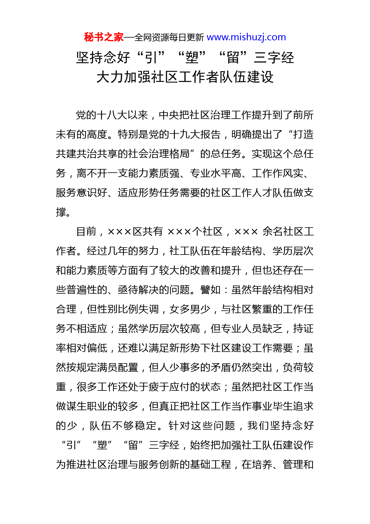 秘书之家—全网资源每日更新www.mishuzj.com坚持念好“引”“塑”“留”三字经大力加强社区工作者队伍建设党的十八大以来,中央把社区治理工作提升到了前所未有的高度。特别是党的十九大报告,明确提出了“打造共建共治共享的社会治理格局”的总任务。实现这个总任务,离不开一支能力素质强、专业水平高、工作作风实、服务意识好、适应形势任务需要的社区工作人才队伍做支撑。目前,×××区共有×××个社区,×××余名社区工作者。经过几年的努力,社工队伍在年龄结构、学历层次和能力素质等方面有了较大的改善和提升,但也还存在一些普遍性的、亟待解决的问题。譬如:虽然年龄结构相对合理,但性别比例失调,女多男少,与社区繁重的工作任务不相适应;虽然学历层次较高,但专业人员缺乏,持证率相对偏低,还难以满足新形势下社区建设工作需要;虽然按规定满员配置,但人少事多的矛盾仍然突出,负荷较重,很多工作还处于疲于应付的状态;虽然把社区工作当做谋生职业的较多,但真正把社区工作当作事业毕生追求的少,队伍不够稳定。针对这些问题,我们坚持念好“引”“塑”“留”三字经,始终把加强社工队伍建设作为推进社区治理与服务创新的基础工程,在培养、管理和秘书之家—全网资源每日更新www.mishuzj.com使用等方面综合施策、常议常抓。一、多措并举“引”,确保人才愿意来一是出台政策“引”。制度是吸引人才的关键。坚持将社区工作人才纳入全区人才培养战略,针对社区工作服务对象、服务内容的新变化和新形势对社区工作方式、社区治理手段提出的新要求,制定出台了《关于加强姑苏区社区工作者职业体系建设的实施意见》,健全完善了社区工作者的岗位设置、选聘录用、教育培训、薪资待遇、奖惩激励等制度。二是公开招聘“引”。每年根据人员流失情况,通过现场报名确认、笔试、面试、政审、体检等多轮筛选,面向社会公开招聘社区工作者1-2次。公开招聘时,对是中共党员和拥有心理咨询师、社会工作师证的应聘人员,实施加分政策,面向社会广纳贤才。同时,与退役军人事务部门共同举办退役军人专场,把优秀的退役军人吸引到社区。三是改善环境“引”。通过“腾”“调”“改”“建”“租”等多种措施,大力加强社区综合服务设施建设,扩大面积,优化布局,完善功能,美化环境,为社区工作者创造舒心舒适的工作环境。二、多管齐下“塑”,确保人才干得好一是坚持联合办学。20XX年起,××区政府与××学秘书之家—全网资源每日更新www.mishuzj.com院联合办学,探索开设社区公共事务管理专业,由学校根据岗位需求和报考人数,每年定向培养一定数量的社区工作者,打造从“孵化”到“输出”的一体式社工人才培养服务链。二是加强学习培训。建立区、街、居三级分类培训体系。每年区、街两级针对新进社工、全科社工、精英社工、普通社工、“两委”负责人等不同群体开展针对性培训,并建立训前考试制度,达到“以考促培、以考促学”目的,滚动式提升社区工作者工作能力。鼓励社区工作者参加全国社会工作师职业水平考试,与地方高校合作,免费举办考前培训班,提高考试通过率。目前,全区持证社区工作者××××人,持证人数占社工总数的××%。三是推行“全科”历练。全面推行全科社工模式,实行全科服务。梳理各类行政条线进社区事项的工作流程清单,明确区、街道、社区三级工作职责,制作全科社工服务事项便民手册,为全科社工日常工作提供参考和依据。四是实行机关帮带。持续开展机关支部先锋行动进社区活动,全区×××余个机关支部采取一对一、一对二的方式与全区×××个社区结对,同时选派机关党员担任社区“第一书记”。通过建立和落实结对帮扶制度,加强对社区工作者的能力培养和方法传授,帮助社区工作者在解决重点难点问题中增强工作能力、提高服务水平、涵养吃苦秘书之家—全网资源每日更新www.mishuzj.com品质。三、多路并进“留”,确保人才队伍稳一是以待遇留人。切实关心社区工作者生活待遇,建立薪酬动态调整机制,确保社区工作者报酬原则上不低于上年度苏州地区城镇非私营单位从业人员平均工资水平。同时,对社区工作者的社区工作年限补贴、工会福利待遇、午餐补贴、带薪年休假等待遇进行明确的保障落实。二是以事业留人。坚持正确用人导向,拓展晋升渠道,打破了职业发展中的“天花板”效应,鼓励优秀社区工作者脱颖而出,加大从社区党组织书记、居委会主任中招录公务员、招聘事业单位人员的力度,注重把表现优秀、实绩突出、群众公认度高的社区党组织书记、居委会主任选拔到街道领导岗位。近年来,全区共有5名社区工作者选拔到了事业副科职领导岗位。同时,积极探索社区工作者职业发展路径,公务员、事业单位提供部分岗位定向招录符合条件的社区工作者。全区共有50余名社区工作者被定向择优招录为公务员和事业单位人员。三是以情感留人。持续推进社工人才“3U”计划(生活无忧、能力提优、业绩增优),在社区工作者生存需要、发展需求以及职业适应三个方面,对社区工作者进行全方位的帮助与支持,使社区工作者能够扎根社区。对生活上有困难或者身患重病的社区工作者,给予经济上的补助、秘书之家—全网资源每日更新www.mishuzj.com精神上慰藉和心理