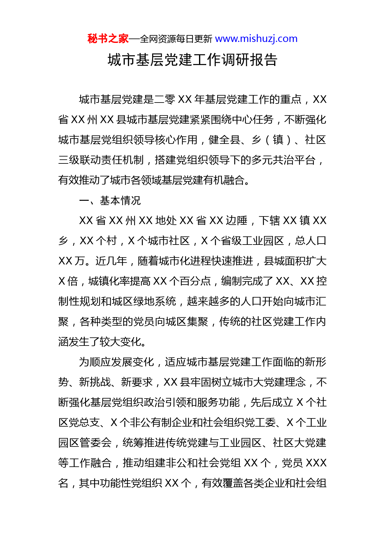 秘书之家—全网资源每日更新www.mishuzj.com城市基层党建工作调研报告城市基层党建是二零XX年基层党建工作的重点,XX省XX州XX县城市基层党建紧紧围绕中心任务,不断强化城市基层党组织领导核心作用,健全县、乡(镇)、社区三级联动责任机制,搭建党组织领导下的多元共治平台,有效推动了城市各领域基层党建有机融合。一、基本情况XX省XX州XX地处XX省XX边陲,下辖XX镇XX乡,XX个村,X个城市社区,X个省级工业园区,总人口XX万。近几年,随着城市化进程快速推进,县城面积扩大X倍,城镇化率提高XX个百分点,编制完成了XX、XX控制性规划和城区绿地系统,越来越多的人口开始向城市汇聚,各种类型的党员向城区集聚,传统的社区党建工作内涵发生了较大变化。为顺应发展变化,适应城市基层党建工作面临的新形势、新挑战、新要求,XX县牢固树立城市大党建理念,不断强化基层党组织政治引领和服务功能,先后成立X个社区党总支、X个非公有制企业和社会组织党工委、X个工业园区管委会,统筹推进传统党建与工业园区、社区大党建等工作融合,推动组建非公和社会党组XX个,党员XXX名,其中功能性党组织XX个,有效覆盖各类企业和社会组秘书之家—全网资源每日更新www.mishuzj.com织近百家,党组织政治引领和服务功能得到进一步强化。二、主要做法(一)深化拓展,搭建城市党建网格平台。把服务作为城市基层党建的出发点和落脚点,积极探索共驻共建、相融共进、群众参与的城市基层党建区域化模式。按照社区网格、XX工业园区网格、乡镇网格等模式划分城市党建网格,创新活动载体,积极开展“在职党员进社区”“万名干部进万企”等活动,参加社区、企业党组织开展的各类活动。组建了党员志愿者服务队、普法宣传志愿者服务队、文艺宣传志愿者服务队、矛盾纠纷调解志愿者服务队、巾帼志愿者服务队等志愿者队伍,构建党建联动共融机制,提升服务规范。(二)落实保障,力促党建阵地达标升级。把阵地达标作为主抓项目,加大经费投入保障力度,通过新建、整修等方式,最大限度提升城区党建办公场所规范化程度。累计投入XXX多万元,根据各社区的实际情况,通过新建、政府划拨、维修改造等形式,新修了兴隆街社区办公楼,整修了XX社区、XX社区办公楼,将原社区临街的XXX多平方米的商业门面改为一门式便民服务大厅。现在,各社区办公用房都在XXX平方米以上,设立了“八室、一厅、一所、两栏”,基本实现了社区办公场所标准化、制度建设规范化、管理服务人性化的目标。在非公企秘书之家—全网资源每日更新www.mishuzj.com业,以“XX公司”为依托,辐射其他企业,按照有场所、有设施、有标志、有党旗、有书报、有制度的“六有”标准,加强非公企业党组织活动场所规范化建设。采取资源整合、企业自筹、上级党组织支持相结合的方式,在XX现代农业、XX公司集中建设标准化活动场所。(三)选育结合,提升党务队伍素质。选优配强社区党组织书记队伍,把社区书记队伍建设纳入干部人才队伍建设总体规划,结合社区“两委”换届,打破地域、身份界限,选优配强社区书记队伍。列支财政资金足额落实社区干部待遇,社区党组织专职成员年均报酬达X万元,办公经费达到XX万元。加大从社区专职工作者中定向招录公务员力度,公开选拔优秀社区书记担任乡镇领导干部,提升干事创业动力。推行“轮职书记”制度,园区各企业党支部书记分月任职,履行第一书记职责,为党员上党课、为企业提建议、组织开展特色活动。实现“两新”党组织选派党建指导员全覆盖,负责全面指导“两新”党组织党建工作。三、存在的问题(一)基层党组织覆盖不健全。企业改制过程中,配套措施跟不上,党员管理脱节,部分企业在改制中没有组织部门参加,基层组织建设和党员队伍管理没有同步跟上,许多党组织解散后,没有完成正常的党员关系转接,秘书之家—全网资源每日更新www.mishuzj.com使得部分党员“空挂”,直到XX年经过系统的党组织关系排查后情况才有好转,但仍然有部分遗留问题没有解决。“两新”组织党组织组建不完全。20XX年,在全省的统一部署下,我县开展了“两新”组织“百日攻坚行动”,全县XX家非公有制经济组织和XX家社会组织,分别结合实际,采取单独组建、挂靠联建等方式集中组建了党组织,覆盖率达到XX%。但仍然有部分非公有制经济组织和社会组织没有组建党组织,覆盖率无法达到XX%。(二)党务工作者素质不高。全县五个社区,现有工作人员XX人,其中具有大学专科学历以上的仅X人,知识欠缺,学习能力弱,难以满足当前开展社区党建工作的需要,受公益性岗位用人标准限制,部分人员三年满期就得换人,很多人刚熟悉工作,又不得不离开工作岗位,致使人员变动频繁,工作缺乏连续性。“两新”组织党组织除个别单位外,几乎所有的党务工作者均是兼职,没有足够的精力完成好党建工作。且非公企业受资金、市场等各方面影响较大,人员流转较快,缺乏工作连续性。(三)党组织管理体制不顺。县城区的党建工作仍然以党组织隶属关系采取纵向式管理,社区党组织与所在机关企事业单位的党组织缺乏横向联系。党员管理有欠缺。机关企事业单位党员,认为自己是“单位人”,社区党建工作是“份外事”,不服从社区党组织管理,不愿参加社秘书之家—全网资源每日更新www.mishuzj.com区党组织活动;下岗