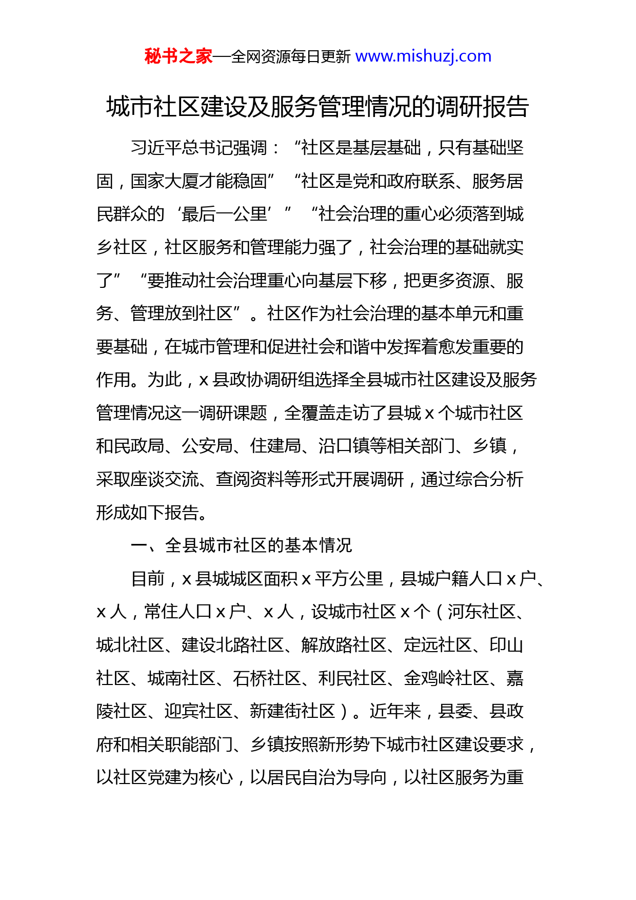 秘书之家—全网资源每日更新www.mishuzj.com城市社区建设及服务管理情况的调研报告习近平总书记强调:“社区是基层基础,只有基础坚固,国家大厦才能稳固”“社区是党和政府联系、服务居民群众的‘最后一公里’”“社会治理的重心必须落到城乡社区,社区服务和管理能力强了,社会治理的基础就实了”“要推动社会治理重心向基层下移,把更多资源、服务、管理放到社区”。社区作为社会治理的基本单元和重要基础,在城市管理和促进社会和谐中发挥着愈发重要的作用。为此,x县政协调研组选择全县城市社区建设及服务管理情况这一调研课题,全覆盖走访了县城x个城市社区和民政局、公安局、住建局、沿口镇等相关部门、乡镇,采取座谈交流、查阅资料等形式开展调研,通过综合分析形成如下报告。一、全县城市社区的基本情况目前,x县城城区面积x平方公里,县城户籍人口x户、x人,常住人口x户、x人,设城市社区x个(河东社区、城北社区、建设北路社区、解放路社区、定远社区、印山社区、城南社区、石桥社区、利民社区、金鸡岭社区、嘉陵社区、迎宾社区、新建街社区)。近年来,县委、县政府和相关职能部门、乡镇按照新形势下城市社区建设要求,以社区党建为核心,以居民自治为导向,以社区服务为重秘书之家—全网资源每日更新www.mishuzj.com点,以社区稳定为基础,以居民满意为目标,推行网格化管理服务模式,不断创新社区管理体制,完善社区基础设施,健全社区服务体系,社区建设取得明显成效。(一)社区干部配置情况。城市社区均按x名专职干部配备(支部书记x名、居委会主任x名、文书x名、社区工作者x名),现有专职社区干部x人(印山社区、新建街社区各缺x人)。1.从性别结构来看。男性x人,占实有人数的x%;女性x人,占实有人数的x%。社区书记中男性x人,占社区书记总人数的x%;女性x人,占社区书记总人数的x%。居委会主任中男性x人,占居委会主任总人数的x%;女性x人,占居委会主任总人数的x%。2.从年龄结构来看。30岁以下x人,占x%;30-39岁x人,占x%;40-49岁x人,占x%;50-55岁x人(女性x人),占19.05%;55岁以上x人,占x%。3.从文化程度来看。高中x人,占x%;中专x人,占x%;大专x人,占x%;本科x人,占x%。4.从工作年限来看。社区干部中x年以下社区工作经历x人;3年以上-10年以下社区工作经历的x人,占x%;10年以上社区工作经历的x人,占x%。秘书之家—全网资源每日更新www.mishuzj.com(二)社区阵地建设情况。目前,县城x个城市社区用房达到200-250平方米x个,300-360平方米x个,600平方米x个,1300平方米x个(河东社区)。(三)社区经费保障情况。每个社区每年办公经费x万元,服务群众经费x万元,经县财政预算拨付到沿口镇政府,由沿口镇政府拨付到社区账户。专职社区干部报酬由大平台工资账户每月按时支付(书记x元/月,主任x元/月,文书、社区工作者x元/月)。目前,专职社区干部以个人名义购买医疗保险、养老保险(x%),其中,养老保险费用县财政按x%的x%拨付到沿口镇政府。二、存在的主要问题(一)各方资源整合不够,党建引领作用发挥不明显。一是社区虽建立了相应党组织,但示范引领效果不明显。二是社区党组织活动对年轻党员缺乏吸引力,活动参与多以老年党员为主。三是辖区内行政机关、企事业单位党员参与社区活动积极性不高,社区对其缺乏制约手段。(二)工作任务与职能不相适应,社区存在“行政化”倾向。一是根据《居民委员会组织法》,社区是实行自我管理、自我教育、自我服务、自我监督的群众性自治组织。社区“两委”及社区工作者的主要职责是服务居民群众。但乡镇政府和相关部门把社区当做一级行政组织,转交了大量行政性工作。二是“权随责走、费随事转”在秘书之家—全网资源每日更新www.mishuzj.com实际操作中执行不到位。在“权随责走”方面,作为没有公职身份的自治组织干部,不具有与相关工作对应权力。在“费随事转”方面,社区居委会在受经费、考评等制约情况下,没有就工作经费协商的话语权。(三)社区服务与群众需求不相适应,社区服务水平不高。随着城市管理体制改革不断深化,社区居民服务需求日趋多样化,对社区服务要求也越来越高。目前,县城城市社区提供的服务与居民群众日益增长的需求还存在不小差距。一是服务内容单一。社区服务主要还是依托政府职能部门诸如人社、公安等开展行政服务,公共服务、公益服务开展不够。二是服务主体单一。在引导非营利性组织、社会团体、志愿队伍等参与社区服务方面有待加强。三是服务质量参差不齐。不同社区服务水平差距较大,服务标准各不相同,社区服务缺乏规范化标准。(四)老旧小区管理问题较多,社区职能有限有心无力。目前,有物业的老旧小区属住建局管理,没有物业的老旧小区由沿口镇和社区进行管理。县城没有物业的小区(院落)x个,管理难度较大、问题也较多。一是社区、沿口镇政府、住建局、综合行政执法局等在老旧小区问题处理上沟通、配合不够,尚未形成合力。二是大部分老旧小区没有成立业主委员会,小区环境较差,垃圾乱扔乱倒、侵占公共空间、堵塞消防通道、私搭乱建等情况较为突出,秘书之家—全网资源每日更新www.mishuzj.com安全隐患较多。三是业主与物管、业主与业委会普遍存在矛盾,物管费收缴占比极低,物管公司不愿管理,业主不愿缴费,最终形成恶性循环。(五)共