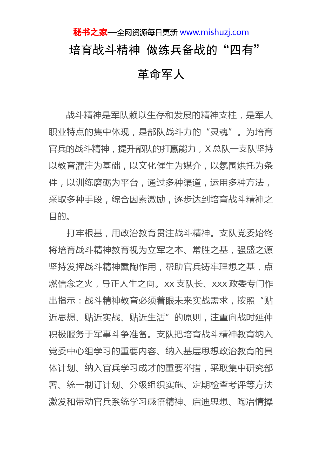 秘书之家—全网资源每日更新www.mishuzj.com培育战斗精神做练兵备战的“四有”革命军人战斗精神是军队赖以生存和发展的精神支柱,是军人职业特点的集中体现,是部队战斗力的“灵魂”。为培育官兵的战斗精神,提升部队的打赢能力,X总队一支队坚持以教育灌注为基础,以文化催生为媒介,以氛围烘托为条件,以训练磨砺为平台,通过多种渠道,运用多种方法,采取多种手段,综合因素激励,逐步达到培育战斗精神之目的。打牢根基,用政治教育贯注战斗精神。支队党委始终将培育战斗精神教育视为立军之本、常胜之基,强盛之源坚持发挥战斗精神熏陶作用,帮助官兵铸牢理想之基,点燃信念之火,导正人生之向。xx支队长、xxx政委专门作出指示:战斗精神教育必须着眼未来实战需求,按照“贴近思想、贴近实战、贴近生活”的原则,注重向战时延伸积极服务于军事斗争准备。支队把培育战斗精神教育纳入党委中心组学习的重要内容、纳入基层思想政治教育的具体计划、纳入官兵学习成才的重要举措,采取集中研究部署、统一制订计划、分级组织实施、定期检查考评等方法激发和带动官兵系统学习感悟精神、启迪思想、陶冶情操秘书之家—全网资源每日更新www.mishuzj.com坚定信念。积极利用党团日和节假日时机,组织官兵开展常态化主题实践活动,适时组织仪式教育,广泛开展“讲战斗故事、学英模人物、看革命电影、唱红色歌曲”和“党员站排头当先锋”活动,将形成战斗精神所必备的要素贯注到官兵头脑之中,提高政治觉悟,统一思想认识,激发官兵在岗位上努力践行“四有”新一代革命军人要求通过政治教育,牢固树立“当兵打仗是天职、带兵打仗是使命”的思想,切实打牢战斗精神的根基。提升层次,从先进文化催生战斗精神。军事文化是我军的政治优势和显著标志,体现着军队的生存智慧,是军人精神的火炬,是部队奋进的号角,是凝聚军心、鼓舞士气、提高战斗力的精神支柱。支队结合当前官兵受网络等新兴媒体影响大、精神文化需求多层次多样化特征明显的实际,结合重大纪念日、开展“学雷锋”活动等时机,举行升旗、宣誓等鼓舞士气的仪式,激发官兵爱军习武热情和荣誉感。举办以弘扬战斗精神为主题的故事会、演讲会歌咏会,用包括井冈山精神、长征精神、延安精神、抗美援朝精神、“两弹一星”精神、抗洪精神、抗雨雪冰冻灾害精神等为代表的具有时代特征的战斗精神,武装广大官兵头脑,让官兵在耳濡目染中体会战斗精神,在潜移默化中强化战斗精神。在新媒体传播上,注重融入时尚元素,开办网上史馆,对各类书籍、报刊等载体精选分类,随时秘书之家—全网资源每日更新www.mishuzj.com让广大官兵学习浏览。同时支队还积极引导官兵丰富文化知识、增强科学技能,助力官兵突破传统的思想束缚,把敢打敢拼与崇尚科学结合起来,提升培育战斗精神的层次。感受熏陶,借营造氛围烘托战斗精神。结合军事斗争准备,营造浓厚的战斗氛围,是战斗精神培育的重要内容支队注重部队的硬环境和软环境建设,大力营造“想打赢谋打赢、练打赢、能打赢”的浓厚氛围。按照“美化、亮化、战斗化”的思路,把高品位的精神文化环境与营区整体规划结合起来。在营区设立具有战斗精神内容的灯箱标语、板报橱窗,在主干道树立印有战斗精神内容的标语牌口号,制作并树立英模人物画像,在训练场树立起“政治特别坚定,军事特别过硬,反应特别迅捷,作风特别顽强”的标语口号,让官兵在潜移默化中感受战斗精神的熏陶。积极组织官兵经常开展讲英雄故事、唱英雄歌曲、读英雄书籍、吟英雄诗篇,用支队曾经的英雄事迹、英雄精神、英雄情怀感染和熏陶官兵,并及时发现、培养和宣扬新的典型,让官兵在回顾历史风云中洗礼心灵、在学习身边典型中砥砺斗志。同时开展板报评比、心得体会展评等系列活动,让官兵有时机、有场所展现自己的特长,在评比竞赛中,营造浓厚的比学赶帮超氛围。锤炼意志,以练兵备战磨砺战斗精神。军事训练是部队建设中的一项长期的、经常的中心工作,是提高军事技秘书之家—全网资源每日更新www.mishuzj.com能的基本军事实践活动,也是培育战斗精神的根本途径。针对强军目标对部队建设提出的新标准新要求,支队极拓展功能作用,将战斗精神培育的潜实力内动力融入官兵练兵备战中,转化为部队科学发展的战斗力推动力。积极开展强军系列文化活动,将强军改革融入到战斗精神的培育中来,以贴近官兵、引导官兵的方式提升军人品质。同时以未来作战需求牵引把战斗精神培育融入军事训练内容体系,渗入各项军事活动实践。并结合担负的作战任务,根据不同训练阶段的要求,有针对性地提出培育战斗精神的要求,把胆量训练、信心训练、意志力训练、判断力训练服从意识训练、团结精神训练等内容,贯穿落实到相关的训练课目之中。此外支队还注重结合完成重大任务、抢险救灾、执勤维稳、战备演习等时机摔打锻炼部队,让部队在前移的“战场”和各种恶劣复杂的环境中磨练钢筋铁骨和坚强意志。通过大力培育官兵战斗精神,进一步锻造了支队官兵不畏困难的勇气和决心,磨练了随时能战的意识和准备,强化了敢打必胜的信心和献身使命的决心,筑牢了官兵忠于职守、献身军营的思想政治根基,确保了部队关键时刻“拉得出、上得去