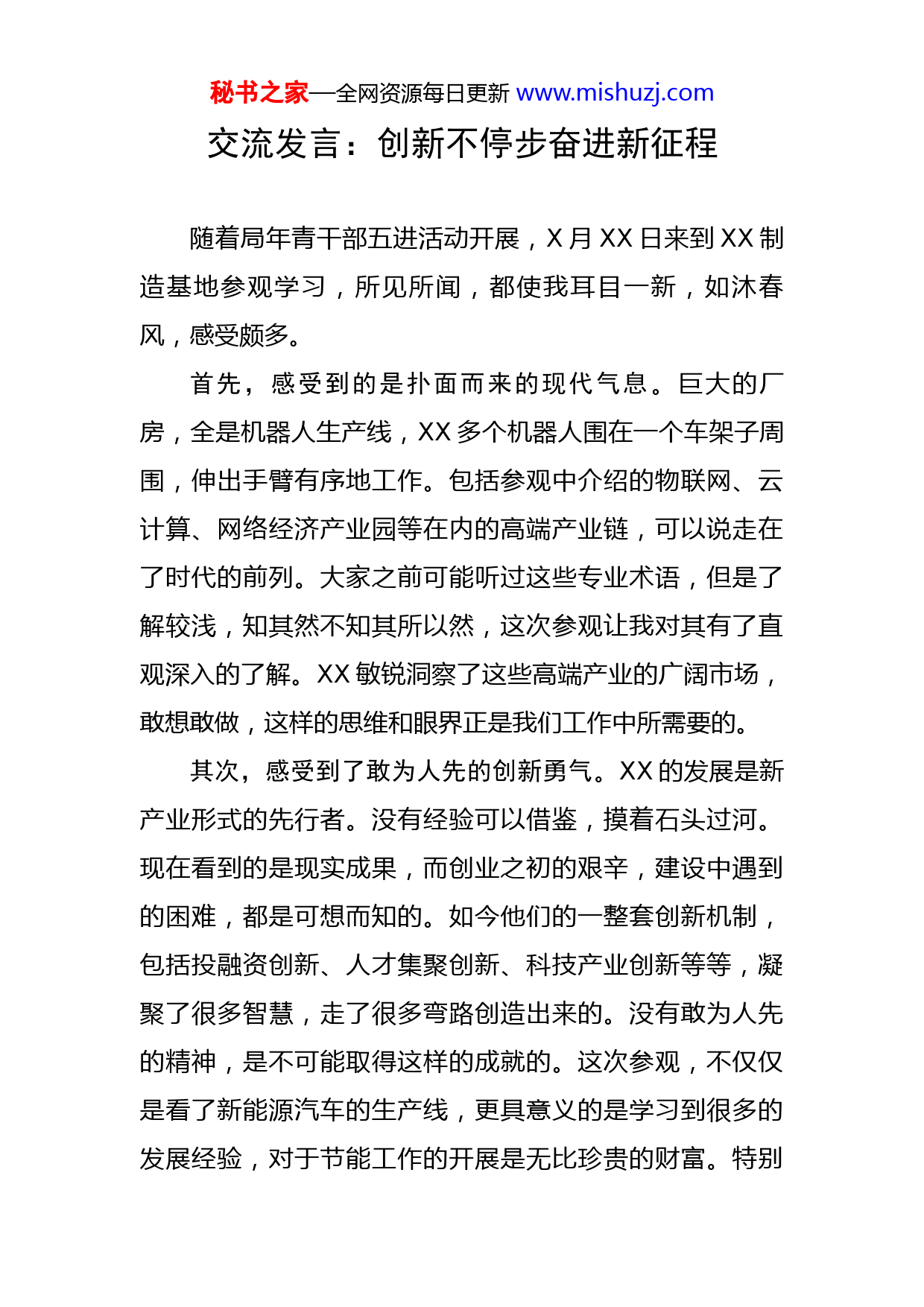秘书之家—全网资源每日更新www.mishuzj.com交流发言:创新不停步奋进新征程随着局年青干部五进活动开展,X月XX日来到XX制造基地参观学习,所见所闻,都使我耳目一新,如沐春风,感受颇多。首先,感受到的是扑面而来的现代气息。巨大的厂房,全是机器人生产线,XX多个机器人围在一个车架子周围,伸出手臂有序地工作。包括参观中介绍的物联网、云计算、网络经济产业园等在内的高端产业链,可以说走在了时代的前列。大家之前可能听过这些专业术语,但是了解较浅,知其然不知其所以然,这次参观让我对其有了直观深入的了解。XX敏锐洞察了这些高端产业的广阔市场,敢想敢做,这样的思维和眼界正是我们工作中所需要的。其次,感受到了敢为人先的创新勇气。XX的发展是新产业形式的先行者。没有经验可以借鉴,摸着石头过河。现在看到的是现实成果,而创业之初的艰辛,建设中遇到的困难,都是可想而知的。如今他们的一整套创新机制,包括投融资创新、人才集聚创新、科技产业创新等等,凝聚了很多智慧,走了很多弯路创造出来的。没有敢为人先的精神,是不可能取得这样的成就的。这次参观,不仅仅是看了新能源汽车的生产线,更具意义的是学习到很多的发展经验,对于节能工作的开展是无比珍贵的财富。特别秘书之家—全网资源每日更新www.mishuzj.com是学习别人敢为人先、勇于创新的精神,不怕走弯路,找到适合我省公共机构节能工作发展的思路和方法。第三,感受到了争创一流的意识。XX目前已经获得的专利超过XX项,有国际性、国家级、区域性的,起点定位很高,争创一流意识贯穿建设的始终,每一项专利的获得都是XX人争创一流的智慧结晶。与XX相比,我们的一流意识明显不足。在今后各项工作中,应认真汲取经验,坚持高标准推进各项工作。第四,感受到了言出必行的务实作风。做任何工作都要有务实的工作作风,政策不贯彻等于没政策,政策落实归根到底是干部的执行力问题,执行力是衡量干部能力的重要标准。光耍嘴皮子一点用没有。我们要学习XX脚踏实地的务实作风,把发展的压力转化成干事创业的动力,努力实现公共机构节能工作的跨越式发展。结合参观学习中的感受,我认为在今后工作中:一是要有创新的思维。在我们的工作中,有的人一直沿用传统的节能理念开展工作,有的人生搬硬套经验拿过来就用,节能中的新技术与新产品推广起来就很缓慢。思维观念不转变,始终因循守旧,节能工作只能是原地踏步。我们需要不断提高自身的技术水平,做到“知行合一”,以知识和技能为依托,通过不同的视角,运用不同的思维方式,展开头脑风暴,让这样的方式方法成为创新秘书之家—全网资源每日更新www.mishuzj.com的不竭动力。围绕当前工作的热点难点问题,多思考、多琢磨,突破旧的思维定势,多出亮点、多树品牌。二是要有转化的能力。别人的东西再好始终是别人的,学习的目的就是如何结合自身的特点转化成自己的东西。仅仅学习照搬是远远不够的,还要结合实际情况加以灵活运用,适当创新,完善经验。在工作中遇到的每一项任务,都要总结得失,找出问题找出原因,从中总结出规律性的东西,作为知识和技能掌握下来,这样才能把工作经验转化为自己的能力。以前很多单位对于节能工作的关注度与参与度都不高,我们就成立了节能工作协作组,将工作对象转化为工作力量,共同参与推动公共机构的节能工作,起到了较为明显的效果。三是要有争先的意识。安于现状,止步不前,这都不是我们该有的态度。年青人就应有敢为人先的劲头,干任何一项工作,都要与最优者“对标”、与最强者比拼、与最快者赛跑。我们要拉高标杆,勇立潮头,瞄准“走在前列”不动摇,牢固树立“干不到一流就是失职、争不到一流就是落后”的理念。找准自己位置,选定学赶对象,深入细致研究谋划工作思路,建立对标清单,设定既有挑战性又跳起来够得着的目标,一以贯之坚持下去,久久为功、善作善成。四是要有实干的精神。千里之行,始于足下,大道至秘书之家—全网资源每日更新www.mishuzj.com简、实干为要”,每一项事业,不论大小,都是靠脚踏实地,一点一滴干出来的,“道虽迩,不行不至,事虽小,不为不成”,做人做事,最怕的就是只说不做,眼高手低,干工作不可能总是一帆风顺,通往成功的道路不可能一马平川,工作越困难、道路越曲折,越需要比实干,坚持不懈干好每一件事,坚韧不拔从小事做起,从当下做起,锤炼工作作风。作为青年干部,我们就应坚持“实”字当头,“干”字为先,不驰于空想,不骛于虚声,一步一个脚印,实心实意地干,老老实实地干,实实在在地干。