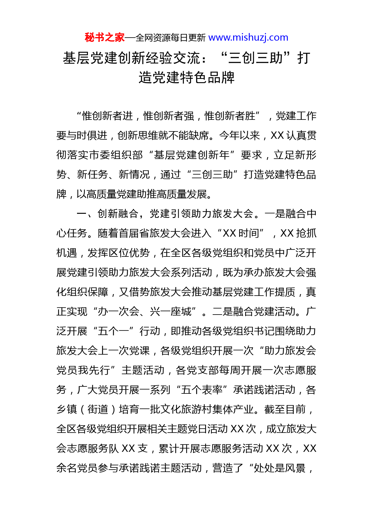 秘书之家—全网资源每日更新www.mishuzj.com基层党建创新经验交流:“三创三助”打造党建特色品牌“惟创新者进,惟创新者强,惟创新者胜”,党建工作要与时俱进,创新思维就不能缺席。今年以来,XX认真贯彻落实市委组织部“基层党建创新年”要求,立足新形势、新任务、新情况,通过“三创三助”打造党建特色品牌,以高质量党建助推高质量发展。一、创新融合,党建引领助力旅发大会。一是融合中心任务。随着首届省旅发大会进入“XX时间”,XX抢抓机遇,发挥区位优势,在全区各级党组织和党员中广泛开展党建引领助力旅发大会系列活动,既为承办旅发大会强化组织保障,又借势旅发大会推动基层党建工作提质,真正实现“办一次会、兴一座城”。二是融合党建活动。广泛开展“五个一”行动,即推动各级党组织书记围绕助力旅发大会上一次党课,各级党组织开展一次“助力旅发会党员我先行”主题活动,各党支部每周开展一次志愿服务,广大党员开展一系列“五个表率”承诺践诺活动,各乡镇(街道)培育一批文化旅游村集体产业。截至目前,全区各级党组织开展相关主题党日活动XX次,成立旅发大会志愿服务队XX支,累计开展志愿服务活动XX次,XX余名党员参与承诺践诺主题活动,营造了“处处是风景,秘书之家—全网资源每日更新www.mishuzj.com人人是导游”的浓厚氛围。三是融合工作实际。引导党员根据当地实际,积极参与到旅发大会的服务保障、宣传引领、环境保护等工作。如XX街道党工委建立和扩充志愿服务队伍XX支,走街串巷开展主题宣讲;XX镇党委开展“美丽机关有我、美丽屋场有我、美丽田园有我”活动,联动核心景区沿线农户房屋美化,发动XX名党员参与到流转土地、农作物种植、发展村集体经济工作中;XX乡党委通过评星定级方式开展党员环境整治“大比武”,为办好旅发会提供一个整洁美丽的乡村环境。二、创新载体,“五个先锋”助跑乡村振兴。一是抓“学习先锋”提升乡村振兴本领素质。今年第一季度,通过“书记领学、云端自学、按需送学、以行践学”,推动党课走进春耕现场、红色展馆、屋场院坝,结合党员教育开展志愿服务XX次、送教上门XX人。二是抓“组织先锋”筑牢乡村振兴战斗堡垒。新一届村(社区)“两委”换届以来,把XX名致富能手培养成党组织书记,XX名党组织书记培养成标杆,村(社区)书记、主任“一肩挑”比率达到99%;推行“导师帮带制”,建立“导师库”XX人,结对帮带XX对,不断夯实后备力量。三是抓“产业先锋”提高乡村振兴发展效能。现已形成“XX莓茶”“XX贡米”“菊花XX”三大品牌产业,XX镇XX村、XX乡XX村、XX乡XX村的经营性收入达XX万元以上,全区实现秘书之家—全网资源每日更新www.mishuzj.com了集体经济空壳村清零。四是抓“带富先锋”汇聚乡村振兴强大合力。实施乡村产业人才“倍增”工程以来,回引返乡投资创业人才XX名,在返乡投资创业人才中发展党员XX名,培育成为村支“两委”干部XX名,其中村(社区)党组织书记XX名;选派了XX名高学历、高职称人才到乡镇(街道)进村工作,实现村(居)科技人才全覆盖。五是抓“治理先锋”推动乡村振兴提质增效。采取单独组建、联合组建等方式,成立XX个临时微网格党支部;“一门式”服务事项拓展至XX件;全区XX名党员与XX名群众结对子,张贴党员联系卡XX张,化解民情问题XX个。三、创新机制,“三同管理”助推基层治理。一是党委主导实行“同乡”管理。依托乡贤建立“同乡型”流动党员党支部,流出地党委采用“风筝”工作法加强动态管理。发放流动党员证,建立“一人一档”,安排专人定期掌握其思想生活各方面动态,督促其时刻牢记党员职责和使命。在流动党员“归巢”期,组织开展行前教育或是通过邮寄、群发课件形式,及时为其“充电赋能”。目前,全区已建立流动党员党组织XX个,发放流动党员证XX个,培训流动党员XX人次。二是属地统筹实行“同住”管理。依托城市社区小区网格建立“同住型”流动党员党支部,实行“属地党组织统筹—社区党组织协调—流动党员秘书之家—全网资源每日更新www.mishuzj.com党支部主导”的机制。流动党员在流入地“双报到”“亮身份”,积极参与社区小区治理,有的化身新冠疫苗接种“助跑员”,协助所在社区小区开展“敲门行动”;有的头戴志愿服务“小红帽”,在XX河沿岸义务清扫垃圾,真正做到了离乡不离党、异地不忘为。三是行业联动实行“同业”管理。依托两新组织建立“同业型”流动党员党支部,对流入的物管、导游、快递小哥、外卖骑手等新业态、新就业群体进行技能指导和集中管理,现已动态管理XX名流动党员。在两新组织领导下,流动党员定期参加组织生活,学习习近平新时代中国特色社会主义思想、支部条例,开展物业、疫情防控等志愿服务,结合企业(商协会)实际需要开展业务活动。