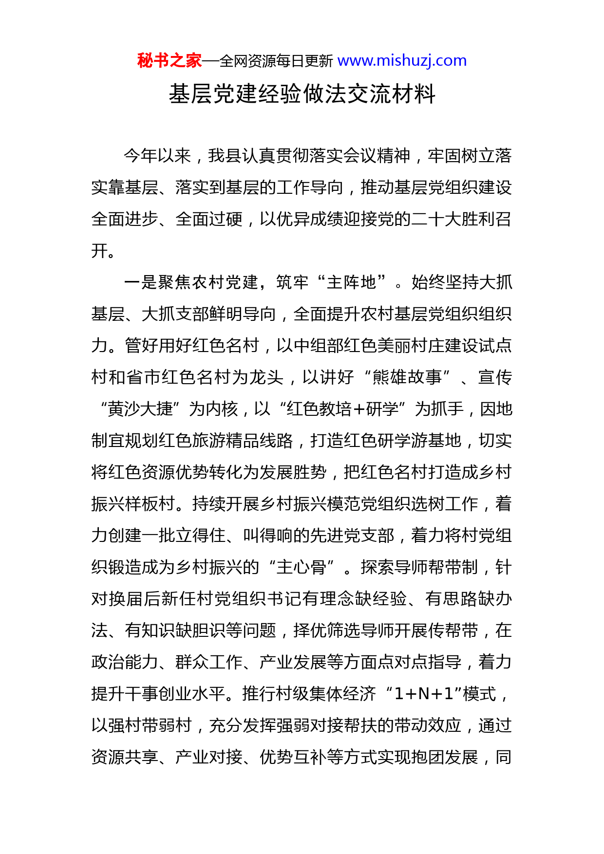 秘书之家—全网资源每日更新www.mishuzj.com基层党建经验做法交流材料今年以来,我县认真贯彻落实会议精神,牢固树立落实靠基层、落实到基层的工作导向,推动基层党组织建设全面进步、全面过硬,以优异成绩迎接党的二十大胜利召开。一是聚焦农村党建,筑牢“主阵地”。始终坚持大抓基层、大抓支部鲜明导向,全面提升农村基层党组织组织力。管好用好红色名村,以中组部红色美丽村庄建设试点村和省市红色名村为龙头,以讲好“熊雄故事”、宣传“黄沙大捷”为内核,以“红色教培+研学”为抓手,因地制宜规划红色旅游精品线路,打造红色研学游基地,切实将红色资源优势转化为发展胜势,把红色名村打造成乡村振兴样板村。持续开展乡村振兴模范党组织选树工作,着力创建一批立得住、叫得响的先进党支部,着力将村党组织锻造成为乡村振兴的“主心骨”。探索导师帮带制,针对换届后新任村党组织书记有理念缺经验、有思路缺办法、有知识缺胆识等问题,择优筛选导师开展传帮带,在政治能力、群众工作、产业发展等方面点对点指导,着力提升干事创业水平。推行村级集体经济“1+N+1”模式,以强村带弱村,充分发挥强弱对接帮扶的带动效应,通过资源共享、产业对接、优势互补等方式实现抱团发展,同秘书之家—全网资源每日更新www.mishuzj.com时用好财政扶持资金,推动村级集体经济做优做强。二是聚焦城市治理,绘好“工笔画”。始终坚持把服务群众、造福群众作为基层治理的出发点和落脚点,推动党的组织“末梢”与社区治理“微单元”实现同频共振。完善城市党建领导体制,推动社区党工委实质化运转,以网格化治理体系推进城市管理精细化、精准化,擦亮全国文明城市品牌。针对群众反映强烈火的“关键小事”,积极探索“党建+网格+红色物业”模式,实行物业企业管理层和社区“两委”班子成员“双向进入、交叉任职”机制。打造“15分钟党群服务圈”,新建改造一批党群服务中心和红色驿站,把党群服务矩阵打造为党员精神家园和服务群众的前沿阵地。实施“党建+城市养老”工程,推进社区居家养老、小区养老服务驿站、社区(小区)“嵌入式”养老、家庭养老床位、适老化改造等五种模式落地见效。深化“网事360”党建引领城市基层治理模式,依托社区组建精细管理、警格中心、诉调中心等3个平台,建立健全社区首问负责、分流协调、奖惩考核、档案管理等6项制度,努力实现矛盾纠纷零上交。三是聚焦两新领域,补齐“短弱项”。始终坚持为发展聚力、为企业赋能,推动“两新”领域党的组织覆盖和工作覆盖从“有形”向“有效”转变,将短板变样板、难点成亮点。分类推进新业态、新就业群体、重点区域、重秘书之家—全网资源每日更新www.mishuzj.com点行业、重点企业的“两新三重”领域党建工作,促进党建工作与非公企业经营“同频共振”。选派“红领书记”,重点从发改、工信、商务等部门中择优筛选具有党建工作基础、熟悉产业政策的科级干部到非公企业党组织任职,切实当好党建指导员、人才联络员、创业辅导员。组建由园区企业、要素保障单位等组成的锂电新能源产业链联合党组织,下大力气破解非公企业党组织难建、活动难开展、党员作用难发挥等问题,着力打通部门与企业的工作壁垒。叫响“我负责阳光雨露,你负责茁壮成长”口号,高标准建设社会组织党群服务中心,着力打造集社会组织机构孵化、党群活动于一体的服务平台,不断强化社会组织党建工作指导、党员教育管理、群团文化建设,将红色元素贯穿社会组织成长运营全过程,引领社会组织健康有序发展。