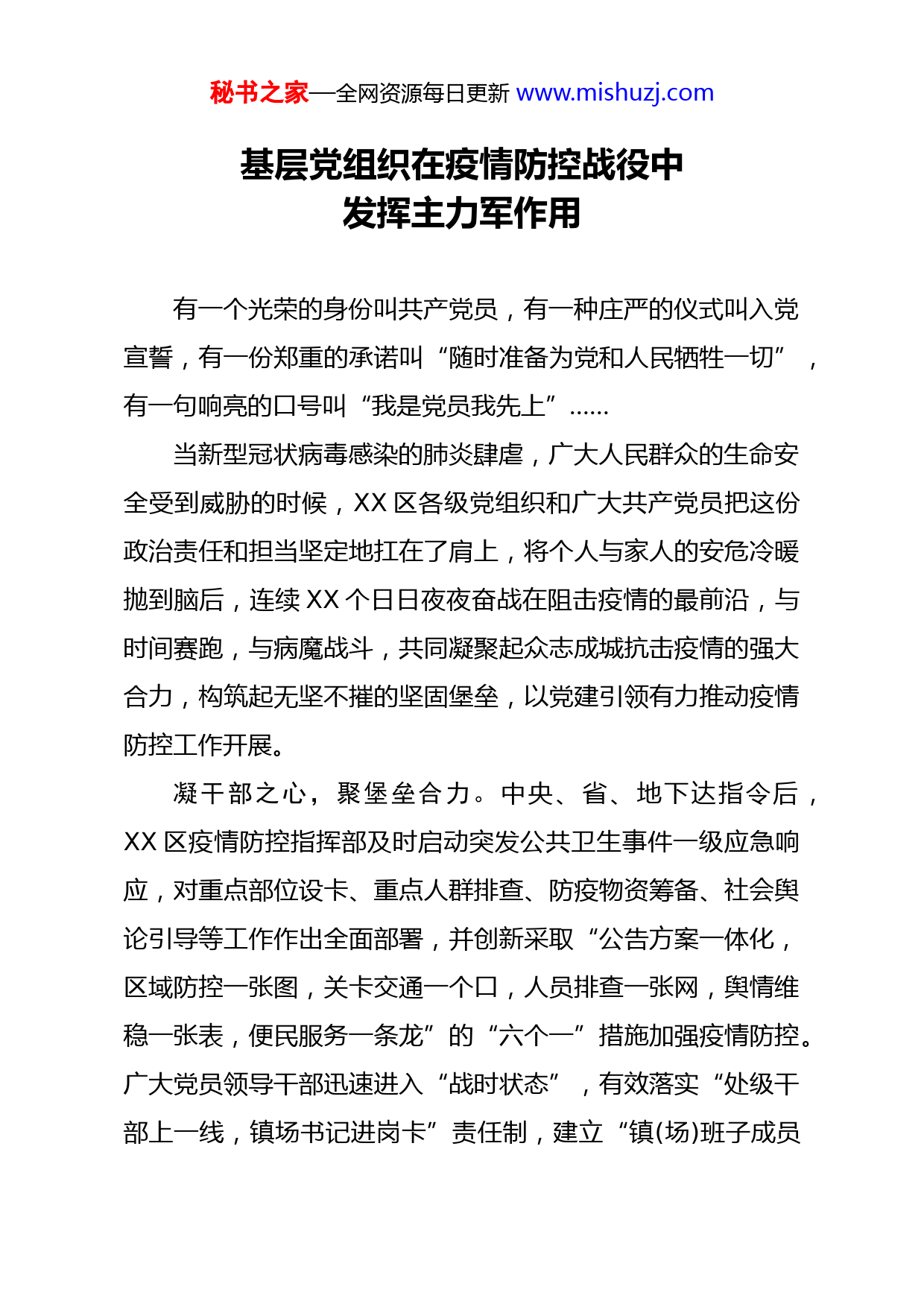 秘书之家—全网资源每日更新www.mishuzj.com基层党组织在疫情防控战役中发挥主力军作用有一个光荣的身份叫共产党员,有一种庄严的仪式叫入党宣誓,有一份郑重的承诺叫“随时准备为党和人民牺牲一切”,有一句响亮的口号叫“我是党员我先上”……当新型冠状病毒感染的肺炎肆虐,广大人民群众的生命安全受到威胁的时候,XX区各级党组织和广大共产党员把这份政治责任和担当坚定地扛在了肩上,将个人与家人的安危冷暖抛到脑后,连续XX个日日夜夜奋战在阻击疫情的最前沿,与时间赛跑,与病魔战斗,共同凝聚起众志成城抗击疫情的强大合力,构筑起无坚不摧的坚固堡垒,以党建引领有力推动疫情防控工作开展。凝干部之心,聚堡垒合力。中央、省、地下达指令后,XX区疫情防控指挥部及时启动突发公共卫生事件一级应急响应,对重点部位设卡、重点人群排查、防疫物资筹备、社会舆论引导等工作作出全面部署,并创新采取“公告方案一体化,区域防控一张图,关卡交通一个口,人员排查一张网,舆情维稳一张表,便民服务一条龙”的“六个一”措施加强疫情防控。广大党员领导干部迅速进入“战时状态”,有效落实“处级干部上一线,镇场书记进岗卡”责任制,建立“镇(场)班子成员秘书之家—全网资源每日更新www.mishuzj.com+社区“两委”成员+网格员”三级防控网络。成立XX个由处级领导干部担任组长的工作组,分别负责综合协调、医疗救治、宣传报道、网络舆情、市场监管等工作。XX名处级领导干部包保X个镇、林场,靠前指挥,驻检查站防控。区委组织部成立疫情防控工作专项领导小组,并制发“两书两通知”,即《致全区各级党组织和广大党员干部的倡议书》《致全区在家退休党员的倡议书》和“发挥两个作用”“加强党建引领”的通知,把基层党组织和广大党员全面动员起来,坚定站在疫情防控第一线。凝党员之心,聚攻坚合力。坚持疫情就是命令,防控就是责任,XX区广大党员昼夜奋战在封关设卡、全面调查、隔离防控、宣传动员等各个工作岗位上,以实际行动践行初心使命。在各镇、林场进出口设立X处关卡,落实X名处级干部带队、带班,并组建由医护人员、公安干警、交通警察、社区工作人员等人员组成的防控检查组,采取“问一次行程、阐述一次原因、测一次体温、做一次记录”的“四个一”工作法,24小时严守入区关口。为加强党的领导,在各检查站组建临时党支部XX个,包点处级领导干部任党支部书记,并组织了党员宣誓仪式,进一步强化党员的责任担当。广大党员采取全覆盖登记排查、全方位服务引领等方式,分兵把口、责任到人,逐户逐人统计摸排,并建立“一个定点、二个门牌、每日三报告和秘书之家—全网资源每日更新www.mishuzj.com三层包保”的监督机制。适应疫情防控工作需要,区委组织部发动各基层党组织组建XX支党员服务队,为企业和群众提供装卸物资、入户宣传、隔离监控、代购物品、劝返退票等8个方面的服务,抽调XX名机关、企事业单位党员干部组成志愿者服务队伍,配合社区工作人员做好居家隔离人员的服务工作。成立“抗击疫情、守护心灵”志愿心理服务队,坚持24小时在线服务,让群众恐慌的情绪有出口、有出路。同时,做好暖心关怀工作,区委组织部将上级下拨的疫情防控专项党费全部用于走访慰问一线党员干部。在气候严寒、环境简陋、物资短缺、防护措施不完善的情况下,广大党员冒着随时可能被病毒感染的危险,以坚决服从组织安排、对人民高度负责、无私忘我的革命斗争精神展现了新时代党员先锋形象。凝民众之心,聚联控合力。在防控疫情的战斗中,XX区广大基层党组织和共产党员、私营企业、个体工商户、居民群众等社会各界广泛参与,形成众志成城、共同抗击疫情的强大合力。卫生健康、交通运输、公安、教育等各单位部门党组织,积极做好防疫排查、监测救治、群众帮扶、市场稳控等工作,全面落实联防联控措施,构筑群防群治的严密防线。大兴安岭林格贝寒带生物科技股份有限公司党支部组织员工加班加点生产消毒用品酒精,用于供应全区公共场所和居民住户消毒。大扬气林场党委延伸党员发挥作用链条,组织因春节假期流动在秘书之家—全网资源每日更新www.mishuzj.com外、至今无法返乡的在职党员和入党积极分子共XX人到居住地社区党组织报到,主动参与到流入地开展的疫情防控工作中,受到各地社区党组织的欢迎和好评。广大商户、运营车辆严格遵守公告,闭门休市、停止运营。广大人民群众自我防护意识不断提升,做好个人防护,减少外出,杜绝聚餐、集会活动。通过全区上下的共同努力,全区物资供应较为充足,市场物价趋于平稳,群众思想较为稳定,为坚决打好这场防控疫情阻击战奠定了坚实的基础。