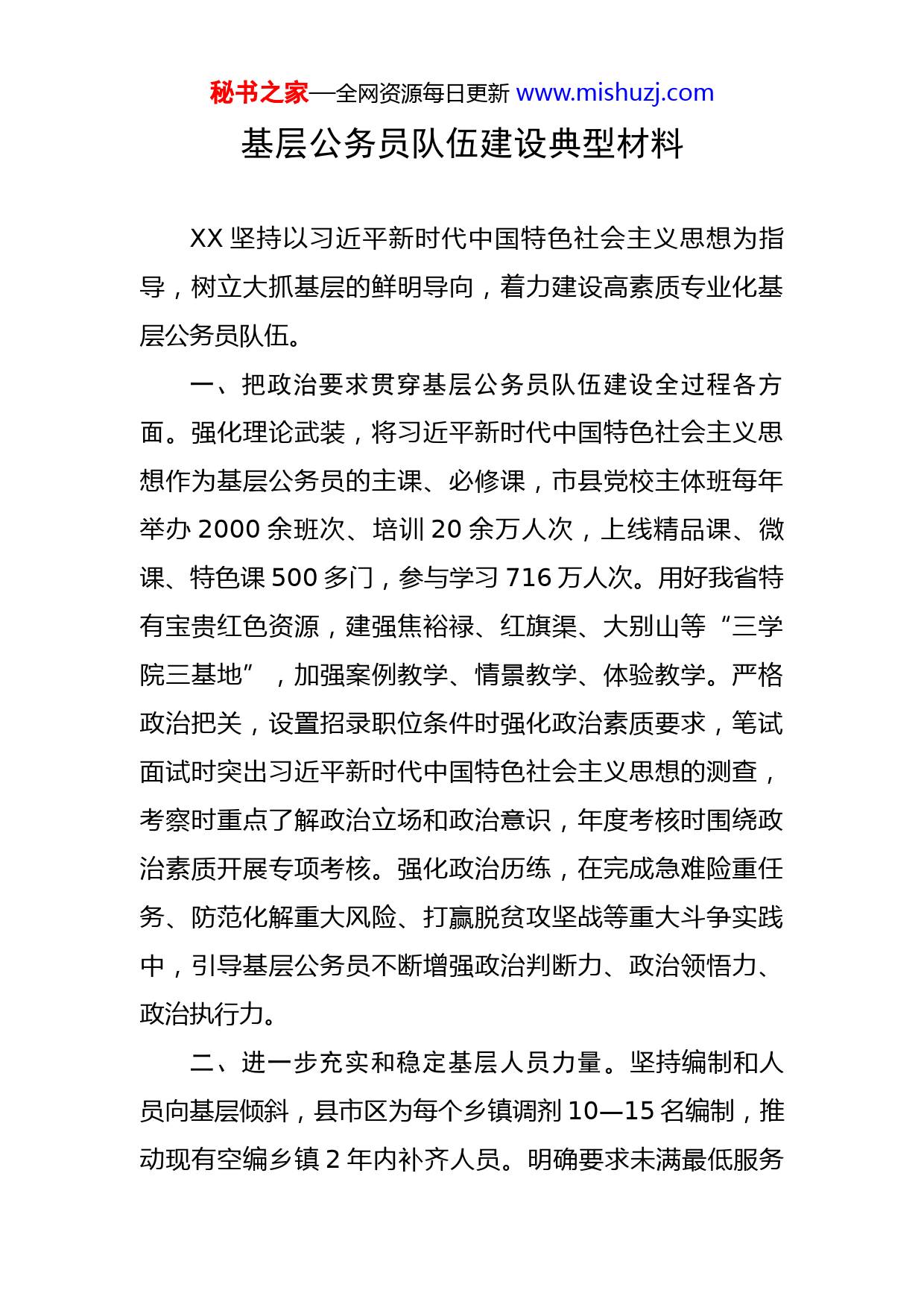 秘书之家—全网资源每日更新www.mishuzj.com基层公务员队伍建设典型材料XX坚持以习近平新时代中国特色社会主义思想为指导,树立大抓基层的鲜明导向,着力建设高素质专业化基层公务员队伍。一、把政治要求贯穿基层公务员队伍建设全过程各方面。强化理论武装,将习近平新时代中国特色社会主义思想作为基层公务员的主课、必修课,市县党校主体班每年举办2000余班次、培训20余万人次,上线精品课、微课、特色课500多门,参与学习716万人次。用好我省特有宝贵红色资源,建强焦裕禄、红旗渠、大别山等“三学院三基地”,加强案例教学、情景教学、体验教学。严格政治把关,设置招录职位条件时强化政治素质要求,笔试面试时突出习近平新时代中国特色社会主义思想的测查,考察时重点了解政治立场和政治意识,年度考核时围绕政治素质开展专项考核。强化政治历练,在完成急难险重任务、防范化解重大风险、打赢脱贫攻坚战等重大斗争实践中,引导基层公务员不断增强政治判断力、政治领悟力、政治执行力。二、进一步充实和稳定基层人员力量。坚持编制和人员向基层倾斜,县市区为每个乡镇调剂10—15名编制,推动现有空编乡镇2年内补齐人员。明确要求未满最低服务秘书之家—全网资源每日更新www.mishuzj.com年限的乡镇公务员不得转任遴选到上级机关,严禁从基层随意借调工作人员。增强基层公务员招录的科学性精准性,合理设置报考资格条件,对艰苦边远地区的乡镇采取适当放宽学历要求、不限制专业条件、调整报考年龄、面向当地户籍等措施,有效缓解基层机关“招人难”问题。近三年来共招录县乡公务员16737名,占全省新招录公务员总数69.9%;为基层招录选调生3814人。每年面向优秀村(社区)党组织书记招录乡镇公务员200名,三年来累计面向大学生村官、“三支一扶”人员招录乡镇公务员755人,在换届中选拔“五方面人员”2437人进乡镇领导班子。三、不断提升基层公务员干事创业本领。实施新时代基层干部主题培训行动,实现全省22万余名基层公务员学习培训全覆盖。大力提升专业能力,编印《县域治理“三起来”》、《乡镇工作“三结合”》等体现基层工作特点的教育读本,加大案例教学、现场教学、模拟演练等实训比重,提升培训的专业性、应用性、实操性,近年来全省共举办专题培训班187期、培训1.9万余人次。深化公务员分类改革,以市场监管队伍为主体,对县以下机关1.9万余名公务员实施行政执法类公务员管理制度,有力推进了基层公务员队伍的专业化建设。狠抓作风建设,实行“13710”闭环落实机制,工作部署当天行动、三天见效、秘书之家—全网资源每日更新www.mishuzj.com七天办结、复杂事项一月办结、所有工作任务清零;深入整治基层公务员队伍中的“四风”,2021年查处侵害群众利益等问题5709起、批评教育帮助和处理9419人。四、持续激励基层公务员担当作为。发挥考核的激励导向作用,将综合评价好的乡镇年度考核优秀等次比例提高到25%,成绩特别突出的还可以适当提高。坚持职级晋升向基层倾斜,明确考录为公务员的村(社区)党组织书记、在村任党组织书记的乡镇(街道)公务员“两个优先”政策。结合疫情防控、抗洪救灾等急难险重任务及时选树基层先进典型,在抗洪救灾中表现突出的1名乡镇党委书记被评为全国“最美公务员”。2021年第四届全省“人民满意的公务员”和“人民满意的公务员集体”中,县以下机关公务员、公务员集体分别占38%、47%。省财政共向市县转移支付15亿元,将全省乡镇工作补贴标准平均提高了近一倍,持续推动乡镇机关工作人员收入高于县直机关同职级人员20%以上。完善乡镇小食堂、小澡堂、周转房等基本生活设施,妥善解决配偶子女就学、就业、就医等问题。