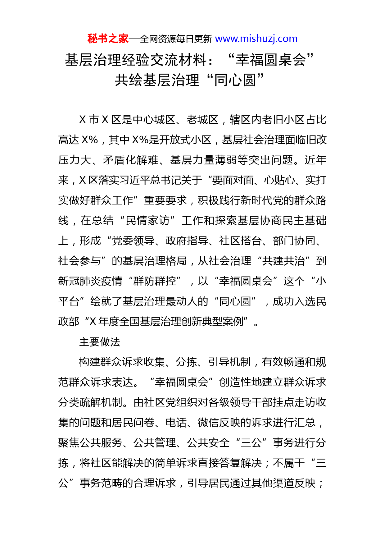秘书之家—全网资源每日更新www.mishuzj.com基层治理经验交流材料:“幸福圆桌会”共绘基层治理“同心圆”X市X区是中心城区、老城区,辖区内老旧小区占比高达X%,其中X%是开放式小区,基层社会治理面临旧改压力大、矛盾化解难、基层力量薄弱等突出问题。近年来,X区落实习近平总书记关于“要面对面、心贴心、实打实做好群众工作”重要要求,积极践行新时代党的群众路线,在总结“民情家访”工作和探索基层协商民主基础上,形成“党委领导、政府指导、社区搭台、部门协同、社会参与”的基层治理格局,从社会治理“共建共治”到新冠肺炎疫情“群防群控”,以“幸福圆桌会”这个“小平台”绘就了基层治理最动人的“同心圆”,成功入选民政部“X年度全国基层治理创新典型案例”。主要做法构建群众诉求收集、分拣、引导机制,有效畅通和规范群众诉求表达。“幸福圆桌会”创造性地建立群众诉求分类疏解机制。由社区党组织对各级领导干部挂点走访收集的问题和居民问卷、电话、微信反映的诉求进行汇总,聚焦公共服务、公共管理、公共安全“三公”事务进行分拣,将社区能解决的简单诉求直接答复解决;不属于“三公”事务范畴的合理诉求,引导居民通过其他渠道反映;秘书之家—全网资源每日更新www.mishuzj.com需要上级支持和群众配合的“三公”事项纳入“幸福圆桌会”议题来解决。经过近一年实施,全区已开展“幸福圆桌会”X场,收到群众反映问题X件,解决X件,正在加快解决X件,对于不能解决的X件,都及时向居民反馈并获得理解。“幸福圆桌会”搭建的各类“居民微信群”“楼院朋友圈”,更成为社区党组织领导下基层疫情防控的重要阵地,有力畅通对封控区、管控区、防范区的医疗防疫物资和生活必需品配送、代办的“最后一米”。构建资源力量在社区聚合机制,有效破解社区治理“单打独斗”困境。“幸福圆桌会”由X区委组织部牵头,区民政局统筹,社区党组织具体实施,各部门协同配合,推动了社会治理资源下沉到基层一线,最大限度地把群众组织起来,把各方力量聚合到社区党组织周围。每个社区每月定期召开一次“幸福圆桌会”,由社区党组织书记主持,参加圆桌会的固定人员为区级挂点领导、街道负责人、社区干部等;机动人员为相关区直单位负责人、“两代表一委员”、共建单位、驻地单位、物业公司、居民代表(含业委会、居民理事会、楼管会、自治委员会、楼栋长)等涉及的利益相关方,通过“面对面”表达诉求、沟通协商、达成共识,形成解决问题的合力。在疫情防控最吃劲时,“幸福圆桌会”的平台功能迅速转化成全社会动员机制,全区顺势将下辖街镇划分为X个防疫网秘书之家—全网资源每日更新www.mishuzj.com格,设立临时党支部X个、党小组X个、党员先锋岗X个,高效整合网格内居民自治组织、单位保安、小区物业、经营业主等社会力量,参与实施“无疫网格”社区创建工作,第一时间筑起守护家园的“哨点”“卡点”“触点”。构建民事民议、民事民决、民事民办机制,有效调动居民主动参与社区治理的积极性。“幸福圆桌会”坚持以人民为中心,尊重群众主体地位,将参与权、话语权、决策权交给社区群众。“圆桌会”只是一个形象说法,并没有圆桌,而是采取圆形座位摆放方式,干部和群众“插花”围坐,居民与政府有关部门、相关利益方平等对话、民主协商,形成“有事大家说、民事共同定、民事一起办”的生动局面,推动基层社会治理从过去“政府干、群众看”到现在“群众定、一起干”的转变,让群众成为社会治理的最广参与者、最大受益者、最终评判者。在老旧小区改造过程中,针对影响居民日常生活的急难愁盼问题,引进业委会强化居民自治,引导群众在“圆桌会”上充分讨论、协商、决策,真正做到改造前工程项目民决、改造后小区治理民办。在完善小区出入口、人行道等基础设施的同时,全面推开、分步推进开放式小区围合管理,力争到X年底,全区已改造、改造中的开放式小区和安置房小区全面完成封闭式改造并实行物业管理,切实提高常秘书之家—全网资源每日更新www.mishuzj.com态化疫情防控基础能力。构建诉求快处、督查跟进、群众评议机制,促进干部作风更加务实为民。“幸福圆桌会”把“群众满意”作为第一标准,做到议题协商确定后马上办、全程督。社区党组织第一时间组织相关部门和利益相关方对项目进行实地考证和综合研判,明确具体可行的操作方案并公示告知,接受群众评议。采取分级督办形式,在议题项目落实过程中成立由社区党组织、相关利益方、项目经办方等成员组成的监督委员会,对项目推进情况进行全过程监督和评议,X区委督查室定期督查、区纪委区监委随机抽查,使干部放下架子、俯下身子,倾听群众意见建议,收集群众利益诉求,及时做好情况反馈,确保为民办事办到实处,用“面对面”地交流、“实打实”地办事换来党群关系的“心贴心”。经验启示加强党的全面领导是实现城市社区有效治理的根本保证。调研中,我们实实在在感受到,加强党的全面领导不是虚的,是具体的,在城市社区治理中发挥了核心作用、得到了活跃跃的体现。“幸福圆桌会”行得通,关键在于党的全面领导贯穿到了城市社区治理的全过程。从平台的搭建到制度的安排,从议题的收集到问题的解