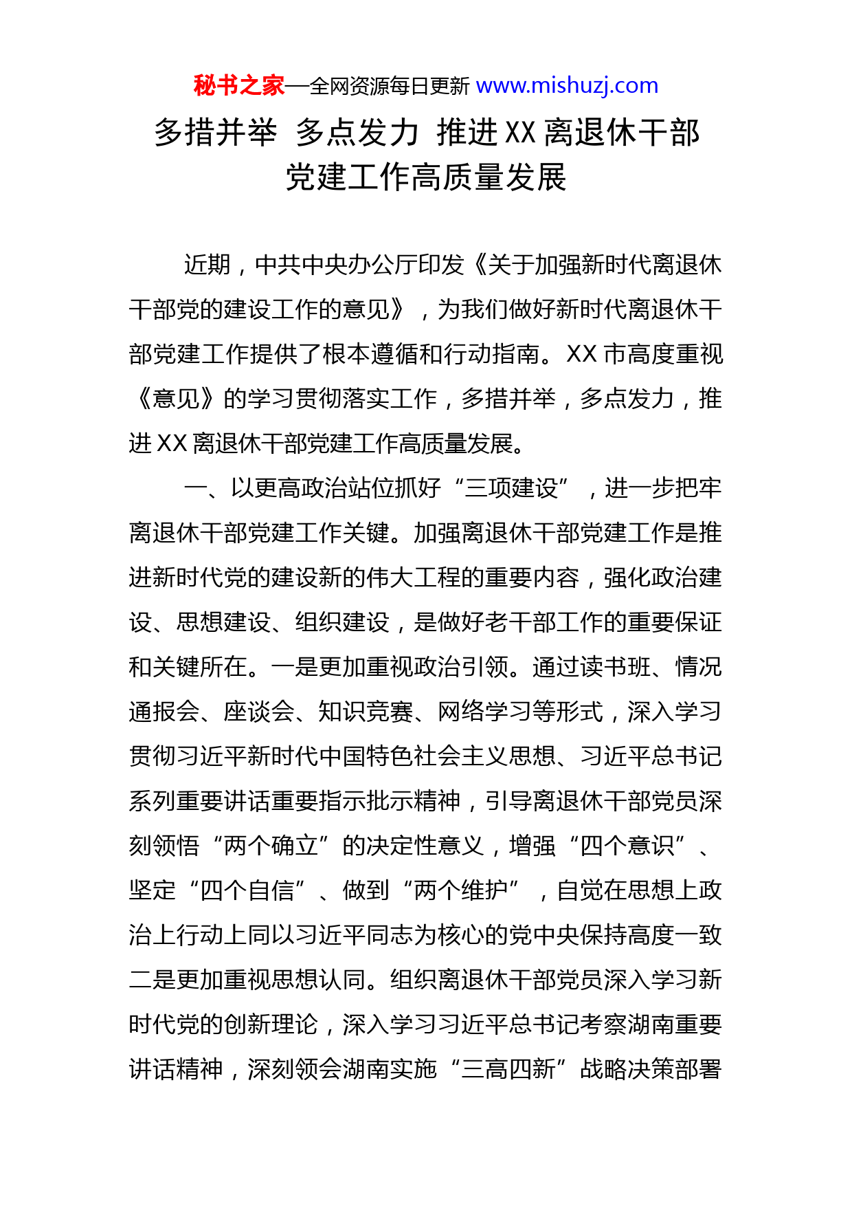 秘书之家—全网资源每日更新www.mishuzj.com多措并举多点发力推进XX离退休干部党建工作高质量发展近期,中共中央办公厅印发《关于加强新时代离退休干部党的建设工作的意见》,为我们做好新时代离退休干部党建工作提供了根本遵循和行动指南。XX市高度重视《意见》的学习贯彻落实工作,多措并举,多点发力,推进XX离退休干部党建工作高质量发展。一、以更高政治站位抓好“三项建设”,进一步把牢离退休干部党建工作关键。加强离退休干部党建工作是推进新时代党的建设新的伟大工程的重要内容,强化政治建设、思想建设、组织建设,是做好老干部工作的重要保证和关键所在。一是更加重视政治引领。通过读书班、情况通报会、座谈会、知识竞赛、网络学习等形式,深入学习贯彻习近平新时代中国特色社会主义思想、习近平总书记系列重要讲话重要指示批示精神,引导离退休干部党员深刻领悟“两个确立”的决定性意义,增强“四个意识”、坚定“四个自信”、做到“两个维护”,自觉在思想上政治上行动上同以习近平同志为核心的党中央保持高度一致二是更加重视思想认同。组织离退休干部党员深入学习新时代党的创新理论,深入学习习近平总书记考察湖南重要讲话精神,深刻领会湖南实施“三高四新”战略决策部署秘书之家—全网资源每日更新www.mishuzj.com和XX“培育制造名城、建设幸福XX”发展目标,更加自觉践行习近平新时代中国特色社会主义思想,更加自觉地支持市委市政府的工作。三是更加重视组织力提升。认真贯彻落实《意见》要求,以提升组织力为重点,不断创新组织设置方式,推进“地缘、趣缘、学缘、业缘”功能性党组织建设,提高组织覆盖;不断创新活动方式,坚持和完善重温入党誓词、过政治生日等政治仪式,提高组织生活质量;不断创新“共享”机制,采取“场地共享、内容定制”的方式,进一步扩大“美在金秋”老党员之家覆盖面不断健全党建联络员制度。深入开展“离退休干部党组织建设质量提升行动”,持续抓好“六好”示范离退休干部党支部创建工作。二、以更实工作举措推进“三化工作”,进一步提升离退休干部党建工作水平。《意见》提出坚持稳中求进、守正创新、求真务实,推进离退休干部党建工作信息化、精准化、规范化。一是搭建好信息化平台。在全市逐级逐层建立离退休干部党建工作群、支委成员群、党员学习交流群三类微信群,定期推送政治理论学习“套餐”。不断完善“三湘老干部e家”XX频道、“XX老干部”微信公众号等信息化平台中“云党建”模块功能,探索运用党务、政务、服务和互动交流等功能。二是树立好精准化理念。秘书之家—全网资源每日更新www.mishuzj.com聚焦离退休干部党员生理与心理差异,注重分类指导。对于“双高期”离休干部党员,采取党内关怀、困难帮扶、送学上门等方式,让他们感受党的温暖。同时,积极推进适老化改造,切实落实“一对一”服务,完善“一人一策”举措。对于退休干部,注重引导发挥作用,采取自学与辅导结合强化思想政治建设,调动起他们的积极性和创造性。三是完善好规范化体系。在健全信息档案、强化党性教育、加强阵地建设等方面进行规范,健全工作机制,优化工作流程。规范日常教育,引导离退休干部党员强化制度意识、党员意识,自觉做到党的意识不弱化、党员标准不降低、党内生活不脱离,严守党的纪律和规矩。切实落实干部荣誉退休制度,增强干部退休的归属感、荣誉感幸福感。三、以更宽平台载体凸现“三大优势”,进一步增强离退休干部党建工作成效。XX市第十三次党代会擘画了“培育制造名城、建设幸福XX”的目标,在新的愿景感召下积极引导全市离退休干部党员发挥优势,向中心聚焦、向大局聚力。一是更加注重发挥政治优势。围绕党的全面领导,引导离退休干部党员继续做全面从严治党的坚定支持者和模范践行者,继续做坚持中国特色社会主义制度的坚定拥护者和模范践行者,继续围绕全市中心工作献智献秘书之家—全网资源每日更新www.mishuzj.com策,讲好XX故事,传播XX精神,以昂扬斗志迎接党的二十大召开。二是更加注重发挥经验优势。推动“银发人才”资源二次开发,成立“长株潭一体化发展老干部智囊团”和“湘赣边示范区建设老干部智囊团”,助力“三高四新”战略。注重发挥老专家、老技术骨干技术攻关、“传帮带”等方面的重要作用,助力“制造名城”目标。不断建强和壮大老干部志愿服务骨干队伍,实现每个县市区都有离退休干部志愿者队伍,每个队伍都有特色,探索“时间银行”等互助式养老志愿服务做法,助力“幸福XX”愿景。三是更加注重发挥威望优势。不断创新活动平台,引导离退休干部党员在文明创建、乡村振兴、疫情防控、基层治理、关心下一代等方面发挥积极作用,注重发挥家庭家教家风在基层社会治理中的重要作用。同时,注重在离退休干部中发现典型、塑造典型、宣传典型,继续开展寻找“最美老干部”活动。四、以更强责任担当落实“三个保障”,进一步夯实离退休干部党建工作基础。《意见》强调,要强化组织领导,落实工作责任,建强工作队伍,完善基础保障,积极开拓创新,为扎实做好离退休干部党的建设工作提供有力保障。一是更加强化组织保障。把离退休干部党建工作纳入全市党建