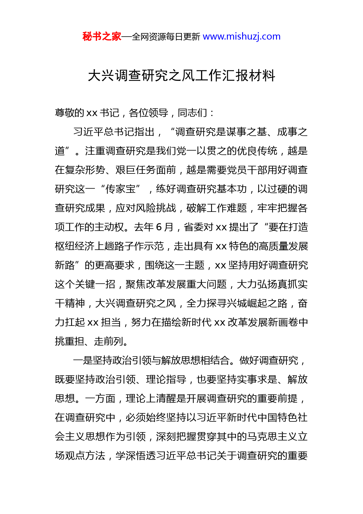 秘书之家—全网资源每日更新www.mishuzj.com大兴调查研究之风工作汇报材料尊敬的xx书记,各位领导,同志们:习近平总书记指出,“调查研究是谋事之基、成事之道”。注重调查研究是我们党一以贯之的优良传统,越是在复杂形势、艰巨任务面前,越是需要党员干部用好调查研究这一“传家宝”,练好调查研究基本功,以过硬的调查研究成果,应对风险挑战,破解工作难题,牢牢把握各项工作的主动权。去年6月,省委对xx提出了“要在打造枢纽经济上趟路子作示范,走出具有xx特色的高质量发展新路”的更高要求,围绕这一主题,xx坚持用好调查研究这个关键一招,聚焦改革发展重大问题,大力弘扬真抓实干精神,大兴调查研究之风,全力探寻兴城崛起之路,奋力扛起xx担当,努力在描绘新时代xx改革发展新画卷中挑重担、走前列。一是坚持政治引领与解放思想相结合。做好调查研究,既要坚持政治引领、理论指导,也要坚持实事求是、解放思想。一方面,理论上清醒是开展调查研究的重要前提,在调查研究中,必须始终坚持以习近平新时代中国特色社会主义思想作为引领,深刻把握贯穿其中的马克思主义立场观点方法,学深悟透习近平总书记关于调查研究的重要秘书之家—全网资源每日更新www.mishuzj.com论述,学会运用战略思维、历史思维、辩证思维,提高运用科学理论解决实际问题的能力;另一方面,思想的解放是做好调查研究工作的必然要求,在调查研究中,不能按部就班,更不能犯“经验主义”“本本主义”错误,必须不断解放思想,透过现象看本质,找准症结,拿出有效对策。xx坚持把习近平新时代中国特色社会主义思想作为做好一切工作的行动指南,把解放思想作为谋划推动工作的关键环节,在全市深入开展“彰显xx担当,我们怎么干”解放思想大讨论活动,坚持跳出xx看xx,向好的学、跟强的比、与快的赛,赴杭州、深圳、长沙、合肥等先进地区学习考察调研,广泛发动干部群众参与讨论,征求各类意见建议,系统推出城市建管十大提升行动、产业高质量发展十大提升行动、十大文化重点工程和“人才10条”政策等系列务实举措,有力增强全市发展的科学性、前瞻性和成效性。二是坚持高处谋局和细处落子相结合。从高处审视全局和从细处落地落实,是正确认识和处理事物的两条路径、两种方法,也是领导干部开展调查研究的基本要求。在调查研究中,既要善于观大势、谋大事,站在战略和全局的高度观察和处理问题,在制定政策时冷静观察、谨慎从事谋定而后动;又要善于抓要害、见真招,从大处着眼、小处着手,将战略方向变成具体举措,推动各项工作落地见秘书之家—全网资源每日更新www.mishuzj.com效。当前,面对百年未有之大变局,国内外经济形势发生重大调整,特别是新一轮技术革命与产业变革带来的全新挑战,xx站在战略全局高度,从宏观着眼,准确把握发展大势,科学研判经济形势,主动融入构建“双循环”新发展格局,精准把握全球航空产业大调整、电子信息产业迎来新的爆发点等新趋势新机遇,加快战略新兴产业在xx布局。在此基础上,坚持从微观着手,分析各地各行业特别是企业经营调整情况,抢抓北京非首都功能疏解、发达地区产业外溢、央企“二次布局”、大企业“二次创业”战略机遇,积极对接产业转移,将产业发展落到项目上,全力开展招大引强,与华为、阿里、工业富联、软通动力、科大讯飞等龙头企业达成战略合作,推动xx等x个百亿项目落户xx,促成协议投资额达xx亿元。三是坚持吃透上情与摸清下情相结合。贴紧上级决策部署,围绕现实难题,解决群众所难,是领导干部开展调查研究工作的根本出发点。一方面,要准确领会党中央和省委决策部署要求,学深悟透上级会议和文件精神,把准调查研究方向;另一方面,要深入基层捕捉信息,发现苗头性、倾向性问题,找到群众遇到的现实难题,做到有的放矢。2022年以来,xx坚决按照党中央和省委决策部署要求,切实践行人民至上、生命至上理念,统筹推进疫情防控和经济社会发展,深入研究政策,全面梳理疫情以来中秘书之家—全网资源每日更新www.mishuzj.com央和省级各项政策,特别是民生领域帮扶政策,严格推进政策落实,并结合xx实际,制定出台了《有效应对疫情稳定经济增长25条政策措施》《关于做好“六稳”工作落实“六保”任务的实施办法》等系列文件。同时,针对群众反映强烈的突出问题,研究具体办法,采取有力措施予以解决,重点围绕农贸市场及周边脏乱差、公共停车难、老旧小区居住环境差、社区服务弱等问题,在征求群众意见深入调研论证的基础上果断决策,迅速开展农贸市场整治“百日攻坚行动”,对涉及xx余万人的xx个老旧小区实施提升改造,建成“1+5+X”社区邻里中心xx个,有效改善了居民生活,人民群众幸福指数持续攀升。四是坚持解决问题与建立机制相结合。开展调查研究的目的在于通过找问题、摸实情、出对策、破难题,最后形成制度机制,推动工作长效常态化发展。这就需要在调查研究中,坚持标本兼治,既要紧盯难题,重点突破,快速解决,又要找到共性,务实举措,形成成果,让每项调研不仅是解决问题的过程,更是建立制度机制的过程。2022年以来,xx坚持在调研中破难题、建机制,通过对县区、开发区、管理局、主要市直部门、市直单位和乡镇街道村委(社区)一线开展系统调研,以及分专题进行深入调研摸