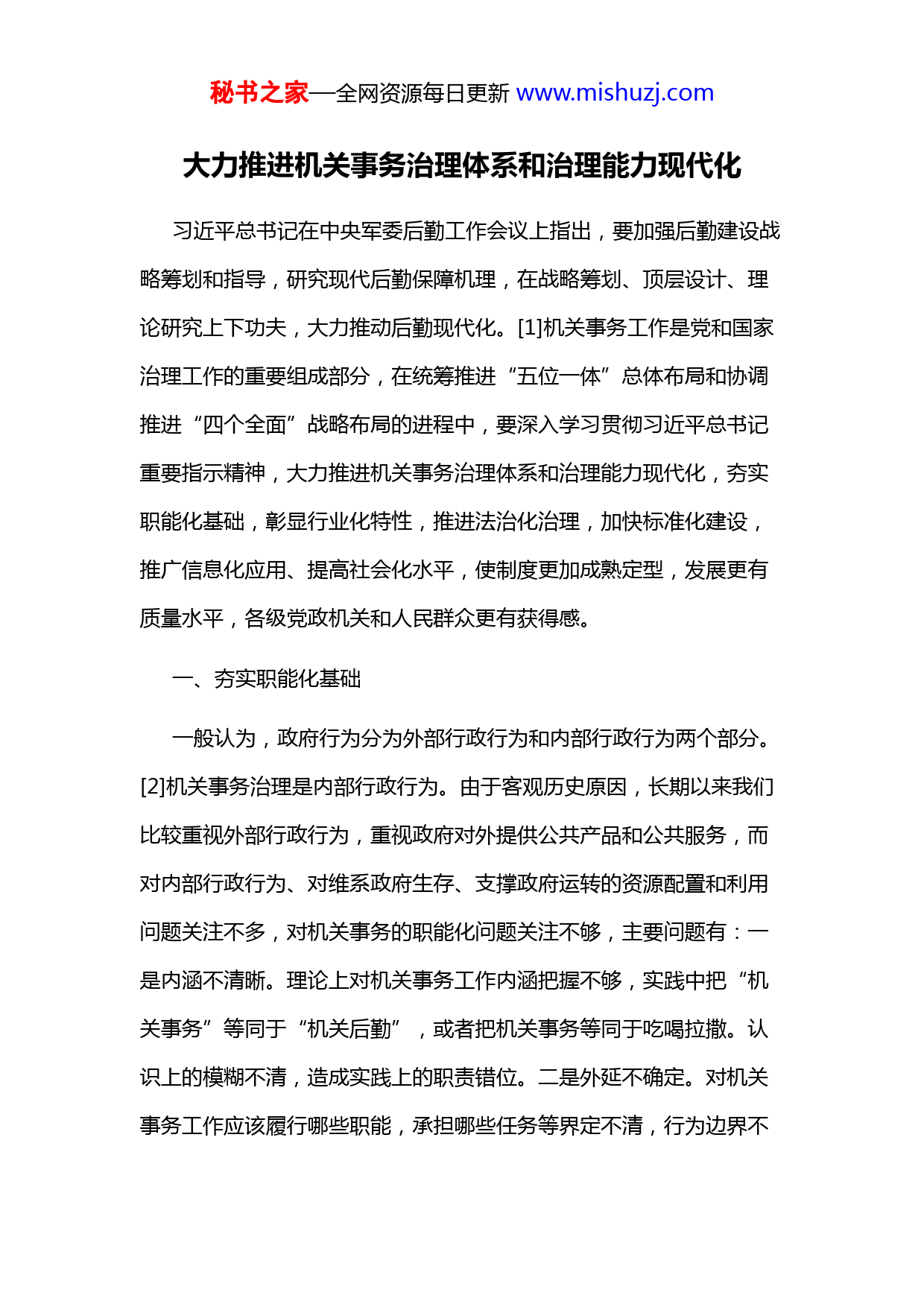 秘书之家—全网资源每日更新www.mishuzj.com大力推进机关事务治理体系和治理能力现代化习近平总书记在中央军委后勤工作会议上指出,要加强后勤建设战略筹划和指导,研究现代后勤保障机理,在战略筹划、顶层设计、理论研究上下功夫,大力推动后勤现代化。[1]机关事务工作是党和国家治理工作的重要组成部分,在统筹推进“五位一体”总体布局和协调推进“四个全面”战略布局的进程中,要深入学习贯彻习近平总书记重要指示精神,大力推进机关事务治理体系和治理能力现代化,夯实职能化基础,彰显行业化特性,推进法治化治理,加快标准化建设,推广信息化应用、提高社会化水平,使制度更加成熟定型,发展更有质量水平,各级党政机关和人民群众更有获得感。一、夯实职能化基础一般认为,政府行为分为外部行政行为和内部行政行为两个部分。[2]机关事务治理是内部行政行为。由于客观历史原因,长期以来我们比较重视外部行政行为,重视政府对外提供公共产品和公共服务,而对内部行政行为、对维系政府生存、支撑政府运转的资源配置和利用问题关注不多,对机关事务的职能化问题关注不够,主要问题有:一是内涵不清晰。理论上对机关事务工作内涵把握不够,实践中把“机关事务”等同于“机关后勤”,或者把机关事务等同于吃喝拉撒。认识上的模糊不清,造成实践上的职责错位。二是外延不确定。对机关事务工作应该履行哪些职能,承担哪些任务等界定不清,行为边界不秘书之家—全网资源每日更新www.mishuzj.com明,造成系统和行业职能差异较大,发展不平衡。三是内容不稳定。经济发达地区与落后地区之间、沿海开放城市与内陆城市之间,一级预算部门不同系统之间,工作内容差别大。有的职能饱满,任务繁重;有的工作任务单一。四是权责不明晰。有些宏观管理部门越位、错位地管理机关事务领域的事项,热衷于房、地、车等具体微观事项的审批,造成权责不明晰,责任不落地。[3]因此,有必要夯实机关事务职能化基础。(一)职能化的工作原则职能化是适应“善治”需要,实现政府职能结构“帕累托最优”的持续追求,是行政权力的科学化配置问题。机关事务工作主要任务是对机关服务保障资源进行科学组织、合理指挥、充分协调与有效控制,使机关运转及其职工的一定生活需求得满足和保障的社会生产过程。与这一社会生产过程相匹配的职能化建设必须坚持以下原则:集中统一、分级管理。落实《机关事务管理条例》规定,体现集中和统一的要求,一级预算部门只设一个机关事务管理机构。国家机关事务主管部门负责全国机关事务工作的业务指导,地方机关事务管理部门按照国家要求,实施具体管理。管办分离、分业推进。把机关事务管理职能和后勤服务职能分开,管理上抓好制定计划、确立标准、建立制度、配置资源、评价考核等工作。服务上坚持市场的决定性作业用,改革现有后勤服务机构,推进机关购买服务,建立契约关系。区别对待、分类指导。照顾不同地区和部门实际,选择符合实际操作强的改革方秘书之家—全网资源每日更新www.mishuzj.com案,合理确定改革力度、步骤和进程,保持渐进性、连续性和有序性,避免照搬照抄和不切实际。(二)职能化的重点任务重点要关注三个问题:第一,机构统一问题。机构统一的主要任务:一是借鉴美国、英国、俄罗斯等国家大部门体制“宽职能、少机构”的横向格局和建设“有限且有效的政府”模式,在党政群团等一级预算单位,只设置一个机关事务管理机构,建立国家总局和省、市、县局的体制架构。二是注重工作职能在政府部门间的二、三次配置,将政府政务和事务职能合理、科学地配置到不同部门,客观界定机关事务部门与发展改革、财政、国土等部门的职能边界,保证完整、全面、独立履行职能。三是建立从中央到地方全面业务指导关系,统一行业标准和工作要求,确保体制统一、法制统一和政令畅通。第二,职能明确问题。机关事务管理的主要任务是对机关资源进行理性配置、组织和使用,使其产生最佳的管理行为效果。这种角色定位决定了机关事务工作应该以运行经费、机关用地、办公用房和设备、职工住宅、公务用车、政府采购、能源节约、公务接待、差旅会议、领导同志服务等管理为核心职能;以信息服务、车辆服务、物业服务、餐饮服务、幼教服务、会议服务、宾馆服务等为一般职能;以培训教育、精神文明、爱国卫生、绿化美化、计划生育、综合治理等为辅助职能。秘书之家—全网资源每日更新www.mishuzj.com第三,关系法定问题。注重用法律法规界定机关事务部门与其他部门的关系,其中,最重要的是府际关系。[4]从内容上看,府际关系涉及政府和部门间职能划分、权力配置、利益分配和责任分担等问题。比如,通过投资关系、预算关系等方面体现出来的政府部门间财权关系,都会在部门内部投资计划管理、财务经费管理以及物业服务、后勤服务等方面体现出来。通过协调政府和政府部门间利益关系,能更好地构筑公正透明的机关事务管理关系,解决越位、缺位和错位问题。二、彰显行业化特征习近平总书记指出,后勤专业门类多。机关事务工作有其特有的专业门类和行业化特征,在推进治理体系和治理能力现代化进程中,必须彰显这些门类和特征,打造行业形象和行业品牌。(一)