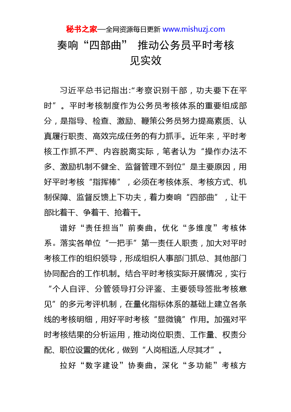 秘书之家—全网资源每日更新www.mishuzj.com奏响“四部曲”推动公务员平时考核见实效习近平总书记指出:“考察识别干部,功夫要下在平时”。平时考核制度作为公务员考核体系的重要组成部分,是指导、检查、激励、鞭策公务员努力提高素质、认真履行职责、高效完成任务的有力抓手。近年来,平时考核工作抓不严、内容脱离实际,笔者认为“操作办法不多、激励机制不健全、监督管理不到位”是主要原因,用好平时考核“指挥棒”,必须在考核体系、考核方式、机制保障、监督反馈上下功夫,着力奏响“四部曲”,让干部比着干、争着干、抢着干。谱好“责任担当”前奏曲,优化“多维度”考核体系。落实各单位“一把手”第一责任人职责,加大对平时考核工作的组织领导,形成组织人事部门抓总、其他部门协同配合的工作机制。结合平时考核实际开展情况,实行“个人自评、分管领导打分评鉴、主要领导签批考核意见”的多元考评机制,在量化指标体系的基础上建立各条线的考核明细,用好平时考核“显微镜”作用。加强对平时考核结果的分析运用,推动岗位职责、工作量、权责分配、职位设置的优化,做到“人岗相适,人尽其才”。拉好“数字建设”协奏曲,深化“多功能”考核方秘书之家—全网资源每日更新www.mishuzj.com式。可以组织开发统一的公务员平时考核应用平台,以标准统一、功能齐全、模块清晰、方便基层为目的,推动平时考核媒介由纸质化向电子化转变,嵌入“分管领导实时点评、考核对象实时响应”的“直通车式”对话功能,实现考核主体依靠计算机即可完成平时考核任务,缩短工作流程,提升考核效率。奏好“创新激励”交响曲,强化“多要素”机制保障。用好平时考核结果,能够为激励干部担当作为配好“强引擎”、树好“风向标”。将平时考核结果与年度考核直接挂钩,如平时考核结果按一定比例计算后纳入年度考核,使平时考核在年度考核综合评分中占有一定比重,形成既有正向激励又有负面约束的全方位奖惩链条,激发实干担当的“鲶鱼效应”。目前,大部分单位的公务员平时考核工作均由组织人事部门负责,可以创建一支政治思想过硬、业务水平较高的考核队伍,探索成立承办平时考核日常业务的机构,根据各地区实际情况核定人员编制数量。把平时考核结果的应用纳入规范化、制度化、常态化轨道,在“奖励先进”和“鞭策后进”两方面同时发力,可以与财政部门对接,每年划拨一定数额的专项资金,用于发放平时考核奖金。演好“监督管理”合奏曲,细化“多举措”反馈形式。组织人事部门可以探索开展“集中调研周”“专题调秘书之家—全网资源每日更新www.mishuzj.com研月”等活动,加强对各单位平时考核实施的日常检查和督促。重点发挥群众监督和社会监督等体制外监督的作用,畅通普通干部职工和服务对象的问题反馈渠道,采用调查问卷、网络投票、电子打分等形式构建群众满意度评价制度,对公务员的工作态度、能力、作风、效果等进行规范和监督,向下听取民众真实的反应,增强考核的透明性、公正性和客观性。