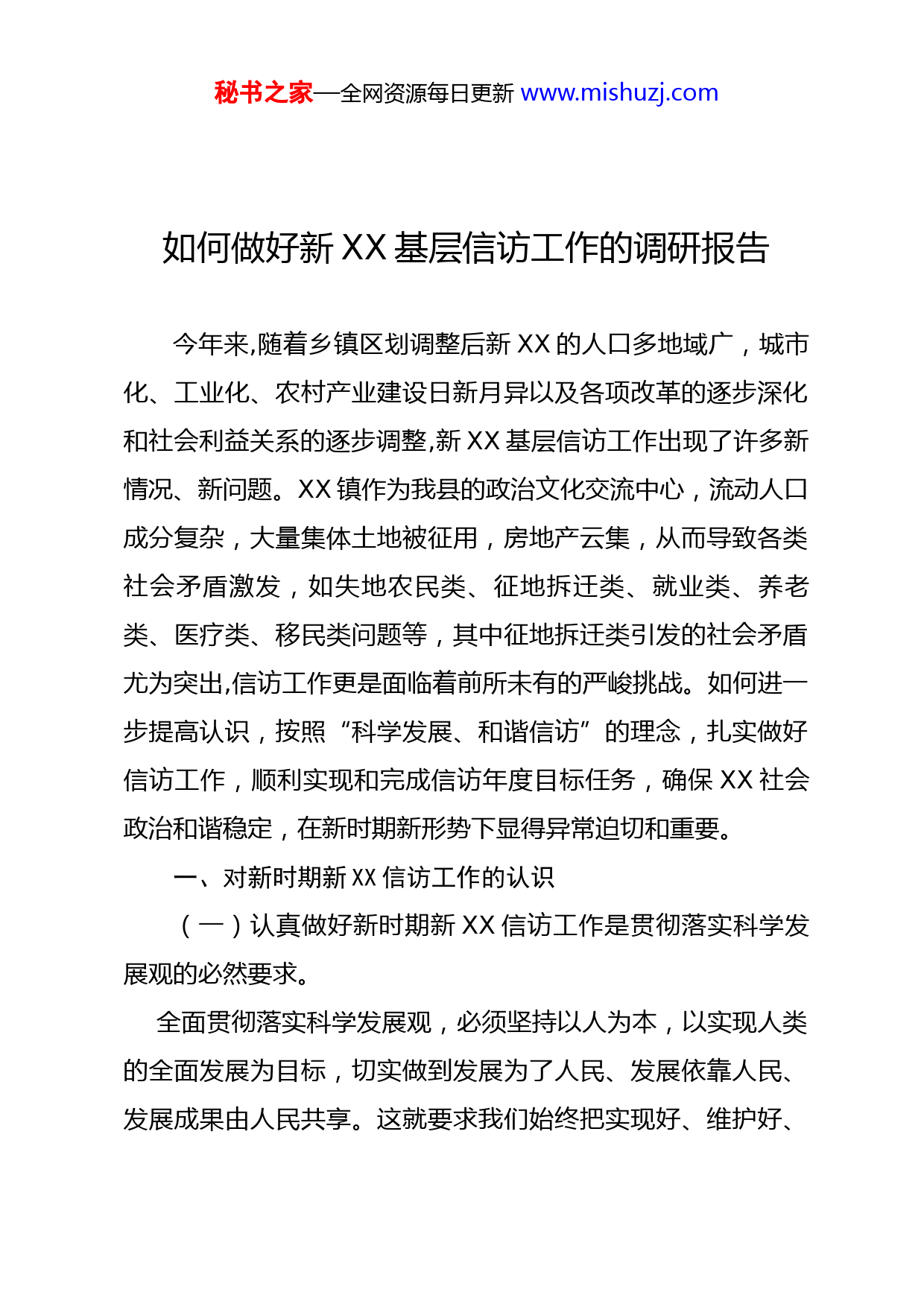 秘书之家—全网资源每日更新www.mishuzj.com如何做好新XX基层信访工作的调研报告今年来,随着乡镇区划调整后新XX的人口多地域广,城市化、工业化、农村产业建设日新月异以及各项改革的逐步深化和社会利益关系的逐步调整,新XX基层信访工作出现了许多新情况、新问题。XX镇作为我县的政治文化交流中心,流动人口成分复杂,大量集体土地被征用,房地产云集,从而导致各类社会矛盾激发,如失地农民类、征地拆迁类、就业类、养老类、医疗类、移民类问题等,其中征地拆迁类引发的社会矛盾尤为突出,信访工作更是面临着前所未有的严峻挑战。如何进一步提高认识,按照“科学发展、和谐信访”的理念,扎实做好信访工作,顺利实现和完成信访年度目标任务,确保XX社会政治和谐稳定,在新时期新形势下显得异常迫切和重要。一、对新时期新XX信访工作的认识(一)认真做好新时期新XX信访工作是贯彻落实科学发展观的必然要求。全面贯彻落实科学发展观,必须坚持以人为本,以实现人类的全面发展为目标,切实做到发展为了人民、发展依靠人民、发展成果由人民共享。这就要求我们始终把实现好、维护好、秘书之家—全网资源每日更新www.mishuzj.com发展好广大群众的根本利益作为一切工作的出发点和落脚点,采取各种有效措施,及时了解民情,充分集中民智,切实为民谋利。认真做好信访工作,进一步畅通信访渠道,倾听群众呼声,广纳群众智慧,代表和维护群众利益,充分调动人民群众参与现代化建设的主动性、创造性,切实将人民群众贯彻落实科学发展的积极性保护好、引导好、发挥好,只有这样才能够群策群力,真正把科学发展观的要求落到实处。(二)认真做好新时期信访工作是构建社会主义和谐社会的内在需要。必须充分发挥信访工作的职能,充分发挥信访工作在构建和谐社会中的基础性作用,及时妥善地化解各类矛盾和纠纷,理顺群众情绪,最大限度地将消极因素转化为积极因素,化不稳定因素、不和谐因素为稳定和谐因素。同时通过教育和积极引导群众以理性合法的方式表达自己的利益诉求,帮助群众解决他们最关心、最直接、最现实的利益问题,促进社会公平正义,促进社会和谐稳定。二、现阶段信访工作存在的主要问题(一)群众片面理解政策。有少数群众受利益驱动片面理解政策,更有的法制观念淡薄,错误认为党和政府怕“闹事”,认为闹得越厉害,问题解秘书之家—全网资源每日更新www.mishuzj.com决得越快。在这类错误思想驱动下,经常出现群众集体上访、越级上访现象。特别是在特殊重大敏感时期,个别信访人员常借上级考核基层“0”进京为由胁迫基层党委政府领导解决其各种不合理要求,令基层党委政府陷入被动、尴尬处境。(二)政策规定不够完善。由于各地经济发展的不平衡以及相关政策的滞后性、不连贯性,导致对同一类人员、同一类问题的解决存在多样性,给实际工作带来诸多被动,从而形成政策规定落实不了,造成群众意见大,对政策持怀疑态度,引发群众情绪不满从而激发群体矛盾,使之成为历史遗留问题,造成历史欠账。例如涉军群体、民办代课教师等。(三)工作措施不够扎实。一是社会稳定预测机制不够健全。部分干部认为群众的信访问题无足轻重,对部分苗头性信访动态,未及时发现。二是社会稳定整合力量的工作机制不够健全。如针对在重大项目、农村征地用地、拆迁安置、城市建设管理、企业经营转制等方面出现的矛盾,在处理过程中,各方力量没有得到有效整合,没有形成协同处理的工作局面,各涉及部门未形成工作合力。例如廖德信访事件,涉及部门较多历时久,矛盾至今未得到化解。三是部分信访群众信访不信法。重特大敏感时期经常信访秘书之家—全网资源每日更新www.mishuzj.com实行一票否决制,由于领导干部过于重视信访维稳压力,一些信访群众认为通过信访解决问题的速度、效果、利益均大于通过司法渠道,导致部分信访群众信法不信法。四是政策不够公开透明。一些村或集体在惠民政策和财务公开做得不够到位,造成一些群众上访。三、做好XX信访工作的措施(一)坚持面向基层,着眼源头控制。基层是信访工作的源头,是信访工作的起点和基础。认真做好基层信访工作,进一步增强基层就地化解矛盾的能力,是做好新形势下信访工作的关键所在。因此,原XX、东塔、百顷的干部合并后必须尽快熟悉新XX的情况。对重点矛盾和人员进行梳理,加好新的台账,分类实施。面向基层,依靠基层,及早发现问题,及时化解矛盾,奠定工作基础。一是把握“先信后访”这一信访基本规律,切实加大群众来信办理工作力度,提高初信一次性办结率,力求把群众的利益诉求解决落实在办理来信环节,有效防止来访或越级访的发生。二是加强和改善基层社会管理,综合运用司法调解、人民调解、行政调解、邻里调和等手段,着力把矛盾化解在基层,把隐患消除在萌芽,把群众稳定在当地,使基层真正成为信访维稳工作的第一道防线。秘书之家—全网资源每日更新www.mishuzj.com(二)坚持超前工作,着力隐患排查。超前防范,超前化解是做好信访工作的一种有效途径,凡事预则立,不预则废。一是必须善于见微知著,增强信访工作的主动性、超前性,把更多的精力用于信访问题的事前防范,牢牢把握信访工作的主动权,确保各项工作措施都能得到较好的贯彻与