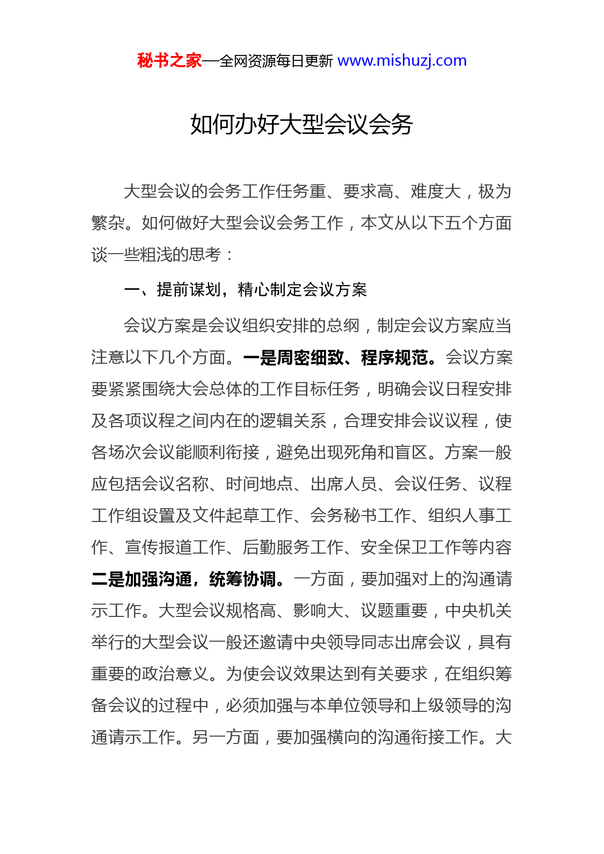 秘书之家—全网资源每日更新www.mishuzj.com如何办好大型会议会务大型会议的会务工作任务重、要求高、难度大,极为繁杂。如何做好大型会议会务工作,本文从以下五个方面谈一些粗浅的思考:一、提前谋划,精心制定会议方案会议方案是会议组织安排的总纲,制定会议方案应当注意以下几个方面。一是周密细致、程序规范。会议方案要紧紧围绕大会总体的工作目标任务,明确会议日程安排及各项议程之间内在的逻辑关系,合理安排会议议程,使各场次会议能顺利衔接,避免出现死角和盲区。方案一般应包括会议名称、时间地点、出席人员、会议任务、议程工作组设置及文件起草工作、会务秘书工作、组织人事工作、宣传报道工作、后勤服务工作、安全保卫工作等内容二是加强沟通,统筹协调。一方面,要加强对上的沟通请示工作。大型会议规格高、影响大、议题重要,中央机关举行的大型会议一般还邀请中央领导同志出席会议,具有重要的政治意义。为使会议效果达到有关要求,在组织筹备会议的过程中,必须加强与本单位领导和上级领导的沟通请示工作。另一方面,要加强横向的沟通衔接工作。大秘书之家—全网资源每日更新www.mishuzj.com型会议的顺利开展,是会务组织部门与文件起草、组织人事、宣传报道、后勤服务、安全保卫等部门密切配合、相互协作的结果,因此在会议筹备期间,必须加强与上述部门的横向沟通衔接工作,合理调整工作进度,加强配合,共同推进筹备工作全面有序进行。三是细化分工、倒排工序。要逐项细化分解任务、确定职责分工,使各部门明确会议每个阶段、每个环节的职责和分工,避免出现推诿扯皮的现象。要采取倒排工序方式对承担的工作任务进行合理安排,进一步细化方案的工作分工时间节点,夯实岗位职责,使各单位能依据倒排时间表,认真对照检查,确保按时完成,实现无缝对接。二、把握细节,认真做好会前演练一是对会议细节进行逐项演练。会前要对每场大会的每项任务和分工进行逐项推演,对可能出现的情况和问题提早研究解决办法,在此基础上制定详细的分工明细表,使每个人都清楚自己的任务,并了解其他人的任务,确保工作没有漏洞、任务没有漏项、人员没有漏位。二是在会场住地进行实地演练。随着会期临近,会务组织者应深入会场、住地,根据大会日程一项项地对会务细节进行实地演练,按照“提前一天”“提前两个小时”“提前一个小秘书之家—全网资源每日更新www.mishuzj.com时”的标准做好会议场地布置工作,即每一个会场提前一天布置完毕,每一项活动提前一天部署到位;会务工作者提前两个小时到达会场,一切准备工作提前两个小时就绪全体会议时组织会议代表和列席人员提前一个小时入场。三是临近会议前的重点环节演练。牵牛要牵牛鼻子,筹备大型会议也要善于抓住其中的重点关节,如果大会的重点环节出现瑕疵,整个大会的效果就会大打折扣,甚至出现无法挽回的不良影响。对待重点环节,要加强会前演练,做到思想上高度重视、精力上重点倾斜、细节上重点考虑,确保万无一失。三、热情周到,搞好会议期间的组织服务会议期间的服务可分为会场内服务和会场外服务,涉及会议报到、食宿安排、医疗服务、车辆安排、材料分发引导入座、会议记录、录音摄像等诸多环节。只有热情周到地做好服务工作,才能使场内外各个环节有机衔接。一是加强值班畅通运行机制。会议值班的作用是收集和发送有关会议的信息,协调处理会议期间各项工作和突发事件落实领导交办的事项等。在大型会议中,大会总值班室一般为各住地会务服务工作的总协调部,各住地会务值班室为本住地发文、生活、安全以及与会议代表联络的联系机秘书之家—全网资源每日更新www.mishuzj.com构,通过建立会议值班制度,畅通大会筹备机构、住地会务服务机构、会议代表之间的沟通联系,便于上传下达、沟通联系和紧急事项的处理,使会议代表得到更加优质高效的服务。二是紧盯细节把握会场节奏。会议期间会务工作者要紧绷着一根弦,紧盯住各种细节。比如,要与音响师、播音员做好对接工作,准备一套会议主持词交给音响师和播音员,以方便其把握议程安排;会议开始前要安排专人到会场清点人数,会前五分钟及时提醒尚未到会场的参会人员;会中检查会议室的音响、灯光、室温、通风、通信屏蔽等情况,根据实际情况进行调整;维护会场秩序防止无关人员进入会场,提醒与会人员关闭手机等。四、改进会风,厉行勤俭节约组织筹备大型会议,要严格贯彻落实中央八项规定精神,采取切实有效的措施改进会风。一是简化会场布置、节约会议用品。大会会场的主席台要简化绿植花草布置,报告席、发言席不摆放鲜花,不挂欢迎标语、不设大型显示屏;住地会场不摆放花草绿植、不铺设地毯、不悬挂会标、不制作背景板。要加强会议用品的管理和循环利用,提高会议用品使用率,减少一次性用品,根据需要提供笔本和纸张,切实降低会议成本。二是简化迎送接待、严控秘书之家—全网资源每日更新www.mishuzj.com会外活动。不在机场、火车站、住地举行迎送会议代表仪式,不张贴悬挂标语横幅,不铺地毯、不献花;会议代表入住的房间不摆放鲜花。不组织代表到景点参观游玩,不举办联欢晚会。三是加强乘车管理、严格用餐标准。会议代表分