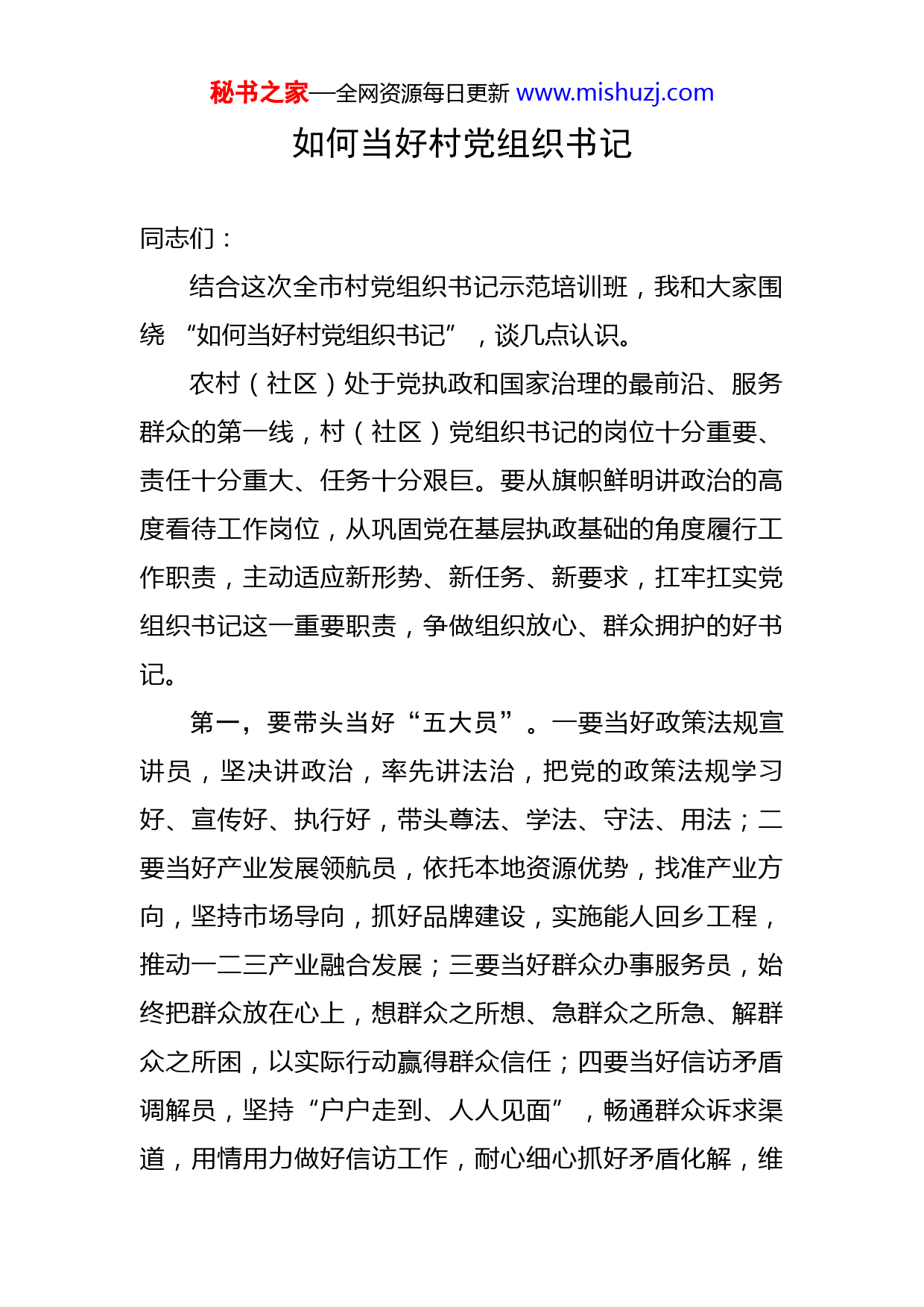 秘书之家—全网资源每日更新www.mishuzj.com如何当好村党组织书记同志们:结合这次全市村党组织书记示范培训班,我和大家围绕“如何当好村党组织书记”,谈几点认识。农村(社区)处于党执政和国家治理的最前沿、服务群众的第一线,村(社区)党组织书记的岗位十分重要、责任十分重大、任务十分艰巨。要从旗帜鲜明讲政治的高度看待工作岗位,从巩固党在基层执政基础的角度履行工作职责,主动适应新形势、新任务、新要求,扛牢扛实党组织书记这一重要职责,争做组织放心、群众拥护的好书记。第一,要带头当好“五大员”。一要当好政策法规宣讲员,坚决讲政治,率先讲法治,把党的政策法规学习好、宣传好、执行好,带头尊法、学法、守法、用法;二要当好产业发展领航员,依托本地资源优势,找准产业方向,坚持市场导向,抓好品牌建设,实施能人回乡工程,推动一二三产业融合发展;三要当好群众办事服务员,始终把群众放在心上,想群众之所想、急群众之所急、解群众之所困,以实际行动赢得群众信任;四要当好信访矛盾调解员,坚持“户户走到、人人见面”,畅通群众诉求渠道,用情用力做好信访工作,耐心细心抓好矛盾化解,维秘书之家—全网资源每日更新www.mishuzj.com护社会大局持续稳定;五要当好平安幸福守护员,抓好疫情防控、安全生产等工作,以工作的确定性应对风险的不确定性,确保实现“六个不发生”目标。第二,要全力办好“五件事”。一要抓好乡村振兴,坚决守牢防止返贫底线,有效解决易迁群众后扶问题,扎实推进乡村发展、乡村建设、乡村治理重点工作,确保农业增产、农民增收、农村安宁;二要抓好产业培育,以农村资源为依托、以农民为主体,全力发展特色产业,因地制宜实施一批能落实、能见效、能持久的项目,努力形成“一村一品”发展格局;三要抓好村集体经济,理清发展思路,找准比较优势,强化造血功能,盘活用好村集体资产,着力办企业、兴产业、谋事业,不断拓宽村集体增收渠道,积极稳妥化解村级债务;四要抓好乡村建设,结合地理、人文、历史脉络,实事求是做好村庄规划,保护好生态环境和自然村落,深入实施擦亮小城镇行动、美丽乡村建设工程,强化设施维护和运营管理,打造美丽宜居乡村;五要抓好乡村治理,推行村级事务公开,加强村级民主建设,建立完善村规民约,发挥党员示范引领作用,大力弘扬文明乡风。第三,要竭力做到“五个好”。一要争当“好书记”,时刻牢记初心使命,坚定理想信念,以一往无前奋斗姿态和风雨无阻的精神状态,全力办好民生实事;二要秘书之家—全网资源每日更新www.mishuzj.com建设“好支部”,强化责任担当,注重团结协作,贯彻民主集中制,坚持互谅、互补、互信、互赢,打造坚强有力的党支部;三要走出“好路子”,想明白发展路径,统筹谋划产业发展、基础设施、公共服务、生态环保等工作,保持定力、久久为功,定了就干、干就干成;四要形成“好机制”,坚持大事商量、任务分工、奖惩兑现,有效组织引导村民参与村级事务,变“推着干”为“比着干”“争着干”;五要锻造“好作风”,慎重对待手中的权力,做到“公道、正派、担当、务实、廉洁”。胡亚波强调,各级党委和组织部门要对村书记高看一眼、厚爱三分,进一步健全选拔任用、教育培训、管理监督、激励保障、储备培养等机制,切实解除基层干部后顾之忧,让村干部心无旁骛干事创业,更好为民谋利、为民办事、为民解忧。