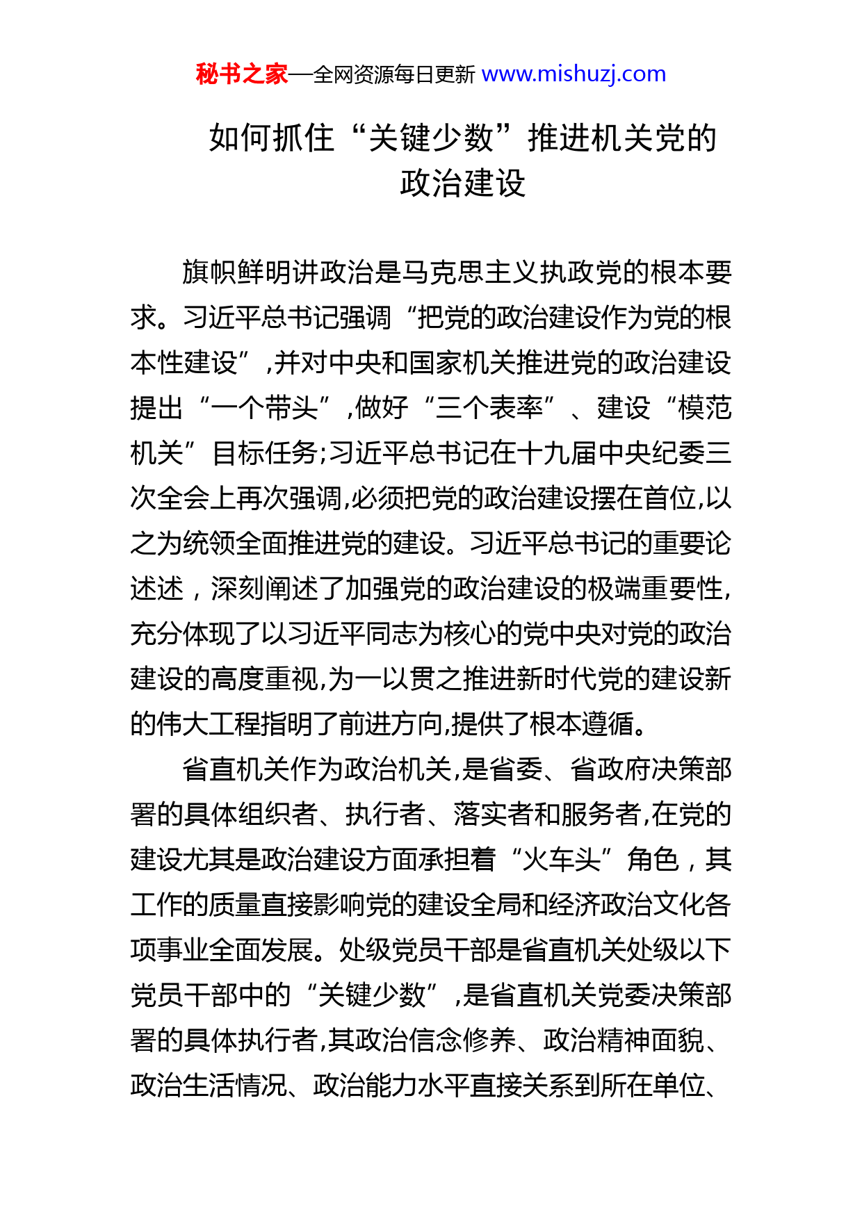 秘书之家—全网资源每日更新www.mishuzj.com如何抓住“关键少数”推进机关党的政治建设旗帜鲜明讲政治是马克思主义执政党的根本要求。习近平总书记强调“把党的政治建设作为党的根本性建设”,并对中央和国家机关推进党的政治建设提出“一个带头”,做好“三个表率”、建设“模范机关”目标任务;习近平总书记在十九届中央纪委三次全会上再次强调,必须把党的政治建设摆在首位,以之为统领全面推进党的建设。习近平总书记的重要论述述,深刻阐述了加强党的政治建设的极端重要性,充分体现了以习近平同志为核心的党中央对党的政治建设的高度重视,为一以贯之推进新时代党的建设新的伟大工程指明了前进方向,提供了根本遵循。省直机关作为政治机关,是省委、省政府决策部署的具体组织者、执行者、落实者和服务者,在党的建设尤其是政治建设方面承担着“火车头”角色,其工作的质量直接影响党的建设全局和经济政治文化各项事业全面发展。处级党员干部是省直机关处级以下党员干部中的“关键少数”,是省直机关党委决策部署的具体执行者,其政治信念修养、政治精神面貌、政治生活情况、政治能力水平直接关系到所在单位、秘书之家—全网资源每日更新www.mishuzj.com部门的党的政治建设,关系到具体业务开展的工作成效,对整个省直机关工作乃至全省工作影响重大。XXX地处改革开放和对敌斗争前沿,毗邻XX,与其他地区和系统相比,在推进党的政治建设、严肃党内政治生活等方面面临更加严峻的挑战。作为观察XXX省直机关政治生态的独特窗口,省直机关纪检监察工委肩负着XXX多家省直单位(含中直驻X单位)处级党员干部违反党纪案件的审理和处级以下干部职务违法案件、科级以下党员干部违反党纪案件的备案审查工作。党的十八大以来,省直机关纪检监察工委始终坚守审理部门作为政治机关中的政治机关这一政治站位和角色定位,把政治纪律和政治规矩作为审理工作的根本和关键,在审理省直机关处级党员干部违纪案件中,坚持从政治上把握问题,将具体个案的审理放在省直单位各行业系统、部门领域的政治生态中、放在XXX全面从严治党的大局中把握,对重点领域和重点对象的违纪问题予以高度关注、进行深入研究和准确认定,通过对省直机关处级干部违纪案件的精准审理,及时发现该行业系统或部门领域政治生态存在的问题,并对净化和修复地区和系统的政治生态、加强省直机关党的政治建设提出针对性、科学性措施和建议,确保审理工作的政治属性得到充分发秘书之家—全网资源每日更新www.mishuzj.com挥。一、近三年审结的省直机关处级党员干部违纪案件主要特点2016年以来,我省省直机关查处的处级党员干部违纪案件持续增长,并呈现出违反政治纪律案件、违反中央八项规定精神案件同步增长等特点。一是违纪人数连续保持高位。2016年,省纪委监委派驻(出)省直机关纪检监察组移送省直机关纪检监察工委审结处级党员干部违纪案件XXX宗XXX人,同比上升XXX%;2017年移送审结处级党员干部违纪案件XXX宗XXX人;2018年,移送审结处级党员干部违纪案件XXX宗XXX人。上述数据说明,在全面从严治党持续推进的新形势下,省直机关全面从严治党主体责任不断压实,惩治腐败持续高压。尤其是随着派驻纪检监察机构改革进一步深人,各派驻纪检监察组的职责由发散向聚焦主业转变,监督执纪问责和监督调查处置职能得到加强,查处违纪违法案件力度不断加大。二是违反政治纪律人数递增。2016年,在审结的XXX宗处级干部违纪案件中,涉及违反政治纪律X人;2017年,涉及违反政治纪律X人;2018年,涉及违反政治纪律X人。这反映出,随着党的十九大报告把秘书之家—全网资源每日更新www.mishuzj.com党的政治建设纳入新时代党的建设总体布局并摆在首位,明确政治建设在新时代党的建设中的战略定位以来,省直机关全面加强党的政治建设,强化政治监督,更加注重用政治的眼光,从政治的角度观察、分析和处理党员干部违纪问题,持续加强对违反政治纪律和政治规矩、落实“两个责任”不力等问题的查处和审理。三是“四风”问题局部反弹。2016年,省直机关纪检监察工委审结处级党员干部案件中,违反中央八项规定精神的案件XX宗,占全年案件X%;2017年XX宗,占全年案件总量XX%,同比上升XXX%;2018年XX宗,占全年案件总量XX%,同比上升XXX%。这表明,尽管党的十八大以来中央八项规定精神得到全面落实,但“四风”问题仍呈现局部反弹,其至时有起伏,少数省直单位处级党员领导干部无视规定、带头顶风违纪,利用公款吃喝、公款旅游、占用公车、违规收受红包礼金的情况依然存在,“四风”问题仍是待治顽疾。四是监督执纪问责效能提升。2016年,在省直机关纪检监察工委审结处级党员干部案件中,免于党纪处分和给予党纪轻处分(党内警告、党内严重警告)的占XX%,党纪重处分(撤销党内职务、留党察看、开秘书之家—全网资源每日更新www.mishuzj.com除党籍)的占XX%,移送司法机关的案件占案件总量XX%;2017年,这三组占比数分别为XX%、XX%和XX%;2018年,分别为XX%、XX%和X%。这些数据表明省直机关全面从严治党有成效,轻处分案件占比日趋增大,移送司法机关案件占比降低,,惩前毖后、治病救人的方针得到有力贯彻,,监督执纪“四种形态”的思想政治水准和政策把握能力有较大提升。总的看