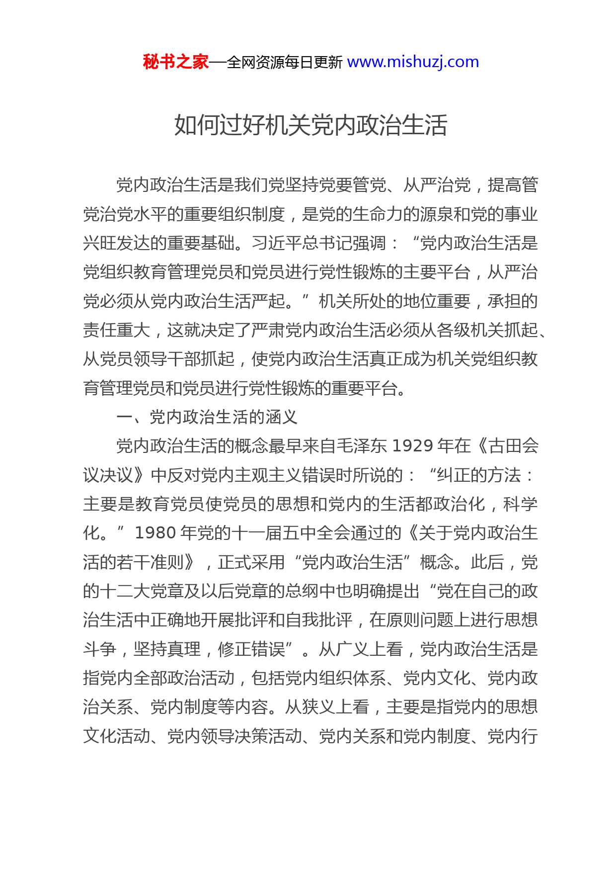 秘书之家—全网资源每日更新www.mishuzj.com如何过好机关党内政治生活党内政治生活是我们党坚持党要管党、从严治党,提高管党治党水平的重要组织制度,是党的生命力的源泉和党的事业兴旺发达的重要基础。习近平总书记强调:“党内政治生活是党组织教育管理党员和党员进行党性锻炼的主要平台,从严治党必须从党内政治生活严起。”机关所处的地位重要,承担的责任重大,这就决定了严肃党内政治生活必须从各级机关抓起、从党员领导干部抓起,使党内政治生活真正成为机关党组织教育管理党员和党员进行党性锻炼的重要平台。一、党内政治生活的涵义党内政治生活的概念最早来自毛泽东1929年在《古田会议决议》中反对党内主观主义错误时所说的:“纠正的方法:主要是教育党员使党员的思想和党内的生活都政治化,科学化。”1980年党的十一届五中全会通过的《关于党内政治生活的若干准则》,正式采用“党内政治生活”概念。此后,党的十二大党章及以后党章的总纲中也明确提出“党在自己的政治生活中正确地开展批评和自我批评,在原则问题上进行思想斗争,坚持真理,修正错误”。从广义上看,党内政治生活是指党内全部政治活动,包括党内组织体系、党内文化、党内政治关系、党内制度等内容。从狭义上看,主要是指党内的思想文化活动、党内领导决策活动、党内关系和党内制度、党内行秘书之家—全网资源每日更新www.mishuzj.com为状态等。党的十八大以来,习近平总书记有诸多的新论述,为正确把握这一问题提供了遵循,大致可以从三个层面来界定“党内政治生活”。一是从政党一般属性来看,作为政治集团的任何政党都有其各自的党内政治生活,这是其调节党内关系、解决党内矛盾和问题的重要途径。习近平总书记在谈到政党自身生活的政治要求时指出:“现代政党都是有政治纪律要求的,没有政治上的规矩不成其为政党。就是西方国家,主要政党在政治方面也是有严格约束的。”由此可见,党内政治生活,是政党自身建设共同规律的要求;自身没有政治生活的集团,不能称其为政党。二是从马克思主义政党的特殊属性来看,就是习近平总书记指出的,严肃党内政治生活是“马克思主义政党有别于其他政党的本质特征”。他在党的十八届六中全会的讲话中又进一步指出,开展严肃认真的党内政治生活,是我们党作为马克思主义政党区别于其他政党的重要标志。就是说,马克思主义政党区别于其他政党的重要标志,不在于有没有政治生活,而在于有没有严肃认真的党内政治生活;马克思主义政党的党内政治生活,就应该是严肃认真的;严肃认真的党内政治生活,是马克思主义政党的题中应有之义。三是从中国共产党自身的具体属性来看,也是习近平总书记在党的十八届六中全会讲话中指出的,严肃认真的党内政治秘书之家—全网资源每日更新www.mishuzj.com生活,是我们党坚持党的性质和宗旨、保持先进性和纯洁性的重要法宝,是解决党内矛盾和问题的“金钥匙”,是党员、干部锤炼党性的“大熔炉”,是纯洁党风政风的“净化器”。这一重要论述,既指出了作为政党的党内政治生活的一般功能作用,又体现了马克思主义政党的党内政治生活的特殊要求,也反映了我们党开展党内政治生活的成功经验,是迄今为止我们党对“党内政治生活”最权威、最全面的界定,意义非常重大。二、严肃党内政治生活的重要意义(一)严肃党内政治生活是增强党的凝聚力和战斗力的重要法宝。党在革命、建设和改革中,摸索形成并不断改进完善的党内政治生活制度,在党的建设中发挥了巨大作用。回顾党的历史,什么时候党内政治生活坚持得好,党的事业就充满生机活力;什么时候党内政治生活遭到异化和破坏,党的事业就会遭受挫折、蒙受损失。(二)严肃党内政治生活是机关党建工作落实全面从严治党责任的必然要求。机关是落实全面从严治党的主要阵地之一。全面从严治党对机关党建工作提出的新要求,决定了各级机关党组织必须始终严肃党内政治生活,以踏石留印、抓铁有痕的决心和行动推动全面从严治党要求落到实处。实践证明,党内政治生活松一寸,党员干部队伍就散一尺。如果党内政治生活质量无法保证,那么落实全面从严治党就无从谈起。(三)严肃党内政治生活是服务“四个全面”战略布局的秘书之家—全网资源每日更新www.mishuzj.com重要保证。机关党员干部的思想理论水平、党性修养、能力素质和工作作风情况,直接影响着改革发展稳定大局,关系到党的事业兴衰成败。积极健康的党内政治生活,能充分保证机关党员干部对党内事务享有平等的知情权、参与权、管理权和监督权,保证党内决策的科学性和民主性,对各项决策达成广泛共识,形成广泛认同,从而激发广大党员干部在服务“四个全面”战略布局、实现中华民族伟大复兴的中国梦进程中充分发挥聪明才智。(四)严肃党内政治生活是加强机关党员队伍建设的重要途径。党内政治生活作为机关党建工作的重要抓手,基本作用之一就是组织机关党员干部认真学习党的理论,不断提高机关党员干部的理论水平。积极健康的党内政治生活对机关党员干部具有教育、改造、管理和监督作用,严肃党内政治生活有助于机关党员干部坚定理想信念,提升思想政治素质,不断增强党组织的凝聚力和向心力,打造政治