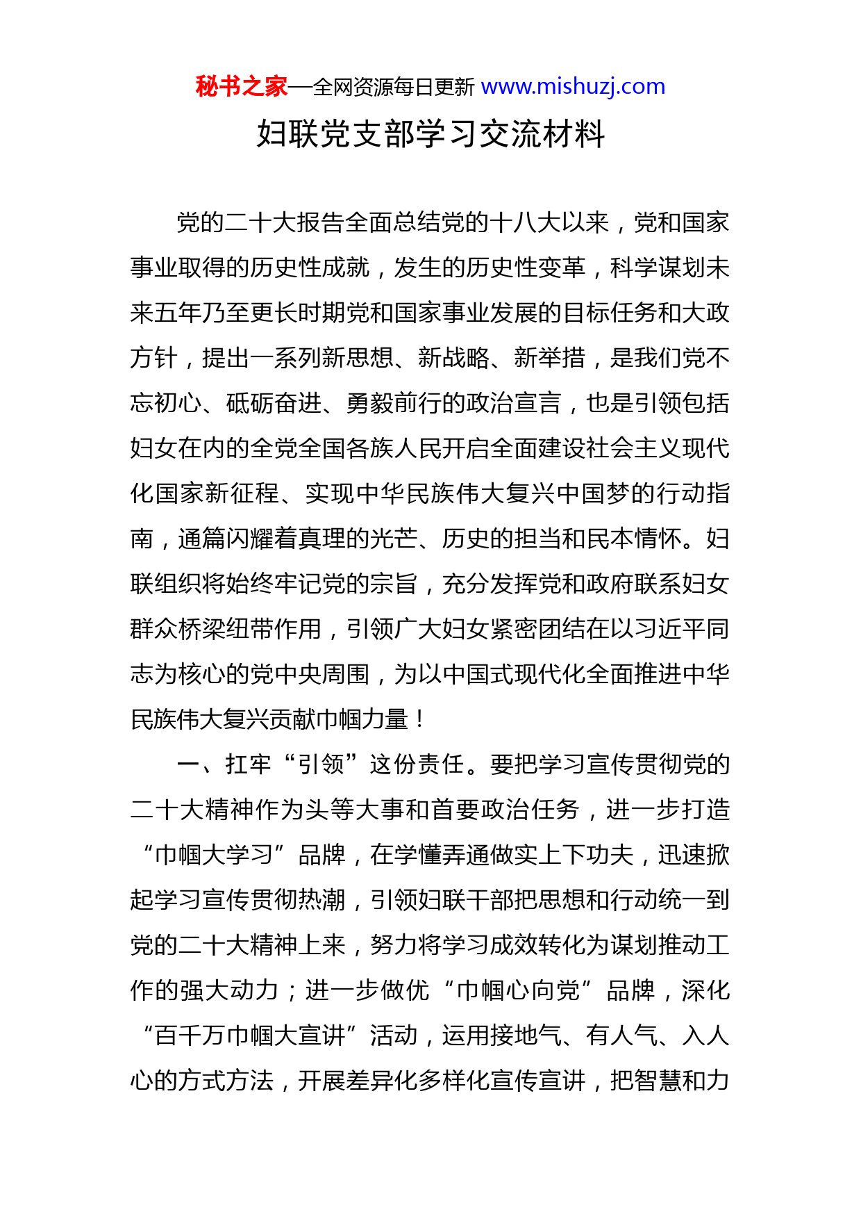 秘书之家—全网资源每日更新www.mishuzj.com妇联党支部学习交流材料党的二十大报告全面总结党的十八大以来,党和国家事业取得的历史性成就,发生的历史性变革,科学谋划未来五年乃至更长时期党和国家事业发展的目标任务和大政方针,提出一系列新思想、新战略、新举措,是我们党不忘初心、砥砺奋进、勇毅前行的政治宣言,也是引领包括妇女在内的全党全国各族人民开启全面建设社会主义现代化国家新征程、实现中华民族伟大复兴中国梦的行动指南,通篇闪耀着真理的光芒、历史的担当和民本情怀。妇联组织将始终牢记党的宗旨,充分发挥党和政府联系妇女群众桥梁纽带作用,引领广大妇女紧密团结在以习近平同志为核心的党中央周围,为以中国式现代化全面推进中华民族伟大复兴贡献巾帼力量!一、扛牢“引领”这份责任。要把学习宣传贯彻党的二十大精神作为头等大事和首要政治任务,进一步打造“巾帼大学习”品牌,在学懂弄通做实上下功夫,迅速掀起学习宣传贯彻热潮,引领妇联干部把思想和行动统一到党的二十大精神上来,努力将学习成效转化为谋划推动工作的强大动力;进一步做优“巾帼心向党”品牌,深化“百千万巾帼大宣讲”活动,运用接地气、有人气、入人心的方式方法,开展差异化多样化宣传宣讲,把智慧和力秘书之家—全网资源每日更新www.mishuzj.com量凝聚到实现党的二十大确定的各项任务上来,引领妇女群众坚定不移听党话跟党走。二、用好“国策”这个重器。“坚持男女平等基本国策,保障妇女儿童合法权益”第三次写入党代会报告,体现了党对妇女事业一以贯之的高度重视。妇联组织要持续深入推动基本国策的落地落实,高标准实施妇女儿童发展规划,推动落实党政主导的维权机制,防止妇女领域“黑天鹅”“灰犀牛”事件发生,促进保障妇女权益在立法、执法、司法、守法全链条、全过程、全方位覆盖,始终坚持人民至上,做好关爱维权服务,用心用情用力解决妇女“急难愁盼”,不断增强妇女儿童的获得感幸福感安全感。三、筑牢“家庭”这块阵地。“加强家庭家教家风建设”首次出现在党代会报告中,从增强实现中华民族伟大复兴的精神力量层面强调了家庭的重要性。妇联组织要发挥在家庭领域的独特优势,深化“家家幸福安康工程”,常态化开展寻找“最美家庭”活动,充分发挥妇女独特作用,坚持立德树人,共同做好引路人守护人筑梦人,持续开展家庭美德建设,充分发挥家庭家教家风在基层社会治理中的重要作用,让科学家教成为共建文明城市、培育公民道德的有效途径,让良好家风成为生生不息、薪火相传的道德力量。秘书之家—全网资源每日更新www.mishuzj.com四、做好“有效”这篇文章。报告明确提出要“深化工会、共青团、妇联等群团组织改革和建设,有效发挥桥梁纽带作用”,为进一步深化妇联改革、做好妇女工作指明了方向。要实现“有效”,渠道要“通”,努力建设四通八达、广泛覆盖、上下交联的组织网络,敏锐感受到妇女呼声;感受要“暖”,通过“我为妇女办实事”等工作将党的“热量”传递到妇女之中,使党和妇女同呼吸、共命运、心连心;能力要“硬”,不断加强实践锻炼、专业训练,全力建设高素质专业化妇联干部队伍,切实当好党开展妇女工作的得力助手、妇女群众的贴心人。五、实施“巾帼”系列行动。报告把“高质量发展”明确作为全面建设社会主义现代化国家的首要任务,进一步凸显了发展质量的全局和长远意义。妇联组织必须完整准确全面贯彻新发展理念,围绕“培育制造名城建设幸福XX”目标发力,进一步深化科技创新巾帼行动、乡村振兴巾帼行动、创业创新巾帼行动、巾帼岗位建功行动,不断支持企业创新创业,帮助妇女稳岗就业,为科技工作者施展才华、发挥作用搭建平台、提供服务,助力农村妇女增收、产业振兴,团结动员全市广大妇女以主人翁姿态积极投身现代化新XX建设,走在时代前列,书写巾帼荣光。