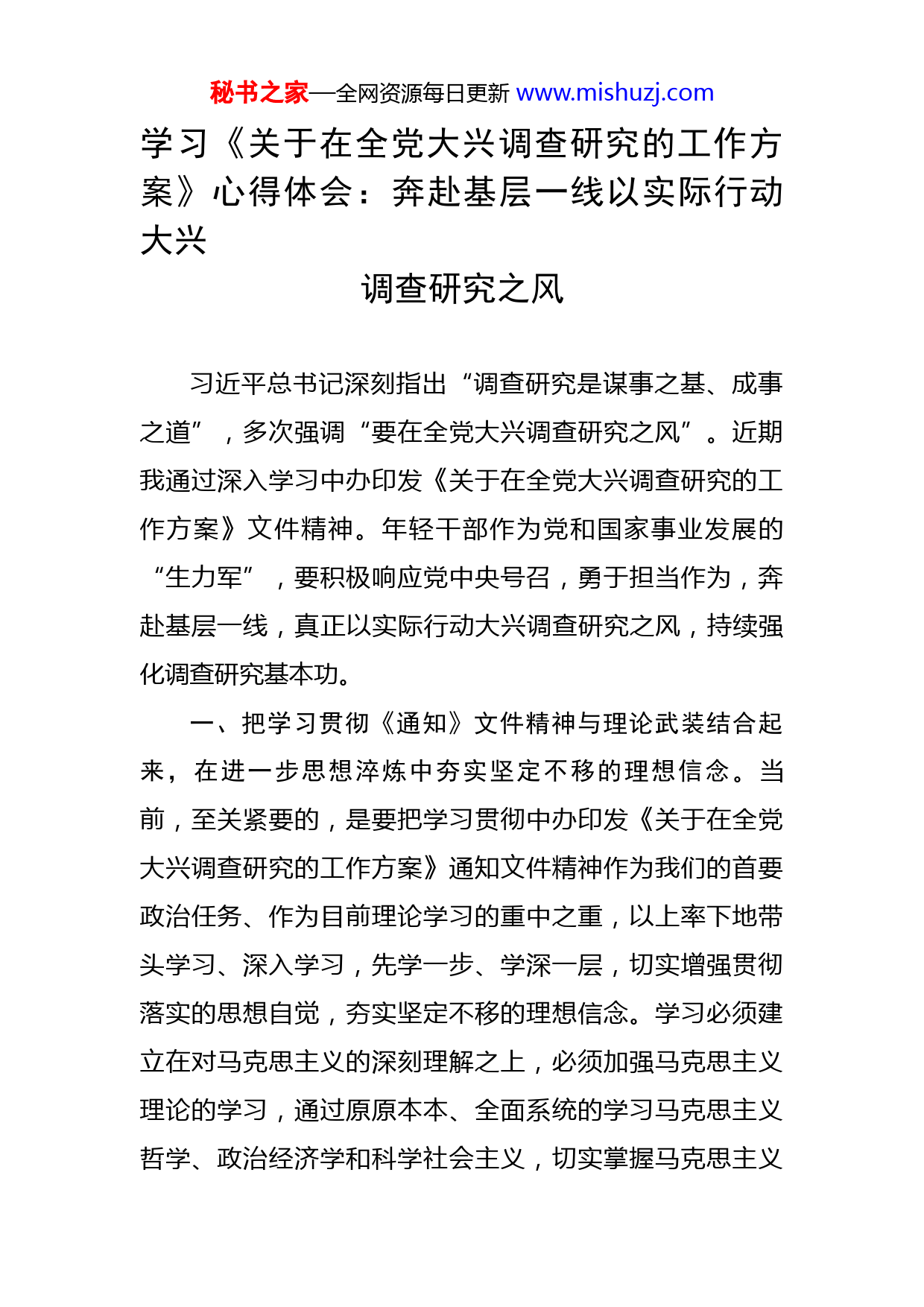 秘书之家—全网资源每日更新www.mishuzj.com学习《关于在全党大兴调查研究的工作方案》心得体会:奔赴基层一线以实际行动大兴调查研究之风习近平总书记深刻指出“调查研究是谋事之基、成事之道”,多次强调“要在全党大兴调查研究之风”。近期我通过深入学习中办印发《关于在全党大兴调查研究的工作方案》文件精神。年轻干部作为党和国家事业发展的“生力军”,要积极响应党中央号召,勇于担当作为,奔赴基层一线,真正以实际行动大兴调查研究之风,持续强化调查研究基本功。一、把学习贯彻《通知》文件精神与理论武装结合起来,在进一步思想淬炼中夯实坚定不移的理想信念。当前,至关紧要的,是要把学习贯彻中办印发《关于在全党大兴调查研究的工作方案》通知文件精神作为我们的首要政治任务、作为目前理论学习的重中之重,以上率下地带头学习、深入学习,先学一步、学深一层,切实增强贯彻落实的思想自觉,夯实坚定不移的理想信念。学习必须建立在对马克思主义的深刻理解之上,必须加强马克思主义理论的学习,通过原原本本、全面系统的学习马克思主义哲学、政治经济学和科学社会主义,切实掌握马克思主义秘书之家—全网资源每日更新www.mishuzj.com立场、观点、方法,始终保持对远大理想和奋斗目标的清醒认知和执着追求。学习必须要把习近平新时代中国特色社会主义思想作为提升理论素养、增长工作本领的思想宝库,作为立根固本、补钙壮骨的第一要求,要秉持学深、学透、学到底的精神和恒心,全面系统学、深入思考学、联系实际学、及时跟进学,在认真学习领会基本内容的基础上,深刻领会理解其时代意义、核心要义、精神实质、丰富内涵、实践要求,推动学习往深里走、往心里走、往实里走,真正学出坚定信念、学出绝对忠诚、学出主动担当,进一步增强“四个意识”,坚定“四个自信”,做到“两个维护”。二、把学习贯彻《通知》文件精神与政治建设结合起来,在进一步政治历练中锤炼忠诚干净的政治品格。作为年轻干部,学习贯彻中办印发《关于在全党大兴调查研究的工作方案》文件精神必须在站在讲政治的高度、在重大政治问题上自觉向党中央对标看齐,坚定坚决、始终不渝的做党的政治建设的引领者、实践者、推动者。坚持党的领导,是我们做好一切工作的首要历史经验。带头把坚决维护党中央权威和集中统一领导作为长期的、根本的政治任务和最高政治原则,严格遵守党章党规,带头树牢“四个意识”,坚定“四个自信”,带头锤炼对党绝对忠诚的政治品格,坚决把思想和行动统一到党中央的决策部署上秘书之家—全网资源每日更新www.mishuzj.com来,做到党中央提倡的坚决响应、党中央决定的坚决执行、党中央禁止的坚决不做,在政治原则、政治立场、政治观点上同党中央保持高度一致,以实际行动保证党的基本理论、基本路线、基本方略的贯彻落实。坚决把维护核心作为最大的政治,坚持用习近平新时代中国特色社会主义思想武装头脑、指导实践、推动工作,在任何时候任何情况下都忠于核心、拥戴核心、维护核心、捍卫核心,坚定不移地在以习近平同志为核心的党中央指引下奋勇前进。必须切实强化制度意识,自觉尊崇制度、严格执行制度、坚决维护制度,在制度执行上走在前、作表率。要更加自觉地带头执行党的政治纪律、组织纪律、廉洁纪律、群众纪律、工作纪律和生活纪律等制度规定,更加自觉地带头带头执行学习制度、工作制度、民主集中制、党内生活准则、“三重一大”集体决策、重大事项请示报告、批评和自我批评、“三会一课”、民主生活会、组织生活会、谈心谈话等制度,以严格的制度落实,锤炼忠诚干净的政治品格,推动全面从严治党向纵深发展,推动各项工作沿着正确的政治方向贯彻落实。三、把学习贯彻《通知》文件精神与当前工作结合起来,在进一步实践锻炼中强化贯彻落实的使命担当。学习贯彻中办印发《关于在全党大兴调查研究的工作方案》文件精神,我们必须深入学习贯彻习近平总书记关于调查研秘书之家—全网资源每日更新www.mishuzj.com究的重要论述精神,清醒认识到正确的决策离不开调查研究,正确的贯彻落实同样也离不开调查研究;调查研究是获得真知灼见的源头活水,是做好工作的基本功。作为年轻干部要坚持以党性立身做事,把说老实话、办老实事、做老实人作为调查研究的重要内容,要善于独立思考,坚持求真务实,要在全党大兴调查研究之风。在工作实际中,只有练就出过硬的政治能力,才能在思想上、政治上、行动上同党中央保持高度一致,才能更好地坚持问政于民、问需于民、问计于民,加强调查研究,畅通民意渠道,把人民的智慧集中起来、运用起来,更好地为党分忧、为国尽责、为民服务,以实际行动践行初心使命。