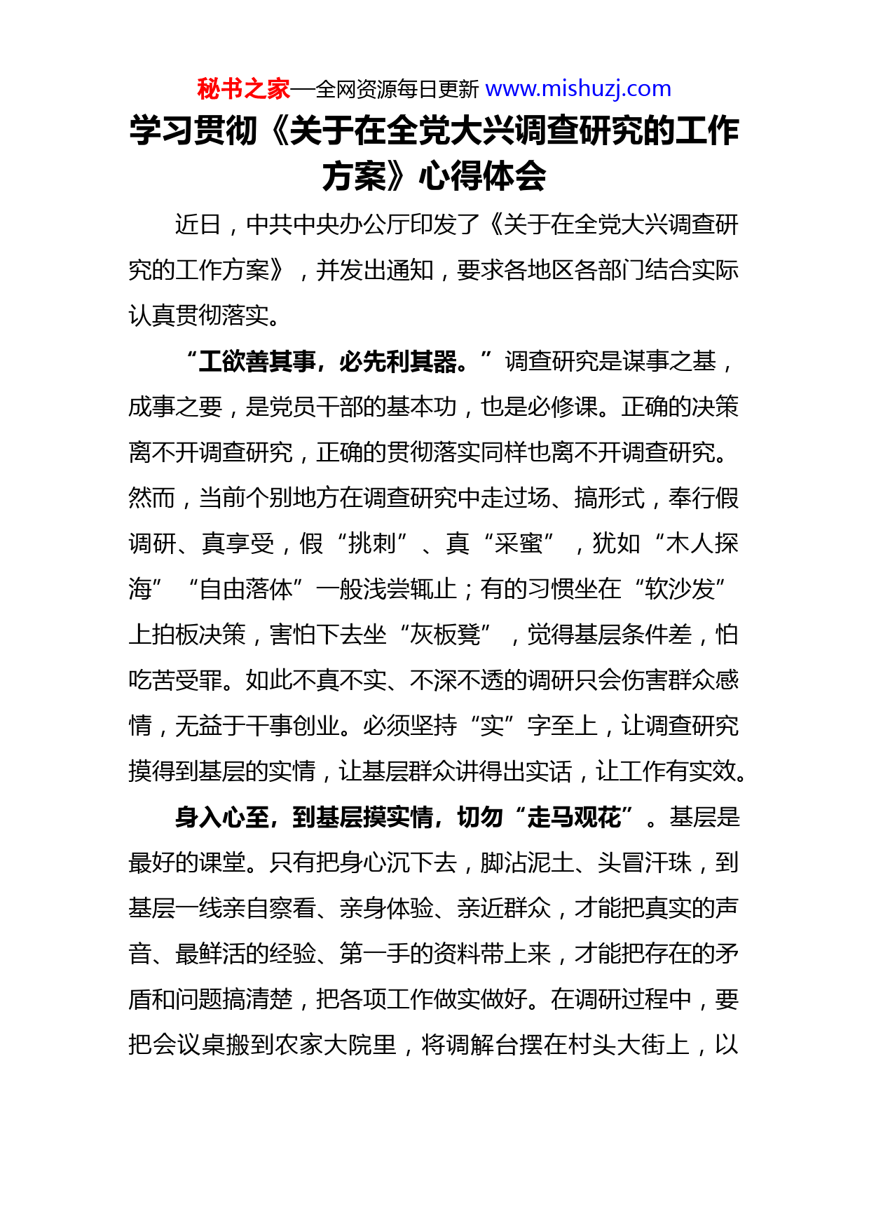 秘书之家—全网资源每日更新www.mishuzj.com学习贯彻《关于在全党大兴调查研究的工作方案》心得体会近日,中共中央办公厅印发了《关于在全党大兴调查研究的工作方案》,并发出通知,要求各地区各部门结合实际认真贯彻落实。“工欲善其事,必先利其器。”调查研究是谋事之基,成事之要,是党员干部的基本功,也是必修课。正确的决策离不开调查研究,正确的贯彻落实同样也离不开调查研究。然而,当前个别地方在调查研究中走过场、搞形式,奉行假调研、真享受,假“挑刺”、真“采蜜”,犹如“木人探海”“自由落体”一般浅尝辄止;有的习惯坐在“软沙发”上拍板决策,害怕下去坐“灰板凳”,觉得基层条件差,怕吃苦受罪。如此不真不实、不深不透的调研只会伤害群众感情,无益于干事创业。必须坚持“实”字至上,让调查研究摸得到基层的实情,让基层群众讲得出实话,让工作有实效。身入心至,到基层摸实情,切勿“走马观花”。基层是最好的课堂。只有把身心沉下去,脚沾泥土、头冒汗珠,到基层一线亲自察看、亲身体验、亲近群众,才能把真实的声音、最鲜活的经验、第一手的资料带上来,才能把存在的矛盾和问题搞清楚,把各项工作做实做好。在调研过程中,要把会议桌搬到农家大院里,将调解台摆在村头大街上,以秘书之家—全网资源每日更新www.mishuzj.com“接地气”确保调研“有生气"。既要运用“田野”工作法,不设专场,直插现场,也要善用网络调查、大数据调查等新的手段;既要走大路、走远路,也要抄小道、到偏隅;既要看先进示范区的好做法好经验,也要看问题突出、矛盾集中、基层反映强烈的堵点难点,力求把更多的调研成果转化为党委政府决策的依据。问需问计,让群众讲实话,切勿“高高在上”。调查研究是了解民情民意、集聚民智民力的重要途径,最终目的也是为了把“问题”变“课题”,把“难点”变“亮点”,不断满足人民群众对美好生活的向往。因此,调研得深不深、真不真、透不透,直接关系老百姓的获得感和满意度。必须卸掉架子、放低身段、放下面子,带着感情和温度深入群众中间,把话筒交给群众,让群众登上讲台,多听少说、先听后说、想好再说,多讲群众听得懂的话、爱听的话,在互动中触动,在说事中说理。高手在民间,要多向群众学习,拜人民为师,坚持问政于民、问计于民、问需于民,从中汲取干事创业的土方法、金点子、好方子,真正让真话实话变成实践实效。求解善答,使工作出实效,切勿“虎头蛇尾”。七分调查,三分研究。当前,有的地方满足于“一调了之”“调而不研”“研而不久”,对调研中基层反映的问题能推则推,秘书之家—全网资源每日更新www.mishuzj.com对走上门来的群众能躲就躲,对历史遗留的“老大难”能拖就拖,生怕给自己带来麻烦。如此一来,基层群众自然会对党的政策半信半疑,对党的干部呼声很大,对地方政治生态感到失望。“编筐编篓,贵在收口。’'要树立解题思维、“扫尾"意识,抽丝剥茧、解剖麻雀,抓住事物的本质和主要矛盾,有针对性地探索解决办法,特别是对影响和制约基层工作的关节点,对群众眼前的“急难愁盼”且容易反弹的问题,要有“时时放心不下”的责任心和“咬定青山不放松”的韧劲,盯一件抓一件,干一件成一件,以“钉钉子”的尺寸之功和“拔钉子”的实际成效取信于民,推动事业发展。