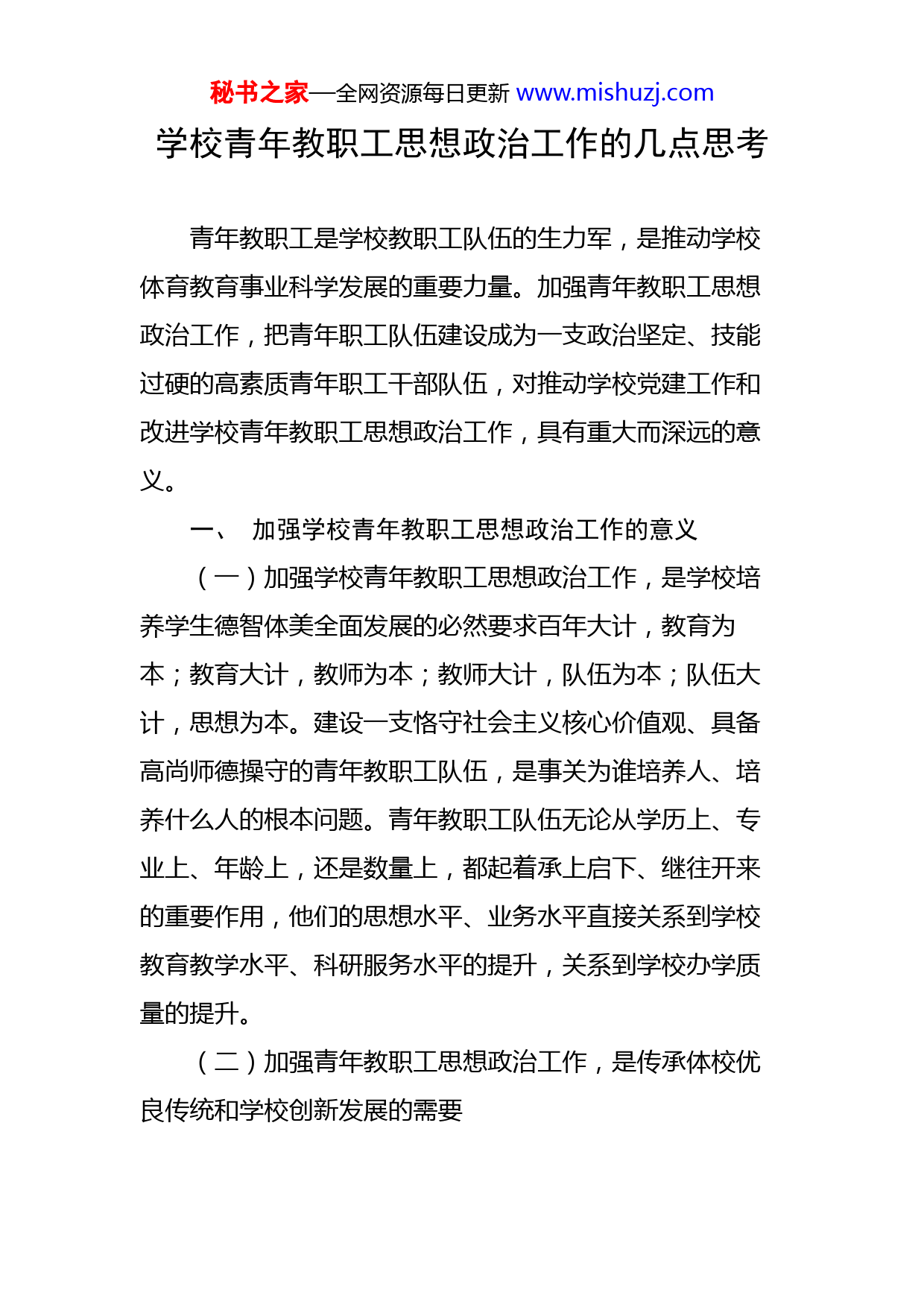 秘书之家—全网资源每日更新www.mishuzj.com学校青年教职工思想政治工作的几点思考青年教职工是学校教职工队伍的生力军,是推动学校体育教育事业科学发展的重要力量。加强青年教职工思想政治工作,把青年职工队伍建设成为一支政治坚定、技能过硬的高素质青年职工干部队伍,对推动学校党建工作和改进学校青年教职工思想政治工作,具有重大而深远的意义。一、加强学校青年教职工思想政治工作的意义(一)加强学校青年教职工思想政治工作,是学校培养学生德智体美全面发展的必然要求百年大计,教育为本;教育大计,教师为本;教师大计,队伍为本;队伍大计,思想为本。建设一支恪守社会主义核心价值观、具备高尚师德操守的青年教职工队伍,是事关为谁培养人、培养什么人的根本问题。青年教职工队伍无论从学历上、专业上、年龄上,还是数量上,都起着承上启下、继往开来的重要作用,他们的思想水平、业务水平直接关系到学校教育教学水平、科研服务水平的提升,关系到学校办学质量的提升。(二)加强青年教职工思想政治工作,是传承体校优良传统和学校创新发展的需要秘书之家—全网资源每日更新www.mishuzj.com贺龙体校,积淀深厚,一大批体校人用心血、汗水和智慧铸就了辉煌的业绩,为国家、社会输送了一批又一批高素质体育人才。站在新的起点上思考未来,体育职业教育改革不断深化,体育职业教育竞争异常激烈,可以预见,未来几年,青年教职工将成为学校跨越发展的核心竞争优势。因此,提高青年教职工的综合素质特别是思想政治素质,坚持“引育并举”,“选才”更“育才”,这是学校得以可持续发展的有力保证。(三)加强青年教职工思想政治工作,是由我校教职工队伍建设状况所决定的目前,学校40岁以下青年教职工接近全校教职工总数的60%。他们的思想活跃、思维敏捷,观念新颖、接受新生事物快,主体意识、参与意识强,对实现体育、教育事业发展有着强烈渴望。主流积极向上,拥护党的领导,对新中国特色社会主义事业充满信心,热爱教书育人事业,能够自觉遵守教师职业道德规范,具有较强事业心和责任感。但面对复杂的问题,青年干部职工能否明辨是非、不人云亦云、盲目跟风;面对外部诱惑,能否保持定力、严守规矩;面对困难和挑战,能否勇挑重担、勇克难关,这些都对青年同志提出了新的更高要求。这些都要求我们进一步加强和做好青年教职工思想政治工作,以强烈的事业秘书之家—全网资源每日更新www.mishuzj.com心、责任感,开动脑筋,研究新情况,找到规律,拿出办法,采取有效措施,使青年思想政治工作上台阶。二、学校青年教职工思想政治工作主要存在的问题(一)政治素质不高有的青年教职工具有高学历,文化水平较高,接受新事物能力较强,从而自我优越感强烈,自我意识也较强,关心个人得失较多,缺乏全局观、大局观。有的青年职工书本知识学习不够,文化水平不高,加之不注重政治理论学习,政治意识不强,个人素质有待提高。(二)责任担当不够有的青年教职工价值主体由社会本位转向个人本位,片面追求个人利益,工作中讲价钱、讲条件,见利则做,不利不做。有的青年职工面对复杂问题和困难时,往往会有畏难情绪、退缩心理,认为多一事不如少一事,往往参照老经验、老办法、老惯例,缺乏开拓创新、迎难而上的勇气。(三)进取意识不强有的青年教职工进取意识不强,认为干好干坏一个样,对学校日益规范的管理不适应,工作中不愿思考如何将份内工作做得细致和完美,而是简单应付,缺乏工作积极主动性。有的青年教职工怕管事、怕得罪人,服务怕麻秘书之家—全网资源每日更新www.mishuzj.com烦,得过且过,缺乏敬业精神,有做一天和尚撞一天钟的思想。三、学校加强青年教职工思想政治工作的有效途径(一)选择科学的教育方法根据青年教职工的思想特点,创新工作方法,使之更加贴近青年教职工实际。坚持以人为本,依托工会、团青组织的桥梁作用,积极了解关心青年教职工的工作、学习和生活,尽力为青年教职工排忧解难,让他们能够安心地做好本职工作,把更多的时间、精力投入到教书育人中。还可尝试推行老同志与青年同志“结对子”、“传帮带”等教育方法,加强对青年职工业务上的指导,提高青年职工的自我调适能力,提升他们的组织归属感。(二)采取有效的激励手段充分运用学校教学训练常规管理、班主任管理,绩效工资发放办法、职称晋升、岗位聘用等规章制度,发挥考核的作用,用一定的标准对青年教职工的思想表现、行为活动、能力水平以及工作业绩等进行检查、衡量和审核,给予正确的评价,奖勤罚懒,奖优罚劣。运用评优评先制度,结合五四青年节、教师节表彰活动,评选优秀青年教师、青年党员、青年班主任等,发挥青年党员、骨干的引领带动作用,营造全校健康向上、积极进取的干事氛围。(三)提供利于成长的平台秘书之家—全网资源每日更新www.mishuzj.com建立青年教职工培训制度,选派青年职工参加国家、省、市等各级培训,积极为青年职工创造良好学习条件,提高青年教职工工作能力。要结合新时期青年职工成长进步的迫切需求,开展研讨、岗位竞赛、读书等活动,提升青年职工业务水平。(四)开展新颖的教育活动结合学校实际,创新工作载体,组织青年教职工开展丰富的主题教育活动。一方面要提升青年教职工