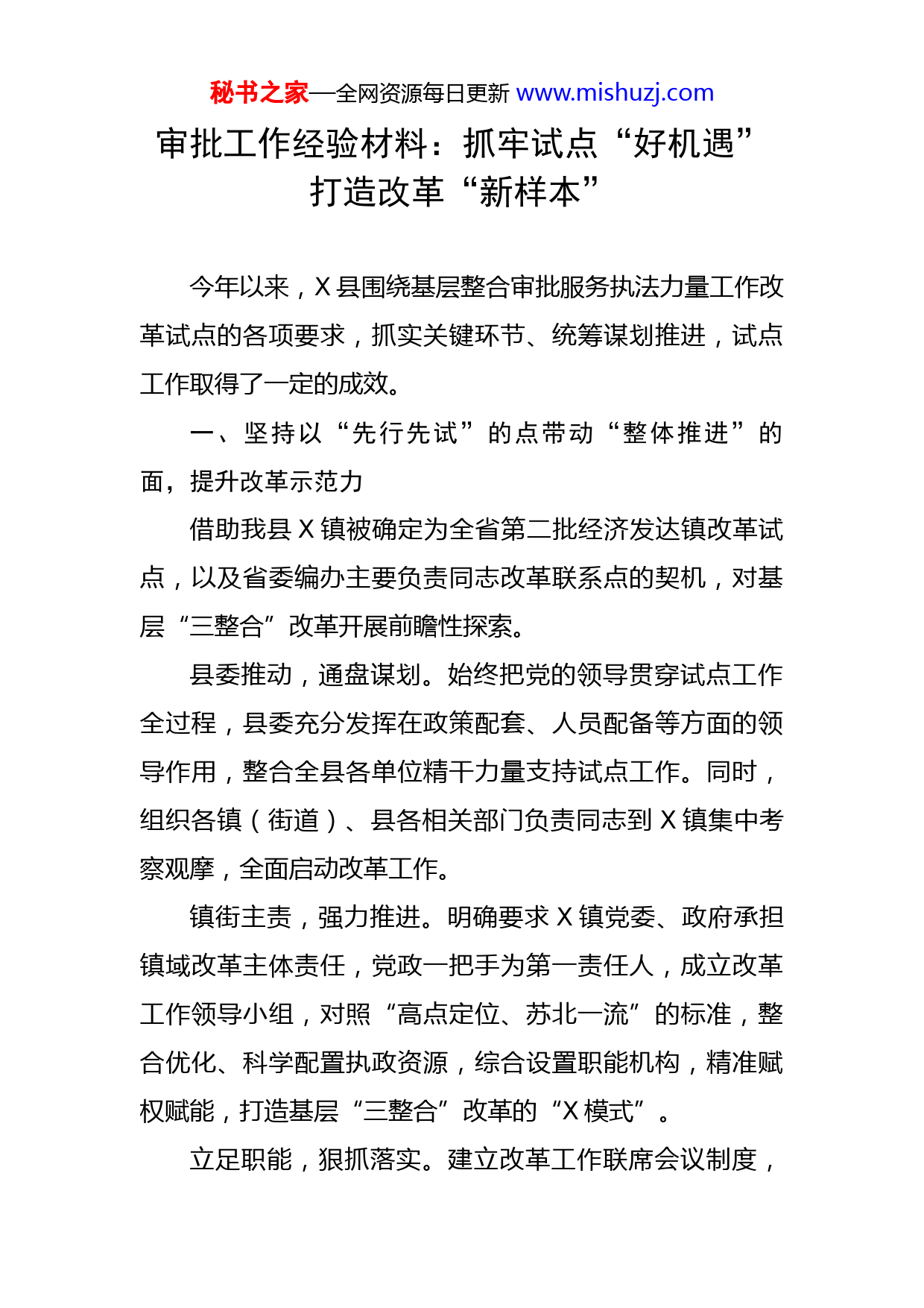秘书之家—全网资源每日更新www.mishuzj.com审批工作经验材料:抓牢试点“好机遇”打造改革“新样本”今年以来,X县围绕基层整合审批服务执法力量工作改革试点的各项要求,抓实关键环节、统筹谋划推进,试点工作取得了一定的成效。一、坚持以“先行先试”的点带动“整体推进”的面,提升改革示范力借助我县X镇被确定为全省第二批经济发达镇改革试点,以及省委编办主要负责同志改革联系点的契机,对基层“三整合”改革开展前瞻性探索。县委推动,通盘谋划。始终把党的领导贯穿试点工作全过程,县委充分发挥在政策配套、人员配备等方面的领导作用,整合全县各单位精干力量支持试点工作。同时,组织各镇(街道)、县各相关部门负责同志到X镇集中考察观摩,全面启动改革工作。镇街主责,强力推进。明确要求X镇党委、政府承担镇域改革主体责任,党政一把手为第一责任人,成立改革工作领导小组,对照“高点定位、苏北一流”的标准,整合优化、科学配置执政资源,综合设置职能机构,精准赋权赋能,打造基层“三整合”改革的“X模式”。立足职能,狠抓落实。建立改革工作联席会议制度,秘书之家—全网资源每日更新www.mishuzj.com及时解决改革进程中遇到的问题和困难,为改革工作提供技术力量、人员培训、端口对接等方面的支持,确保各项改革措施精准落地。二、坚持以“顺时顺需”的轴驱动“基层治理”的轮,提升改革精准度顺应基层治理现代化的趋势,紧扣群众和企业需求,将审批服务综合执法一体化平台建设作为改革的重要抓手和突破口,推动管理更加精准、服务更加精细。摸清底数抓融合。对全县镇(街道)现有的政务信息平台运行情况进行调查核实,在摸清建设现状的基础上,经过多次沟通对接、反复调研论证,形成了一体化平台建设规划设计方案,全面融合各类政务平台职能。严格程序抓建设。采取公开招投标形式确定平台建设企业,由涉改的XX个镇(街道)联合公开发布竞争性磋商采购公告,将一体化平台运维服务作为一个整体招标项目,通过综合评分的方法择优确定XX家平台建设企业。健全机制抓推进。初拟镇(街道)审批服务综合执法一体化平台建设工作实施方案,明确工作安排及职责分工,完成了便民服务、综合行政执法、指挥调度中心机构的选址、改造等前期筹备工作,并全面摸排基层党建、人员信息等各类数据,为一体化平台的后续部署实施打牢坚实基础。秘书之家—全网资源每日更新www.mishuzj.com三、坚持以“赋权赋能”的力打破“束缚发展”的框,提升改革实效性按照“成熟一批、赋予一批,适时监管、动态调整”的思路,进一步重构基层权责体系,确保权力事项“放得下、接得住、管得好”。广泛征求赋权意见。先后XX次召开基层“三整合”改革赋权事项座谈研讨会,邀请镇(街道)、县各相关部门负责人以及群众、企业代表,对拟赋权事项逐条会商讨论,从合法性、专业性、实用性等角度审慎制订赋权目录。厘清属地管理事项。借鉴X经济发达镇改革赋权经验,将方便基层群众办事且镇(街道)能够承接到位的XX多个事项纳入首批赋权清单。同时,结合不同镇(街道)的自身情况,分类摸排实际需求,列出相应的个性化目录清单。明晰权力责任关系。全面梳理基层与县级职能部门职责边界,细化镇(街道)、部门间职责任务分工,及时调整更新权责清单。对社会关注度高、矛盾高发频发的生态环境、安全生产等重点领域,建立联动机制、备忘协议等制度,确保权责统一、权责对等。
