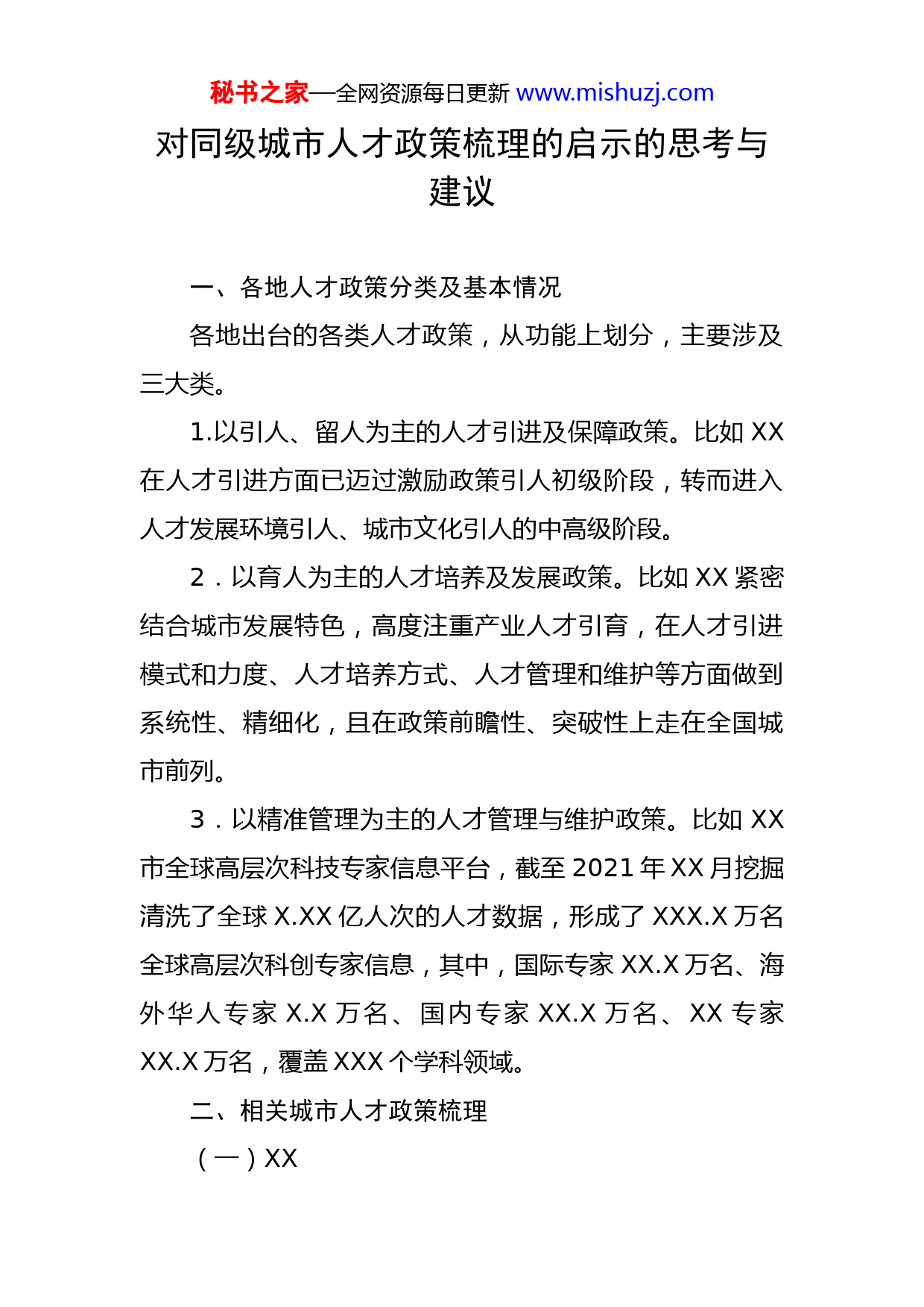 秘书之家—全网资源每日更新www.mishuzj.com对同级城市人才政策梳理的启示的思考与建议一、各地人才政策分类及基本情况各地出台的各类人才政策,从功能上划分,主要涉及三大类。1.以引人、留人为主的人才引进及保障政策。比如XX在人才引进方面已迈过激励政策引人初级阶段,转而进入人才发展环境引人、城市文化引人的中高级阶段。2.以育人为主的人才培养及发展政策。比如XX紧密结合城市发展特色,高度注重产业人才引育,在人才引进模式和力度、人才培养方式、人才管理和维护等方面做到系统性、精细化,且在政策前瞻性、突破性上走在全国城市前列。3.以精准管理为主的人才管理与维护政策。比如XX市全球高层次科技专家信息平台,截至2021年XX月挖掘清洗了全球X.XX亿人次的人才数据,形成了XXX.X万名全球高层次科创专家信息,其中,国际专家XX.X万名、海外华人专家X.X万名、国内专家XX.X万名、XX专家XX.X万名,覆盖XXX个学科领域。二、相关城市人才政策梳理(一)XX秘书之家—全网资源每日更新www.mishuzj.com实施企业经营管理人才素质提升工程、教育名师造就工程、XX集聚工程、医卫人才梯队工程、技能精英培育工程。市政府实施杰出人才培养专项,根据国家战略和XX重点领域、重点产业发展需要,每两年遴选不超过XX名具有成长为本市A类人才潜力的培养对象进行重点培养。在科研、教育、卫生健康、文化体育等非竞争性领域实施“特聘岗位”制度。突出用人主体作用和市场激励导向,推动从“政策引才”向“环境、文化聚才”转变。(1)人才认定等工作不再由人社局承担,改由用人单位承担。(2)创新人才认定办法,组建XX青年英才举荐委员会,通过伯乐相才荐才的方式,发现、选拔和培养一批在XX市战略性新兴产业和未来产业领域中崭露头角、具备创新创业优势、发展潜力大的优秀青年人才。(二)XX全国首创“金种子”储备工程:每年从“双一流”建设高校中,遴选一批有意来青创新创业的优秀在校生,用人主体与其签订“信用合同”,给予学费补助,并给予国内在校研究生所获奖学金额度XX%的生活补贴,对国外留学在校研究生给予X万元/人/年补助;意向用人主体负责“金种子”学生的实习和期间生活补贴;用人主体对意向人才的补助财政给予一定比例补贴。秘书之家—全网资源每日更新www.mishuzj.com“安居乐业保障工程”和“创新实施举家引进配套工程”,为人才打造全方位的“定制服务”。(1)人才绿卡再扩容,建立人才绿卡分类制度,扩大持卡人才范围,精准服务。绿色通道再升级,持卡人享受相应的医疗保健和就医绿色通道服务。(2)在降低落户门槛方面,对经市级认定全职引进的省部级领军人才及正高职称人才可直接登记落户,本科以上高校毕业生凭毕业证落户。(3)加大人才公寓建设力度,产权型人才公寓出售价格按照同区域商品住房价格下浮20%的比例确定。取得服务绿卡的人才在青购买首套住房,申请公积金贷款可缩短最低缴存时间。三、XX人才政策的短板及问题(一)人才吸引方面,对本土化、全职高端人才的政策支持力度不够大由于XX科教资源相对薄弱,本地人才尤其是高端人才供给不足,自主培养的院士尚未实现零的突破,企业科研人才也多数是从外地招聘,近年来由于房价等客观因素出现部分人才离甬的现象,人才稳定性较差。此外,全职人员引进薪酬待遇与周边城市相比差距较大,吸引力不足。例如绍兴给予引进博士XX万房补和XX万生活补助(X年XX万),而XX给予的房补仅XX万,安家费补贴受众面秘书之家—全网资源每日更新www.mishuzj.com相对较窄(仅面向市本级单位、毕业XX个月内的应届毕业生)。(二)人才培育方面,对产业人才的培育重视程度不够高相关政策较少以XX为例,近两年先后印发《关于促进产才融合发展的若干措施》《关于实施“XX菁英工程”的意见》等政策,整合产业人才政策,设置产业引才专班,充分体现对产业人才的重视。XX市作为制造业大市,实现产业转型升级亟需构建“XXX产业”人才队伍,但目前尚未出台具体的重点产业人才紧缺目录,政策支持针对性不高,尤其缺乏针对产业高端技术型人才的精准性政策支持。(三)人才管理方面,政策开放度不够、数字化精准管理能力不足据调查,目前XX引进研究团队中部分柔性引进人才、外地引进人才由于参保地、五险一金缴纳地不在XX等硬性问题而无法牵头申请本地项目,在一定程度上打击了这些柔性引进、外地引进人才在XX开展科研工作的积极性,阻碍项目实施和科研成效落地。此外,我市数字化精准管理和开发人才资源能力不足。(四)人才保障方面,配套服务和设施仍需强化完善目前,XX的XX公寓、XX等人才公寓都已经满员,但秘书之家—全网资源每日更新www.mishuzj.com仍有较多人才暂无房可租,人才公寓保有量与符合条件人才数量不匹配,出现人才“一房难求”的现象。此外,政策制定缺乏对市边缘区域高校院所人才的差异化配置,比如,XX大学XX创新研究院、XX大学XX校区等位处相对边缘的XX地区,周边配套设施简陋,导致院校研究人员流失。四、对XX进一步支持人才发展的对策建议(一)进一步完善人才政策体系,加大宣传一是健全提升政策体系,力求全面精准。参考XX、XX等地的人才政策,建议统筹市委组织部(市委人才办)、市经信局、市科技局、市人社局,多部门协同建立健全人才管理及维护政策、