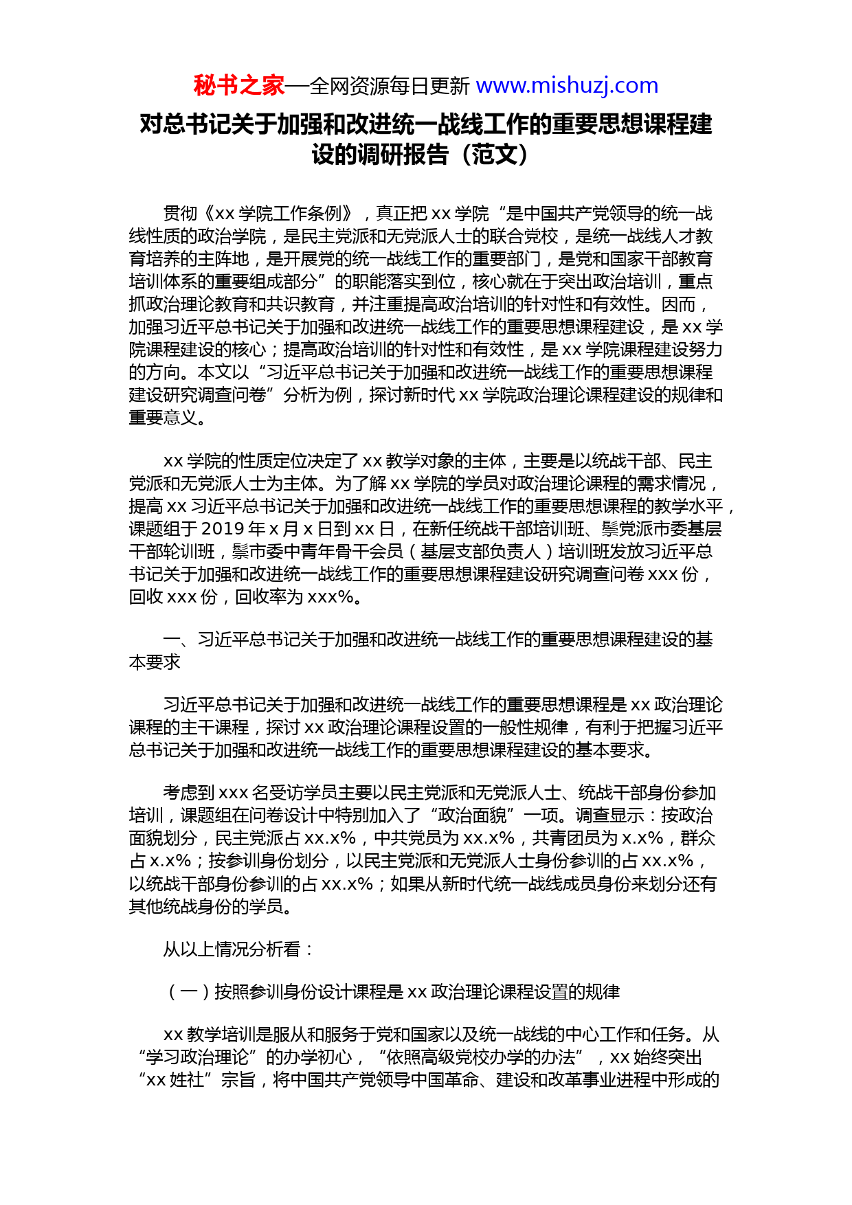 秘书之家—全网资源每日更新www.mishuzj.com对总书记关于加强和改进统一战线工作的重要思想课程建设的调研报告(范文)贯彻《xx学院工作条例》,真正把xx学院“是中国共产党领导的统一战线性质的政治学院,是民主党派和无党派人士的联合党校,是统一战线人才教育培养的主阵地,是开展党的统一战线工作的重要部门,是党和国家干部教育培训体系的重要组成部分”的职能落实到位,核心就在于突出政治培训,重点抓政治理论教育和共识教育,并注重提高政治培训的针对性和有效性。因而,加强习近平总书记关于加强和改进统一战线工作的重要思想课程建设,是xx学院课程建设的核心;提高政治培训的针对性和有效性,是xx学院课程建设努力的方向。本文以“习近平总书记关于加强和改进统一战线工作的重要思想课程建设研究调查问卷”分析为例,探讨新时代xx学院政治理论课程建设的规律和重要意义。xx学院的性质定位决定了xx教学对象的主体,主要是以统战干部、民主党派和无党派人士为主体。为了解xx学院的学员对政治理论课程的需求情况,提高xx习近平总书记关于加强和改进统一战线工作的重要思想课程的教学水平,课题组于2019年x月x日到xx日,在新任统战干部培训班、鬃党派市委基层干部轮训班,鬃市委中青年骨干会员(基层支部负责人)培训班发放习近平总书记关于加强和改进统一战线工作的重要思想课程建设研究调查问卷xxx份,回收xxx份,回收率为xxx%。一、习近平总书记关于加强和改进统一战线工作的重要思想课程建设的基本要求习近平总书记关于加强和改进统一战线工作的重要思想课程是xx政治理论课程的主干课程,探讨xx政治理论课程设置的一般性规律,有利于把握习近平总书记关于加强和改进统一战线工作的重要思想课程建设的基本要求。考虑到xxx名受访学员主要以民主党派和无党派人士、统战干部身份参加培训,课题组在问卷设计中特别加入了“政治面貌”一项。调查显示:按政治面貌划分,民主党派占xx.x%,中共党员为xx.x%,共青团员为x.x%,群众占x.x%;按参训身份划分,以民主党派和无党派人士身份参训的占xx.x%,以统战干部身份参训的占xx.x%;如果从新时代统一战线成员身份来划分还有其他统战身份的学员。从以上情况分析看:(一)按照参训身份设计课程是xx政治理论课程设置的规律xx教学培训是服从和服务于党和国家以及统一战线的中心工作和任务。从“学习政治理论”的办学初心,“依照高级党校办学的办法”,xx始终突出“xx姓社”宗旨,将中国共产党领导中国革命、建设和改革事业进程中形成的秘书之家—全网资源每日更新www.mishuzj.com马克思主义中国化的统一战线理论作为学院一切工作的根本指导,将贯彻落实党中央关于统一战线工作的决策部署作为学院一切工作的根本要求,将铸牢团结奋斗的共同思想政治基础作为学院一切工作的根本目标,为统一战线人才培养,服务统战中心工作,助力打赢人心争夺战服务。新时代,在习近平总书记关于加强和改进统一战线工作的重要思想指导下,xx的政治理论课程围绕服务巩固和发展最广泛爱国统一战线开展教学培训和研究。在长期实践中,xx形成了以政治目标规划设定参训对象的传统,并积累了一定的办学和课程设置的经验。比如,对民主党派和无党派人士而言,按照参训身份设计政治理论课程,有利于讲清楚中国共产党领导的多党合作和政治协商制度作为我国新型政党制度的历史文化逻辑和制度实践逻辑。(二)巩固共同的思想政治基础是xx政治理论课程设置的核心民主党派和无党派人士、统战干部是xx学院的学员主体。促进民主党派和无党派人士对坚持中国共产党的领导、坚持中国特色社会主义的政治认同,支持民主党派按照中国特色社会主义参政党建设要求更好履职,巩固中国共产党同民主党派团结合作的共同思想政治基础,是民主党派和无党派人士、统战干部班政治理论课程设置的教学目标。在具体实践中,对于各级党委、政府统战干部,就是要以习近平新时代中国特色社会主义思想为指导,按照更好坚持“十六字”方针,支持民主党派按照中国特色社会主义参政党建设要求更好履职,设计好各级党委、政府部门统战干部班的课程,提高各级党委、政府部门统战干部支持民主党派按照中国特色社会主义参政党建设要求更好履职的政治意识和能力水平;对于民主党派和无党派人士班,要按照中国特色社会主义参政党建设要求,以思想政治建设为核心,以组织建设为基础,以履职能力建设为支撑,以作风建设为抓手,以制度建设为保障,提高政治把握能力、参政议政能力、组织领导能力、合作共事能力和解决自身问题能力,建设政治坚定、组织坚实、作风优良、制度健全的中国特色社会主义参政党,设计和安排好民主党派和无党派人士班的课程。(三)增强教学的针对性和有效性是xx政治理论课程设置的要求在xx政治理论课程设置中,对什么样的参训对象设置什么样的政治理论课程,是基于党的统一战线在不同历史时期的发展要求,从统一战线事业发展的角度来进行课程设置。因而,xx政治理论课程设置,要体现统一战线的工作方针。坚持一致性与多样性的统一,除了要考虑安排有利于统一战线组织和群体发展需求的课程,更要重视有利于统一战线个体成员职业发展、个人潜能和自我价值实现需求课程